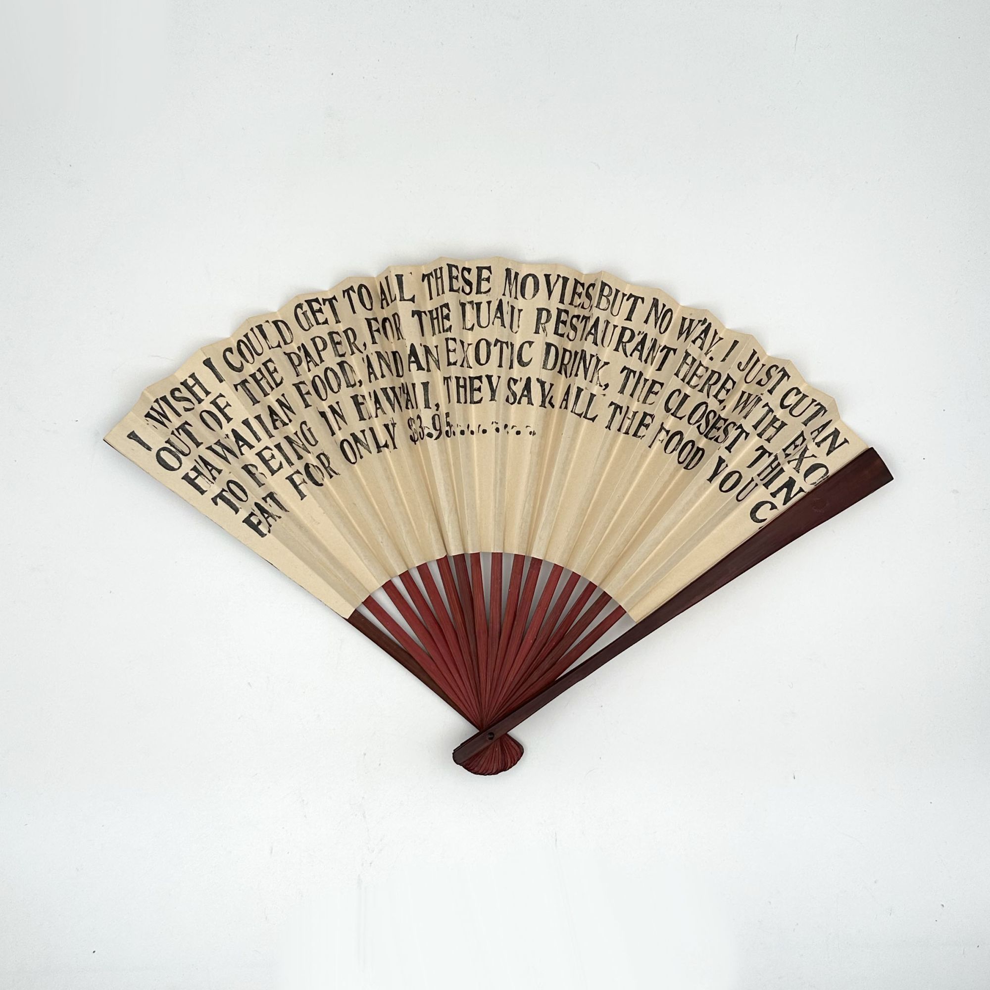 1975. First edition, signed by the artist on the title page in 1985. 8 folded sheets, loose, each rubber stamped, with glitter, and one sheet stenciled and hand-cut (Aloha Evelyn). 4to (11 1/2 x 7 3/4 inch sheets, as folded; 10 x 16 in fan), laid-into 12 x 9 1/4 inch. pouch. Fine, in canvas bag. First edition, signed by the artist on the title page in 1985. 8 folded sheets, loose, each rubber stamped, with glitter, and one sheet stenciled and hand-cut (Aloha Evelyn). 4to (11 1/2 x 7 3/4 inch sheets, as folded; 10 x 16 in fan), laid-into 12 x 9 1/4 inch. pouch. The first iteration in a series of art works in which Benes used fragments from letters from his aunt to narrate artists books and collages, lending to the works a dry, humorous, commentary on the humble aspirations of Americana. This work largely treats his aunt's rambling about Hawaii. The pages are stamped with fragments about travel, planes and seashells covered in glitter, and the folded fan is printed with the text: "I wish I could get to all these movies, but no way. I just cut an ad out of the paper, for the Luau Restaurant here with exotic Hawaiian food, and an exotic drink, the closest thing to being in Hawaii, they say, all the food you can eat for only $3.95........"
