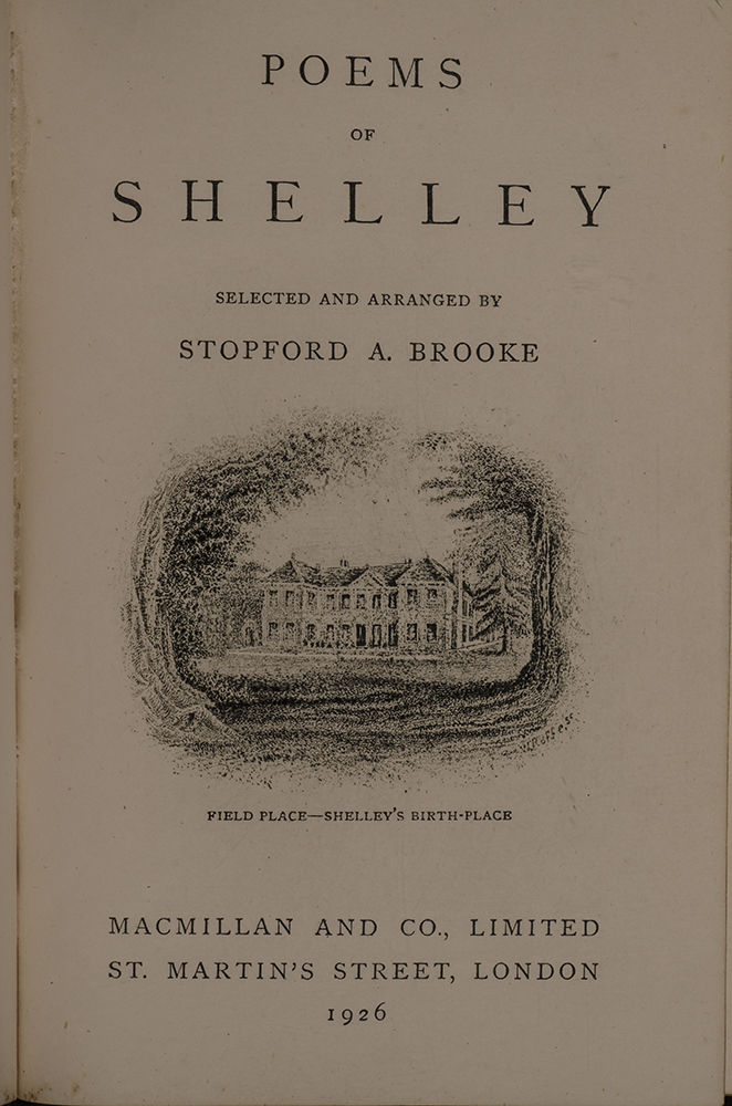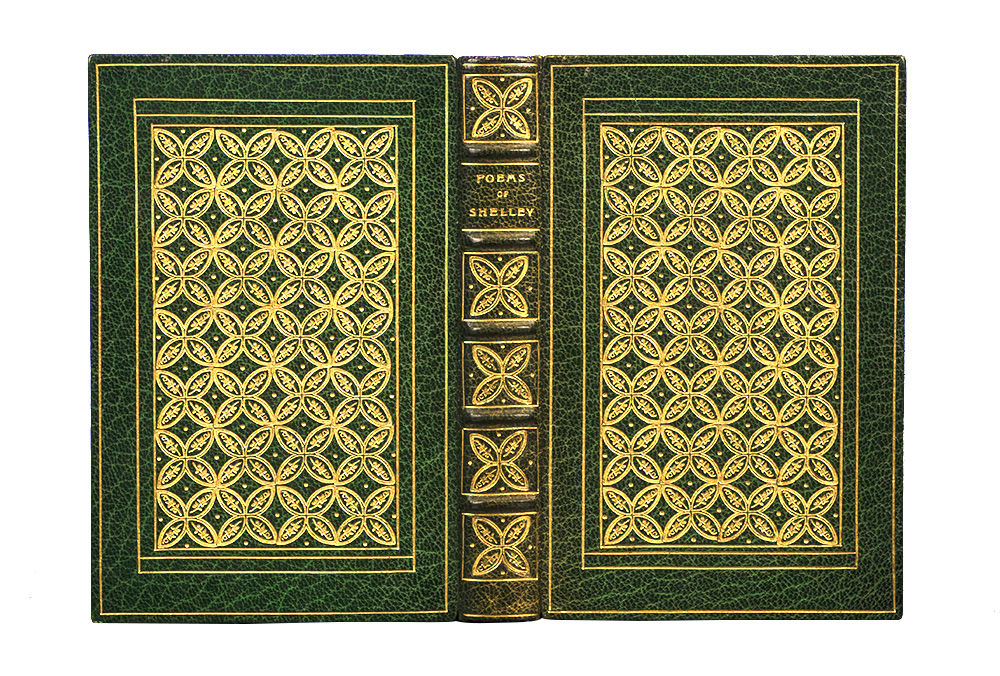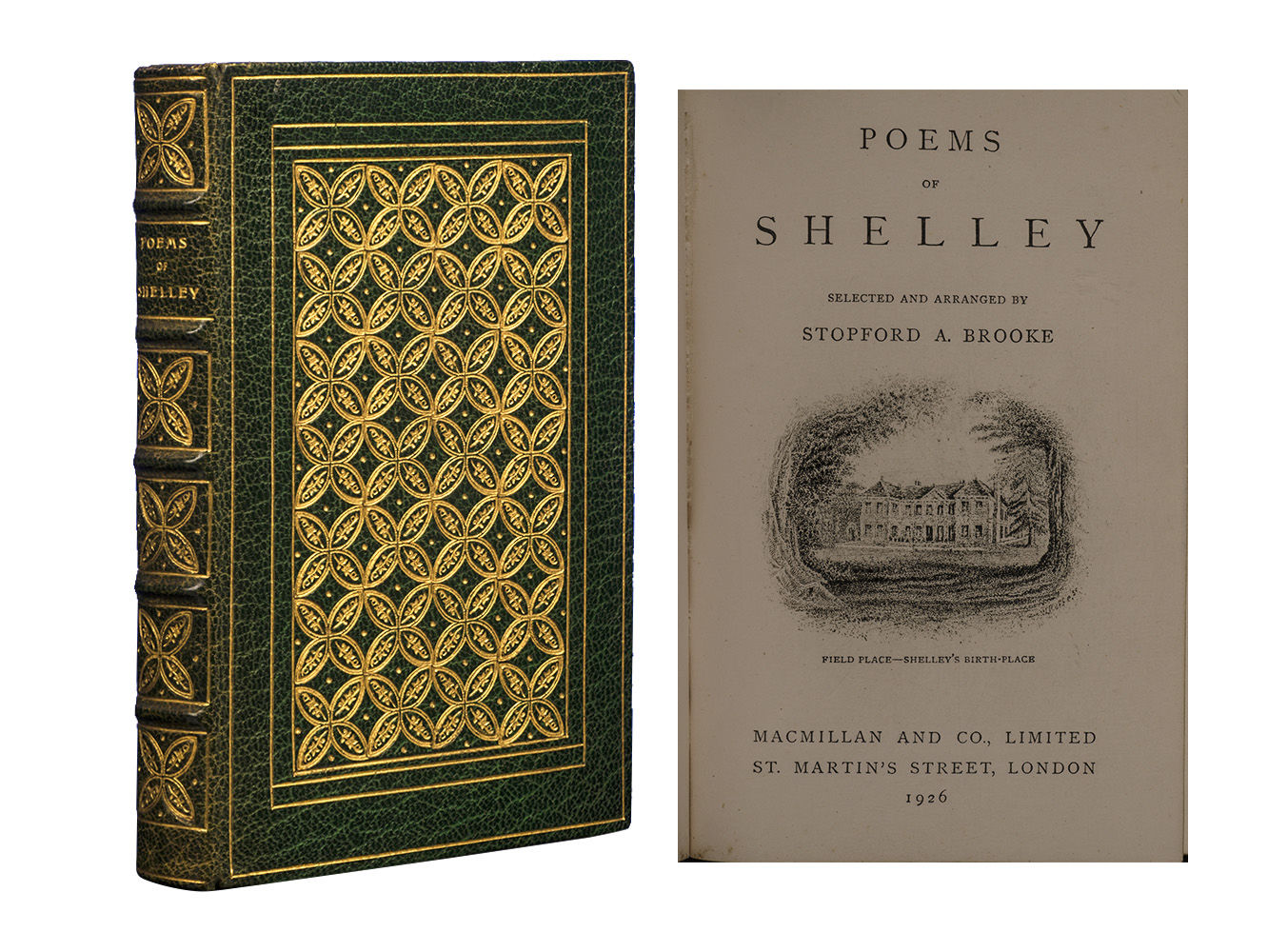 London: Macmillan, 1926. Golden Treasury series. Fine. A Fine copy. Sixteenmo (5 13/16 x 3 7/8 inches; 148 x 97 mm.). lxvi, [2], 340 pp. Title-page with vignette of Field Place - Shelley's birth place. Neat early ink presentation (dated 1927) on front blank. Beautifully bound ca. 1926 by Ramage of London (stamp-signed in gilt on lower turn-in). Full green crushed levant morocco, covers paneled in gilt surrounding a very intricate design in gilt, spine with five raised bands, decoratively stamped and lettered in gilt in compartments, gilt board-edges, wide decorative gilt turn-ins, cream watered silk liners and end-leaves, all edges gilt. A superb example of a later Ramage binding.