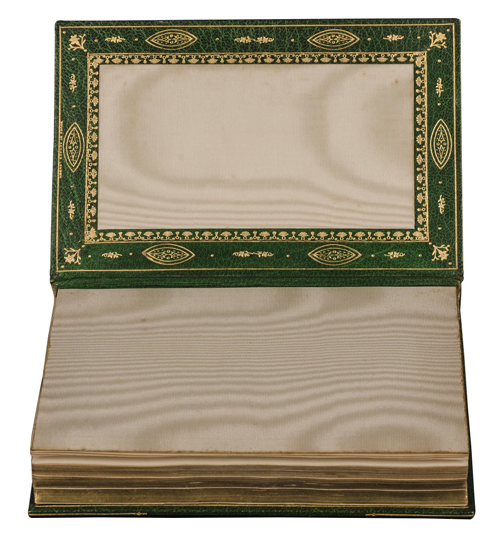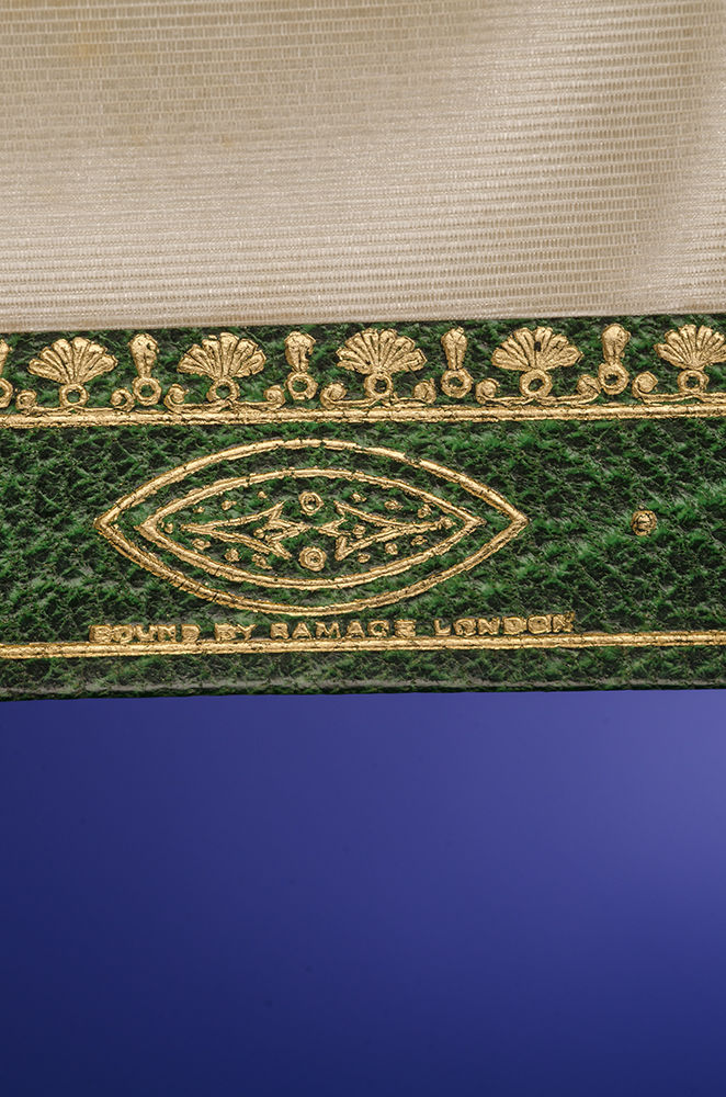 The London-based bindery, John Ramage and Company helped “restore the fine hand-craft of bookbinding, in an era when that process was increasingly mechanized” (Morgan Library). John Ramage (1836–1911) apprenticed with both English and French binders before buying his first binder business in Edinburgh 1860. He opened a London bindery three years later (Gertz). “Though the range of their designs is broad, Ramage bindings are celebrated for their remarkably delicate, careful, and elaborate gilt work” (Gertz). Fine.