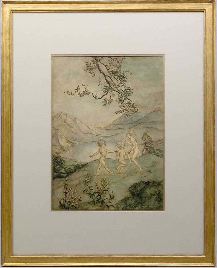 Nathaniel Hawthorne’s A Wonder Book was a frame story that retold ancient myths for children, in hopes of educating and inspiring them with classical tales adapted from Greek myths featuring "The Gorgon's Head," "The Three Golden Apples," and "The Chimaera," as well as Hawthorne's version of King Midas, "The Golden Touch." First published in the mid-nineteenth century, the 1922 edition illustrated by Rackham truly brought the text to life. This charming watercolor made for one of the book's illustrations depicts life as it was before Pandora opened the box— a wonderfully gentle pastoral scene, with a group of three children dancing merrily, without a care in the world, with “the expanding blossoms of that night’s supper” hanging heavily on the tree above their heads and “the tender bud of tomorrow’s breakfast” growing on the plants in the foreground. A superb original drawing, this watercolor with its subtle colors and artful lines highlights Rackham's talents.