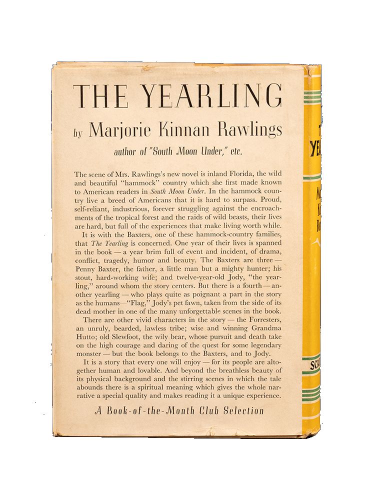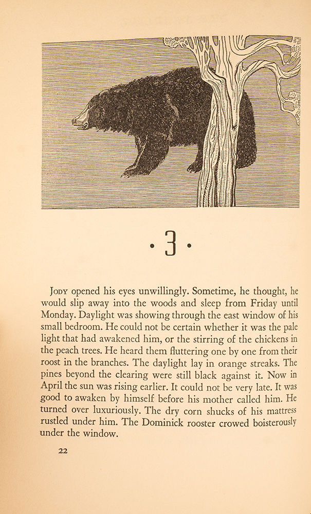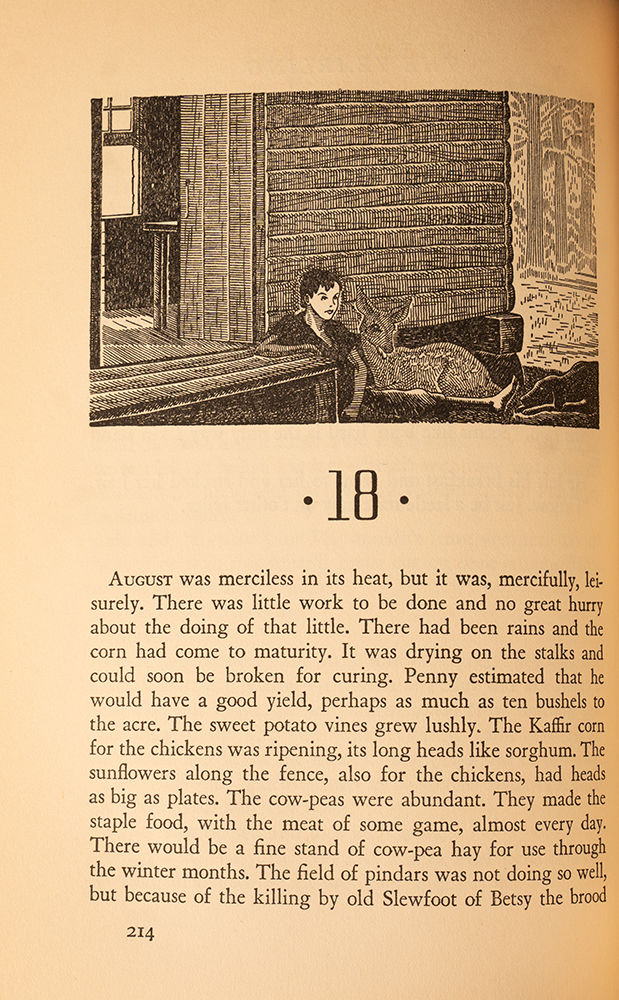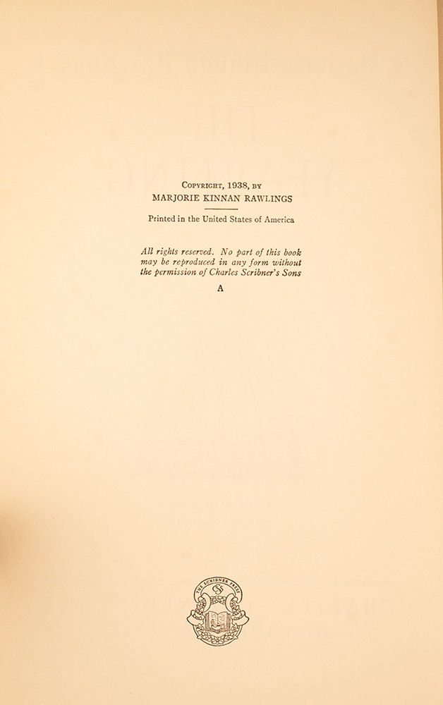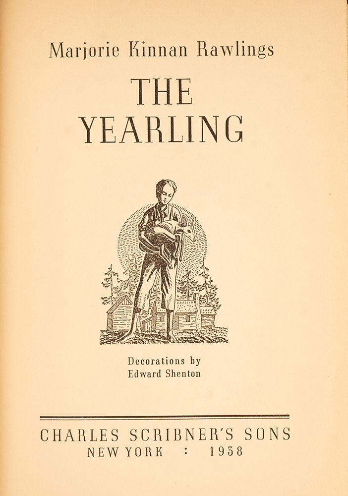 Marjorie Kinnan Rawlings' beloved 1938 novel, set in rural Florida. The Yearling follows the story of Jody Baxter, a child who becomes friends with a fawn after his father kills the fawn’s mother. The book was the best selling novel the year it was released and would win the Pulitzer Prize. Translated into over twenty languages, The Yearling was also adapted into a 1946 film starring Gregory Peck and Jane Wyman, who would both receive Academy Award nominations for their performances. “The thing about The Yearling, its great claim to distinction, is that it is able to make so much of simple, homely events” (Contemporary New York Times review). Illustrations were completed by artist, author, and educator Edward Shenton (1895-1977). Fine in Near Fine dust jacket.