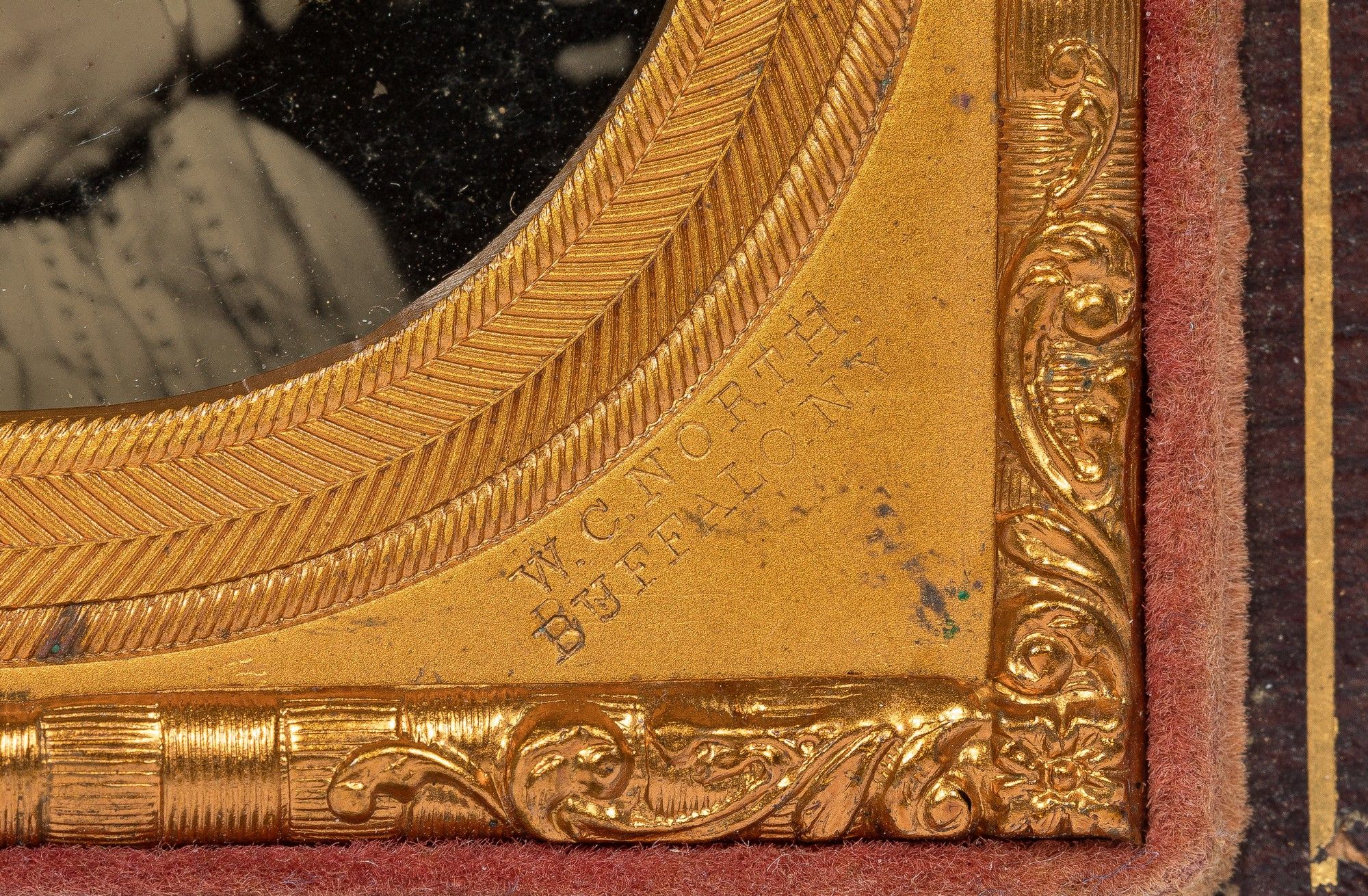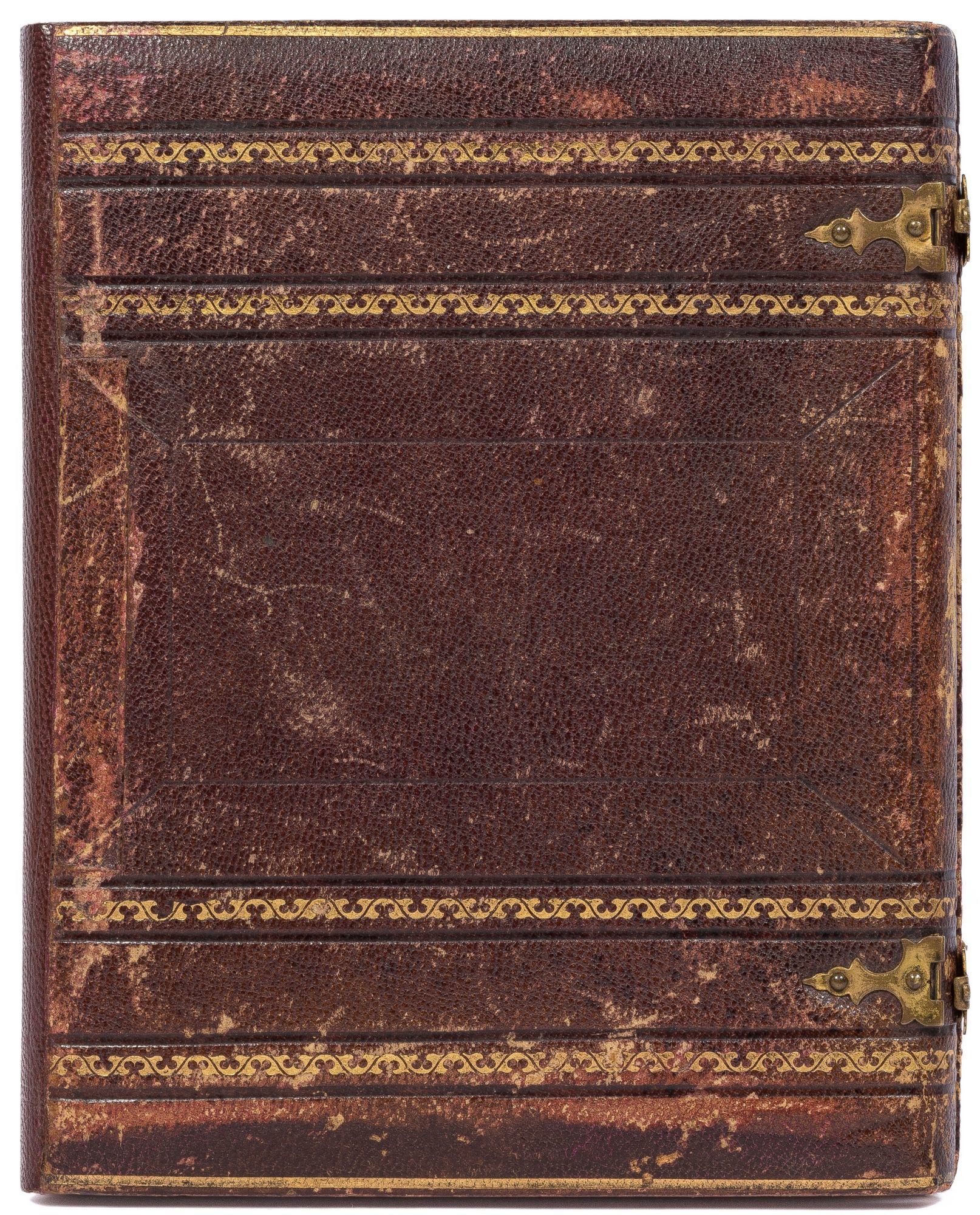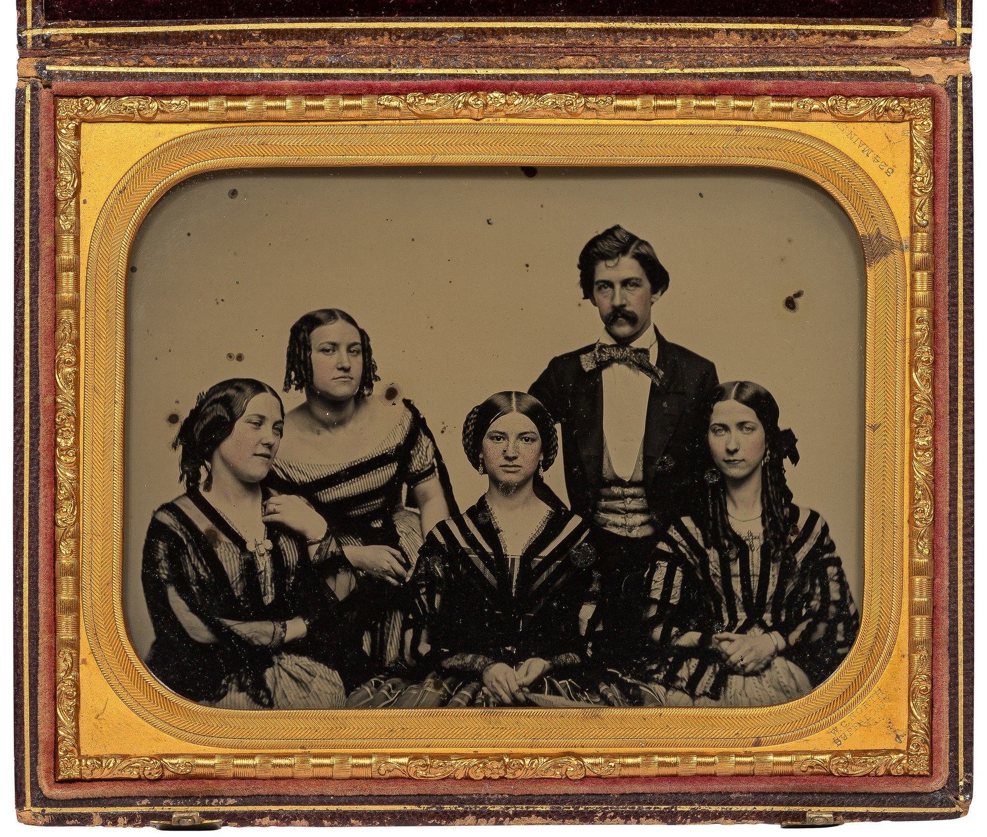 Buffalo: W. C. North, 1859. Hardcover. Near Fine. Half plate ambrotype. Matted with preserver in original embossed leather case with purple velvet pad inside the front cover. Image size approximately 4.25" x 5.5". Professionally cleaned and resealed. A few spots of tarnish but otherwise clear and near fine. In a leather case stamped in gilt and blind with metal clasps. Spine of the case has been professionally rebacked and is a bit rubbed but very good. A portrait of four seated young women who are similarly, or perhaps uniformly, dressed in striped outfits, and a single standing young man with a suit with a vest which seems to similarly match the women's dresses. No obvious evidence of the identities of the five, but anecdotally we are told the old seal was labeled "Appalachian Singers", and the close-to-uniform outfits on the group suggests a group of performers.