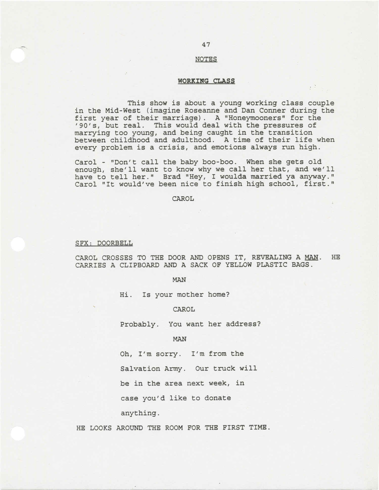 The never-produced sitcom followed a teenage working-class couple struggling to make ends meet and support their young daughter. Screenwriter Stephen Sustarsic wrote frequently for sitcom television throughout the 1980s and 1990s, most memorably for the television series "Alice" (1976-1985) and "The Jeffersons" (1975-1985). Sustarsic was also one of the creators of the children's animated series "The Wild Thornberrys" (1998-2004).