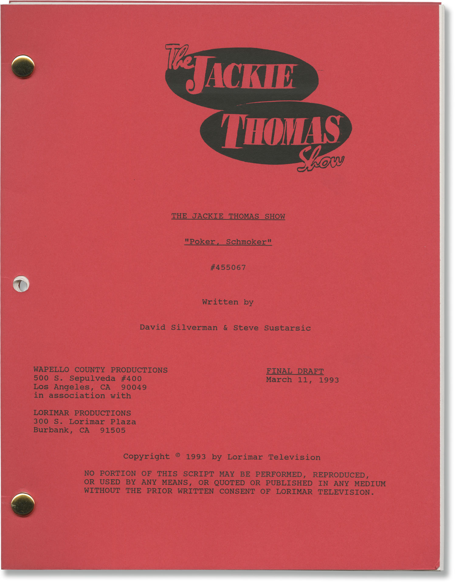 Red titled wrappers, noted as FINAL DRAFT on the front wrapper, with production No. 455067, dated March 11, 1993, with credits for screenwriters David Silverman and Steve Sustarsic. Title page integral with front wrapper. 50 leaves, with last page of text numbered 48. Xerographic duplication, rectos only. Pages Near Fine, wrapper Near Fine, bound with two gold brads.