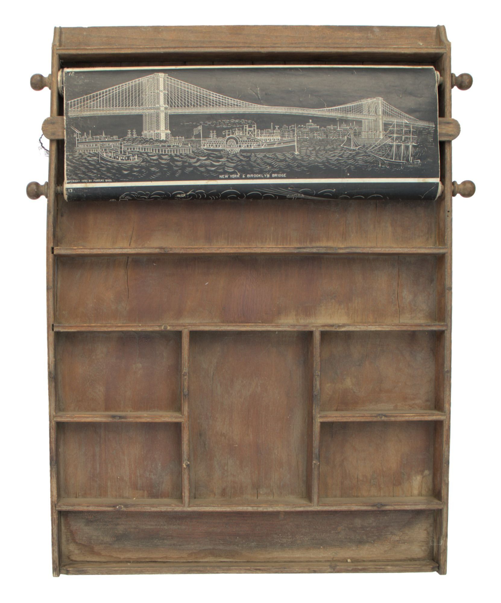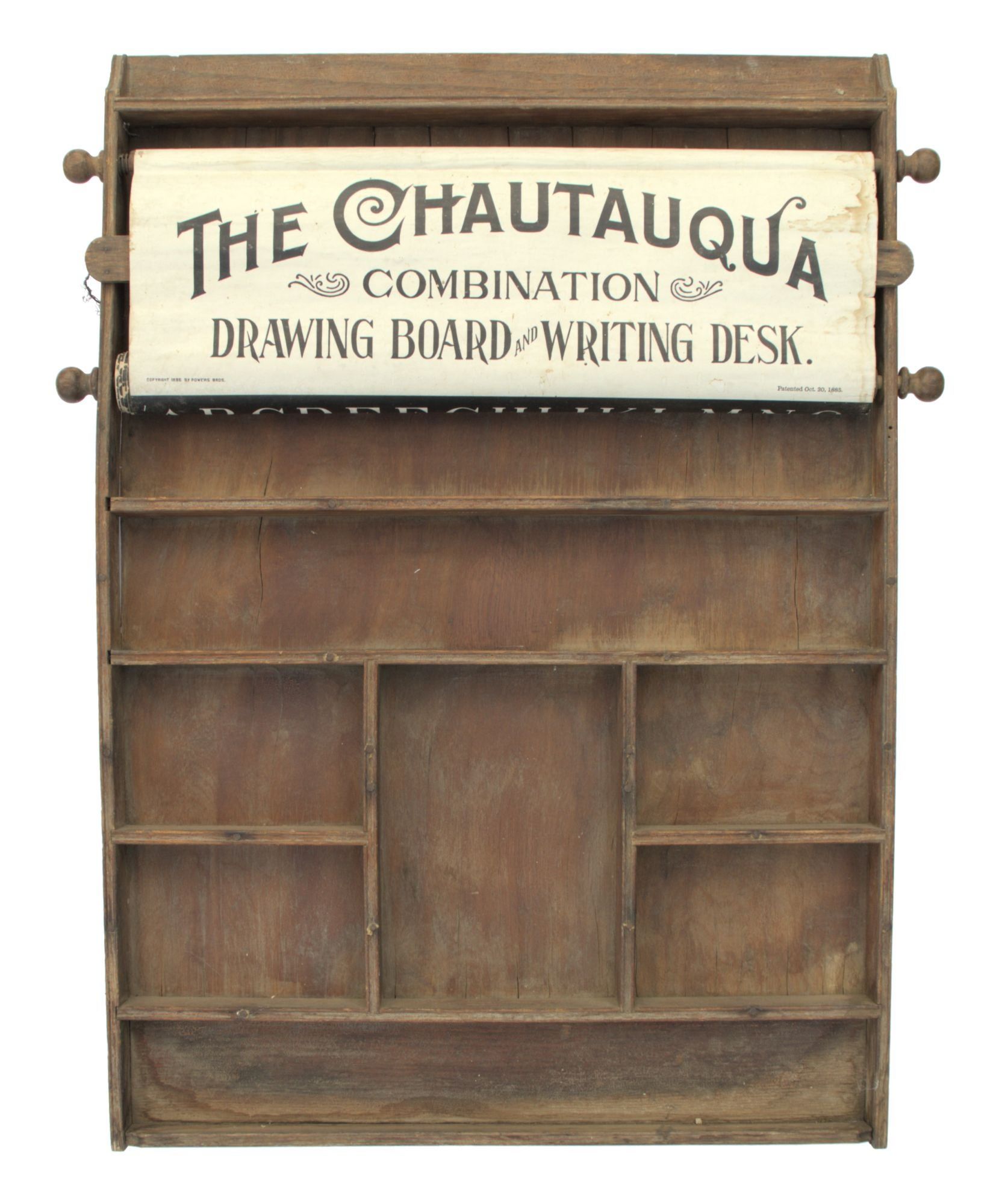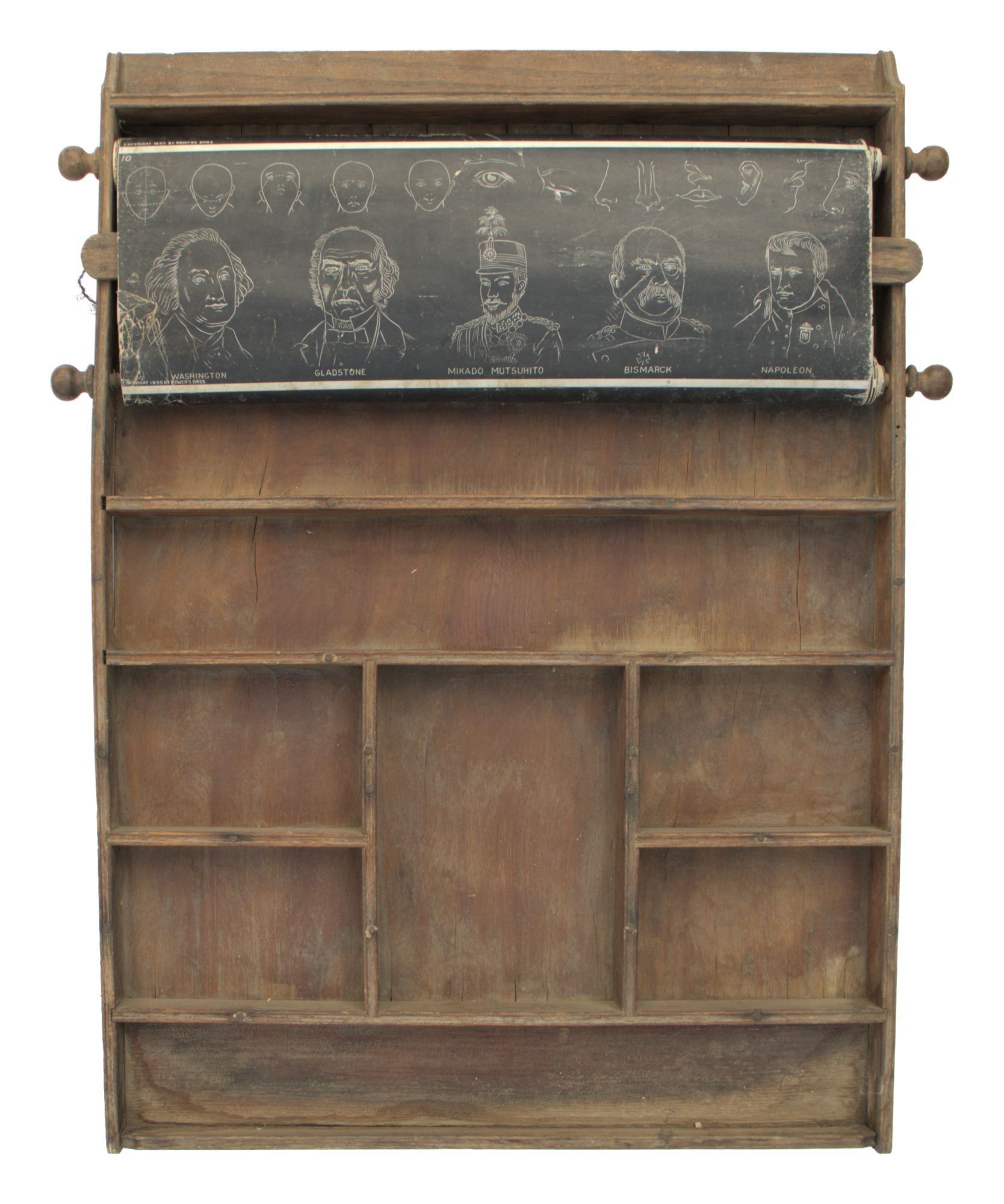 N.p.: Powers Bros, 1895. Very Good -. N.p.: Powers Bros., 1895. Original wooden educational wall fixture (ca. 74x52cm.); complete with spinning scroll in twenty-three frames, each measuring ca. 17x48cm (or ca. 391x48cm. if completely unfurled); the first thirteen frames are printed in negative white over black, the following five are black on a white background, the final five are printed in color on a white background. Below the scroll are eight small compartments of varying sizes for holding chalk, pens and pencils (not present here).