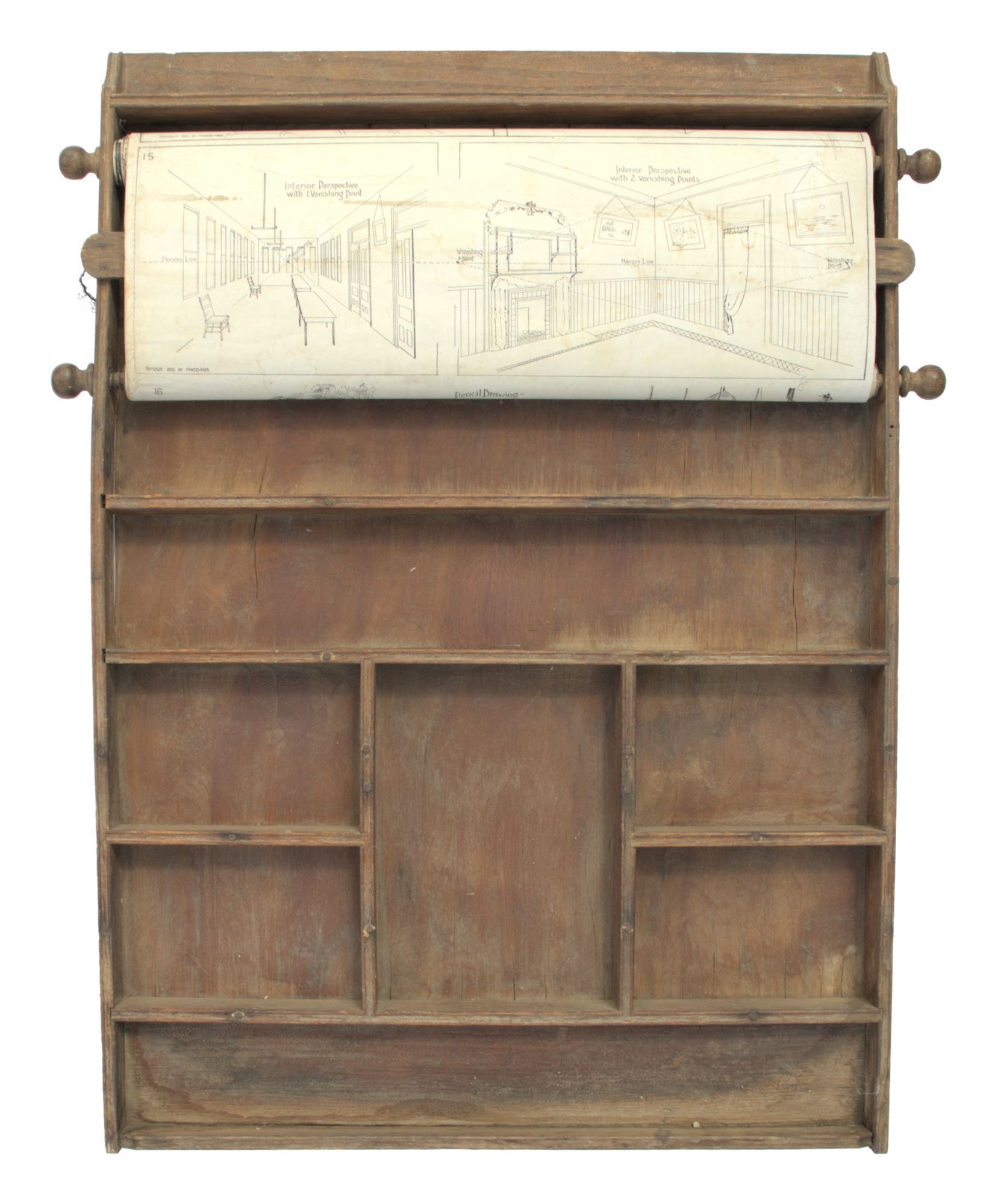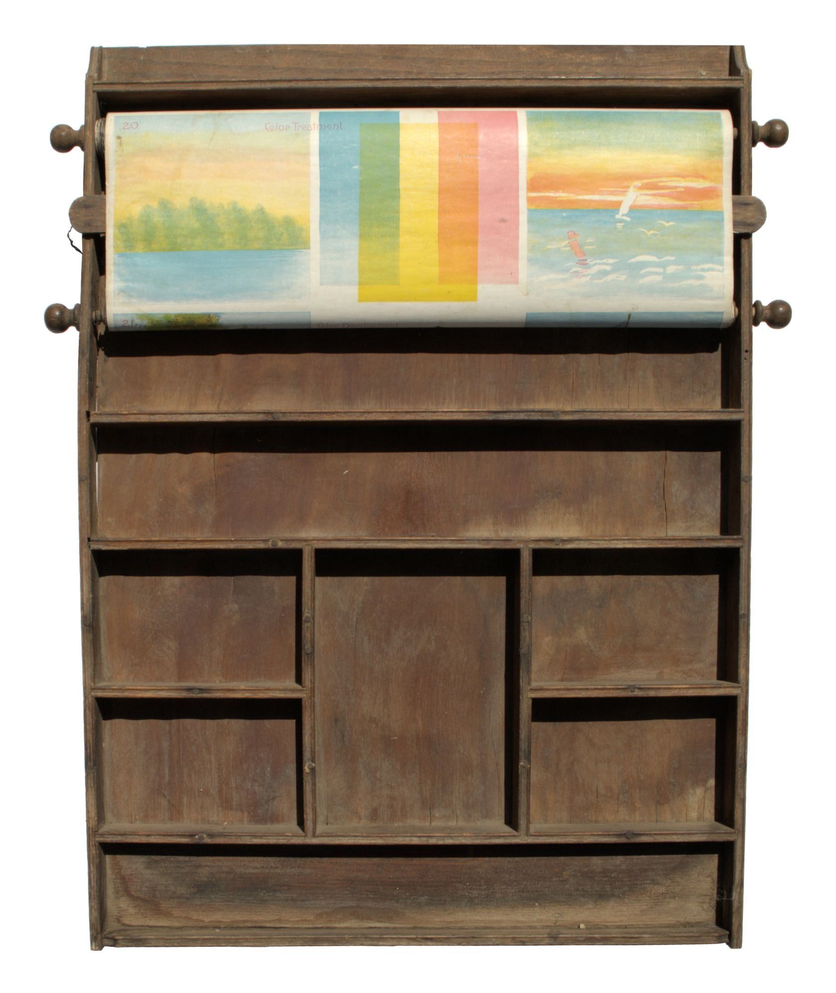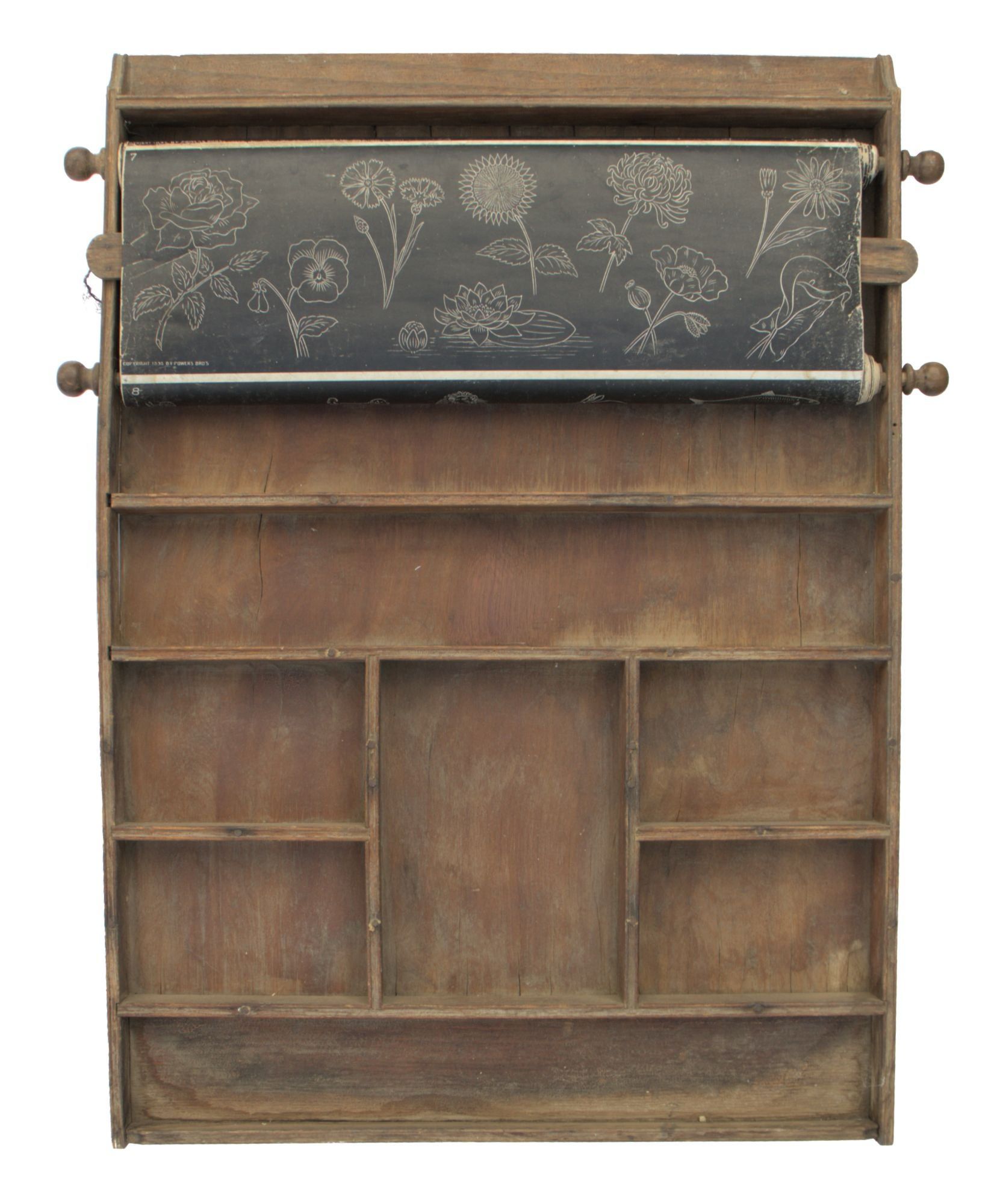 N.p.: Powers Bros, 1895. Very Good -. N.p.: Powers Bros., 1895. Original wooden educational wall fixture (ca. 74x52cm.); complete with spinning scroll in twenty-three frames, each measuring ca. 17x48cm (or ca. 391x48cm. if completely unfurled); the first thirteen frames are printed in negative white over black, the following five are black on a white background, the final five are printed in color on a white background. Below the scroll are eight small compartments of varying sizes for holding chalk, pens and pencils (not present here).