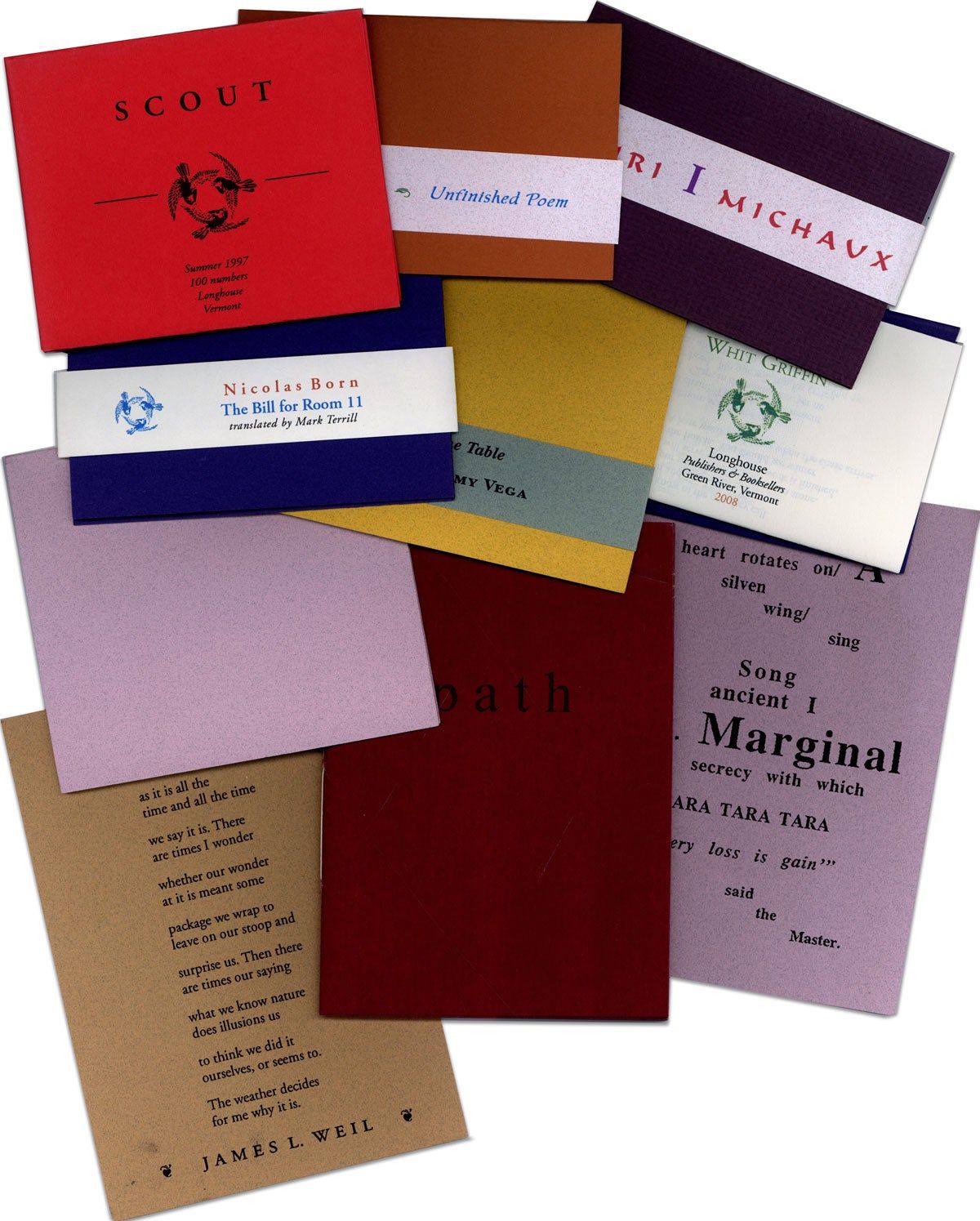 Green River, VT: Longhouse, 1997-2008. First Edition. Seven poetry chapbooks, two postcards and one anthology (single sheet, folded). Ten items from Bob and Susan Arnold's press; all small 16mo - 24mo. books, mostly single sheets folded into covers, some (Pommy Vega, Berge Born, Michaux/Levi) with bands; postcards by Weil and Landes-Levi; Scout a magazine summmer 1997 (100 printed) with poems by John Perlman, James Weil and others. The Weil postcard soiled, all else near fine or better.