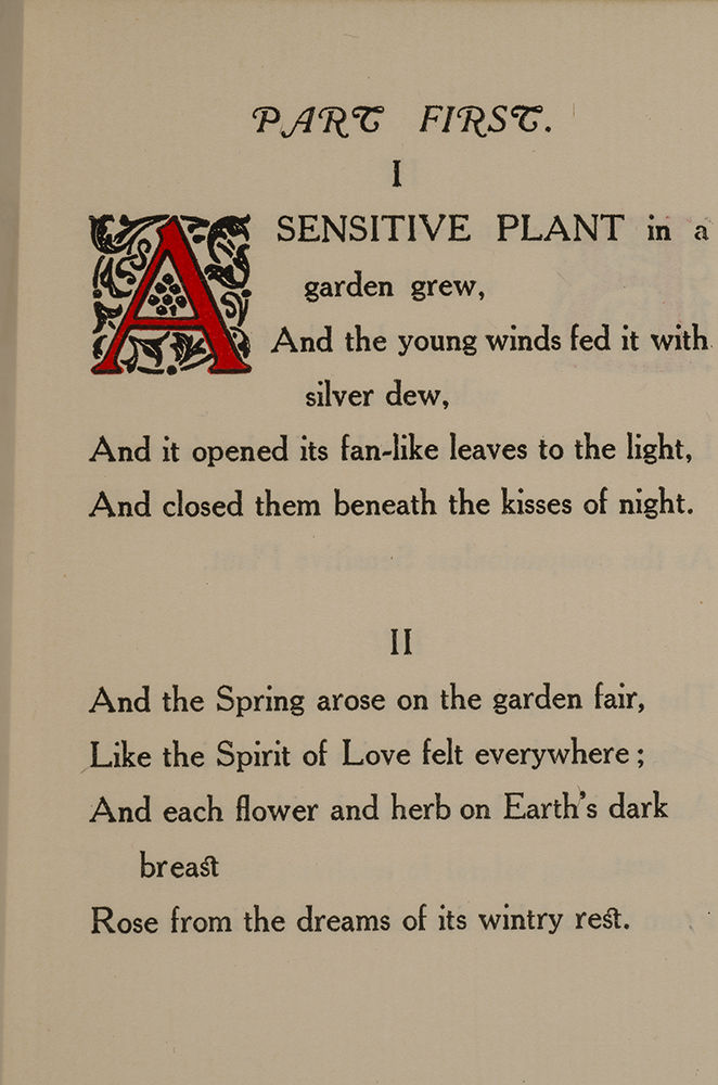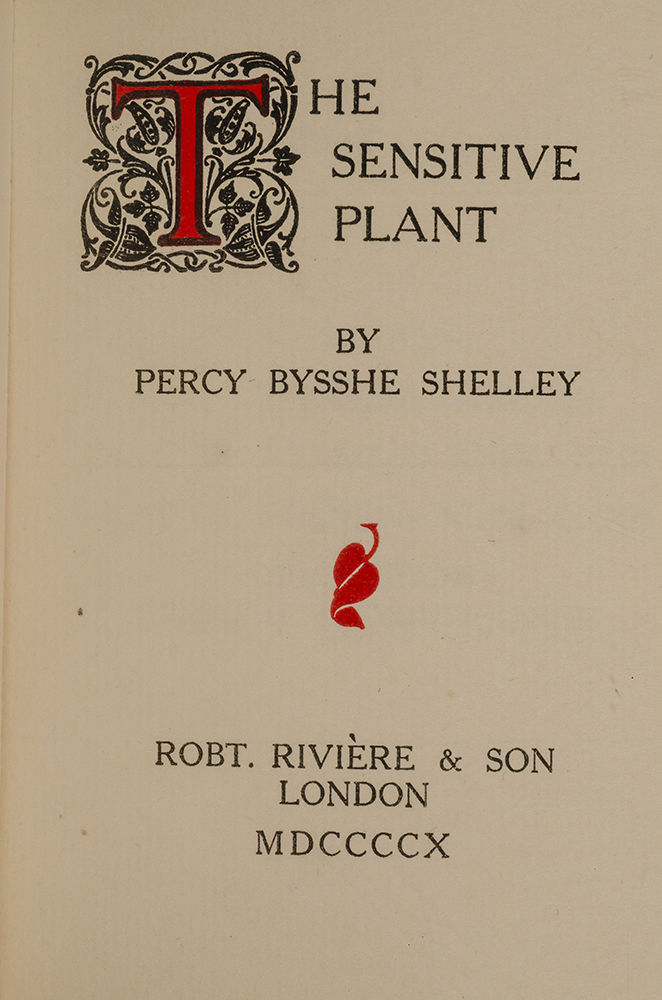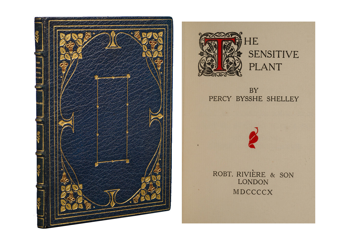 Shelley’s poem, The Sensitive Plant, is a beautiful and tragic poem commemorating the brevity of life and immortality of cyclical nature. Written after death of his son, while Percy and Mary Shelley struggled with their grief in Pisa, the poem consists of four stanzas with three sections charting the change of seasons. It is set in a garden bursting with blooms, but highlights the sensitive plant—a mimosa—with its humble leafy foliage. Human will is nothing in the face of the impartial power of nature and time. First published in Prometheus Unbound and Other Poems (1820), here it has been reproduced with a delicate binding to match its subject.