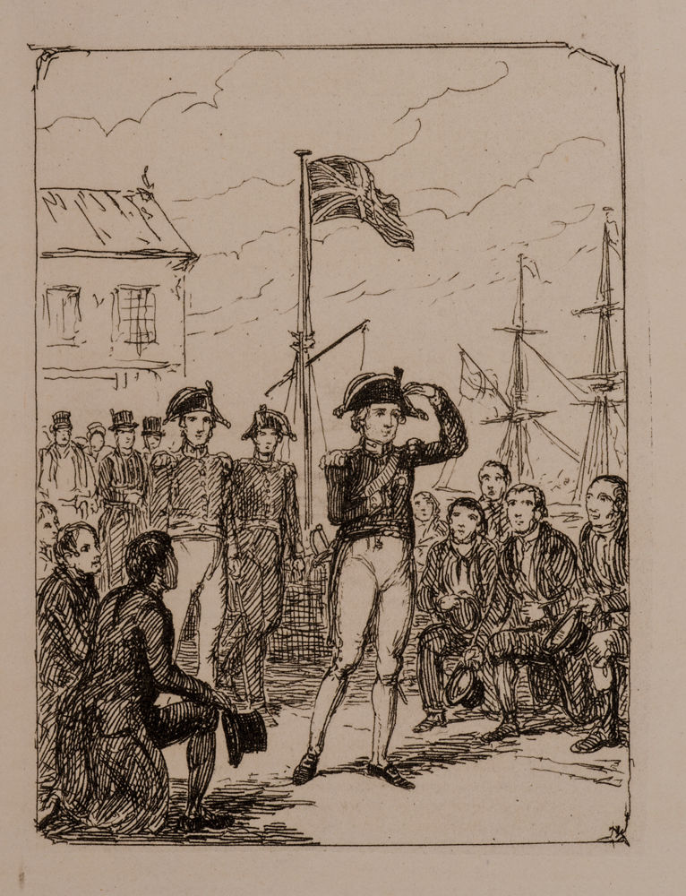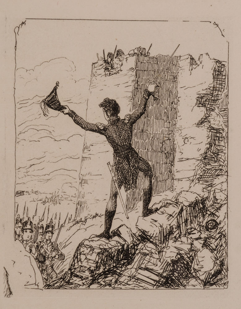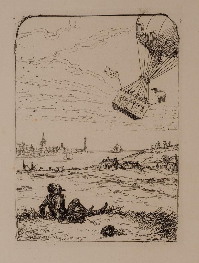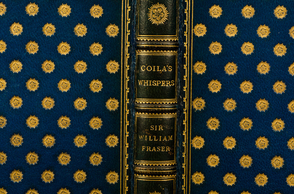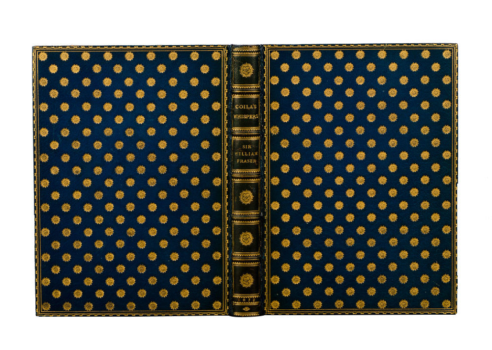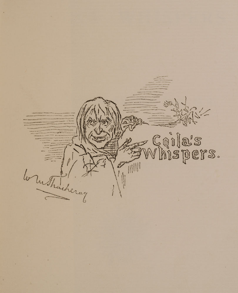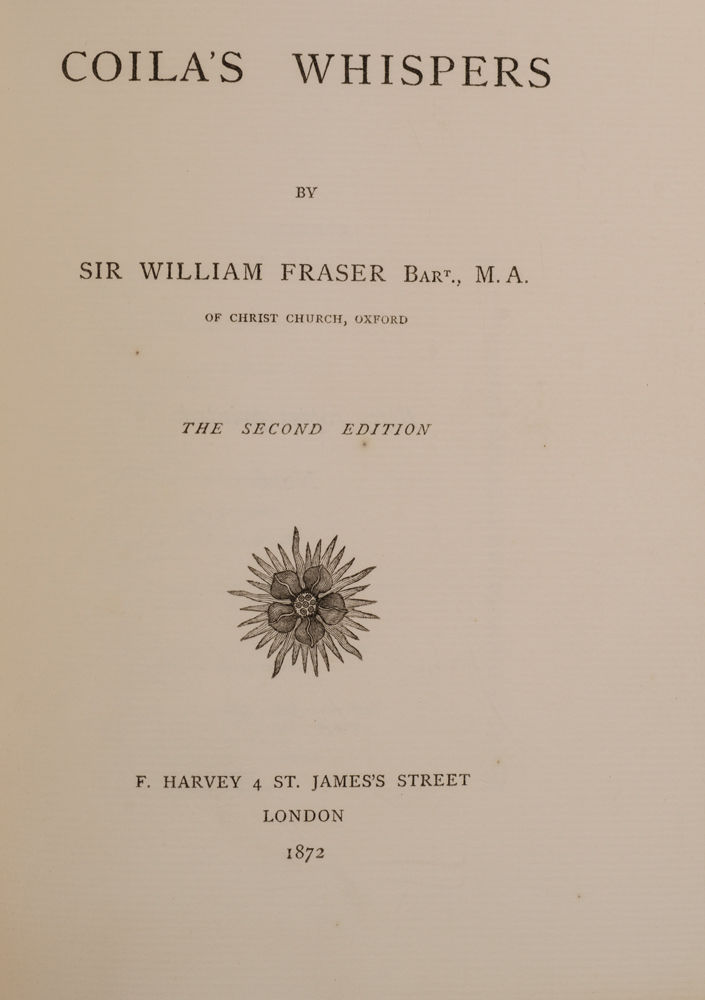 "Sir William Fraser (1816-1898) was a genealogist, archivist, and Scottish historian. Trained as a solicitor, his professional involvement with peerage cases began a lifetime of research into the genealogy of Scotland’s most prominent landed families" (Edinburgh University Library). His Colia's Whispers is a collection of poetry inflected by Victorian tastes for historicism and revivalist styles. The text is accompanied by five George Cruikshank etching on India paper, are five out of eight compartments of a large plate etched by G.C. for Sir William Fraser, in 1870, for Poems by the Knight of Morar. "Only fifty numbered copies were issued of this edition, and consequently it is scarce" (Cohn). George Cruikshank (1792-1878) was one of the most famous British caricaturists and illustrators during the Regency period. He would form a friendship with Charles Dickens, illustrating many of his books, and later in life would be active in the temperance movement.