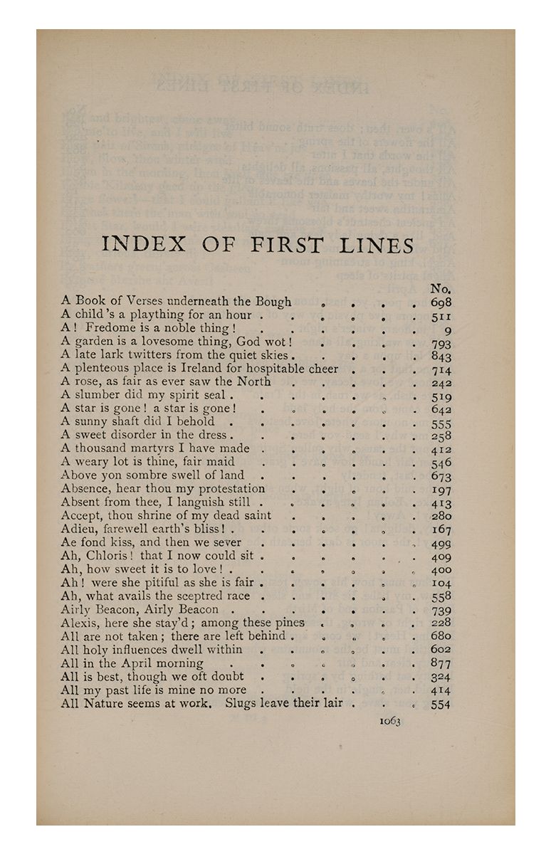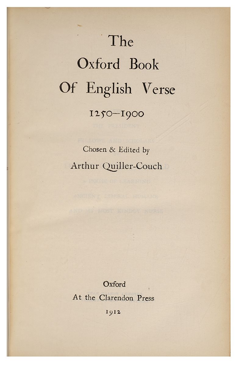 How does one honor the expansive history poetic output in the English language? That appears to be the motivating question behind the famous poetry anthology The Oxford Book of English Verse, 1250–1900. Compiled and edited by the novelist Arthur Thomas Quiller-Couch (1863-1944), also called Q, this epic collection would go on to be a turn-of-the-century best-seller (almost 500,000 copies of the first edition). A temple of poetry, this volume includes all of the greats and some hidden lyrical treasures.