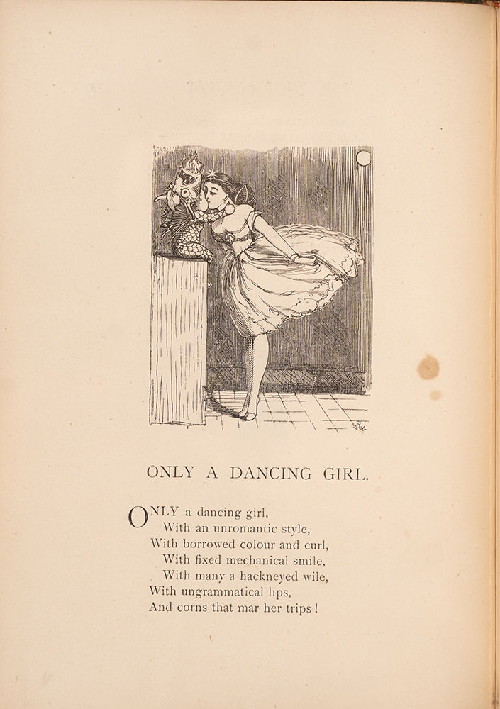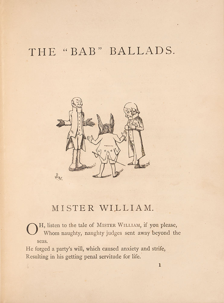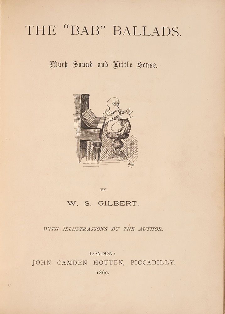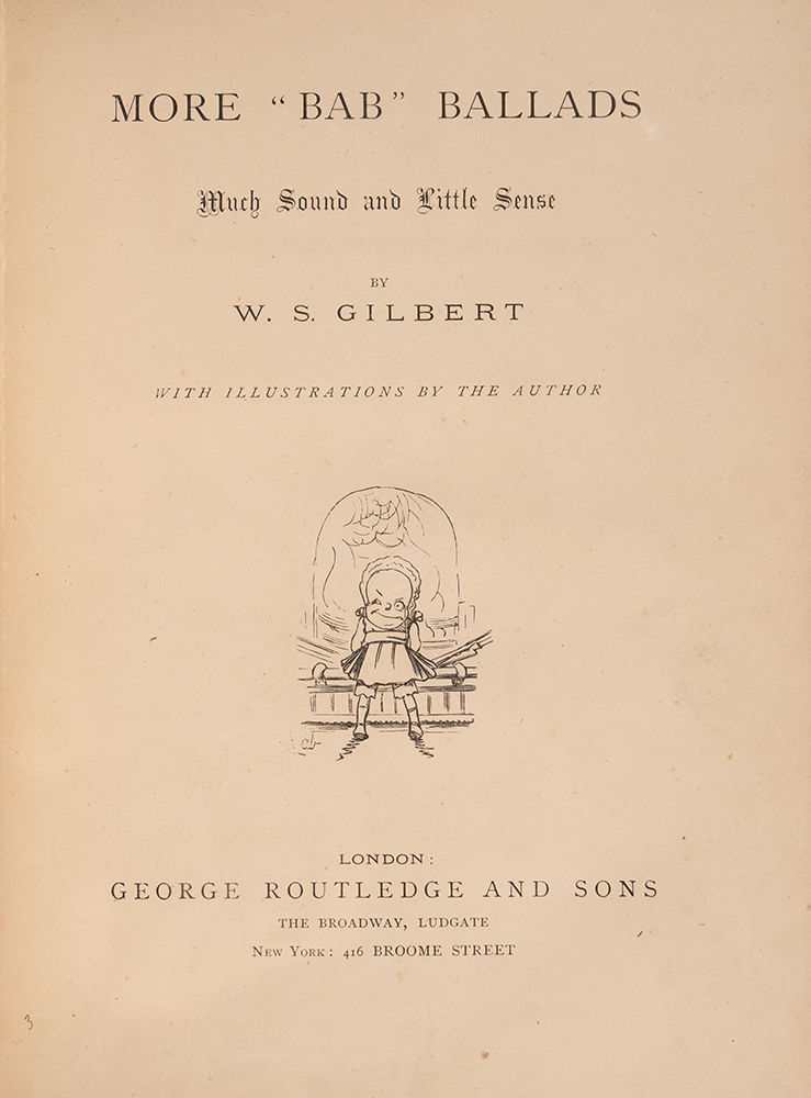 This publication evidences how a writer’s work is never done. First published as a humorous column in Fun magazine, in 1876, Gilbert collected fifty of his favorite poems for the book Fifty “Bab” Ballads:Much Sound and Little Sense, it contained one poem collected for the first time (titled "Etiquette") and excluded 25 previously published poems. As Gilbert explained: “The period during which they were written extended over some three or four years; many, however, were composed hastily, and under the discomforting necessity of having to turn out a quantity of lively verse by a certain day in every week. As it seemed to me (and to others) that the volumes were disfigured by the presence of these hastily written impostors, I thought it better to withdraw from both volumes such Ballads as seemed to show evidence of carelessness or undue haste, and to publish the remainder in the compact form under which they are now presented to the reader” (Gilbert). However, “Gilbert's readers were not happy with the loss, and in 1882 Gilbert published all of the poems that had appeared in either The “Bab” Ballads or More “Bab” Ballads, once again excluding "Etiquette." Some twentieth-century editions of More “Bab” Ballads include "Etiquette"” (Ellis). The poems range from satire to absurdist texts and will surely entertain all who read them.