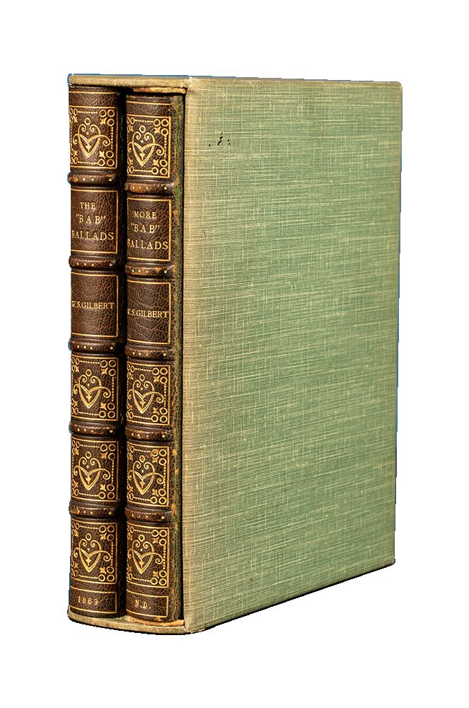 London: John Camden Hotten [and] George Routledge and Sons, 1872. First editions. Two octavo volumes (7 1/4 x 5 1/4 inches; 184 x 133 mm. [&] 7 x 5 3/8 inches; 179 x 137 mm.). ix, [2], 14-222, [4, adv.]; viii, [1], 14-224, [4. adv.] pp. Black and white frontispieces with original tissue guards, black and white text illustrations throughout. Bound c. 1920 by Rivière & Son for the Gardenside Bookshop, Boston in full emerald crushed levant morocco with a gilt decorated broad inlaid border of maroon morocco, enclosing an elaborate gilt frame surrounding a maroon morocco border and decorated sunken central panel within which are figures from the text pictorially depicted with multi-colored, padded morocco onlays. The Bab Ballads with the onlaid figures of Babette and Jacot (page 67) and More Bab Ballads with the onlaid figures of Sir Berkely and William Lee (page 122). Lower boards with gilt ruled maroon morocco border, surrounding an elaborate gilt border with decorative gilt corner pieces. Spines with five raised bands, decoratively tooled and lettered in gilt in compartments, gilt ruled board edges, elaborate gilt turn-ins, cream watered silk liners and end-leaves, all edges gilt. Original gilt decorated green cloth covers bound in at end of each volume. Outer front joint of volume 2 with subtle repairs. Housed together in the original felt-lined, green cloth slipcase. A fine set.