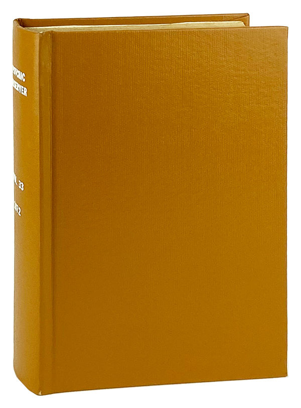 Washington, DC: Psychic Observer, ESPress, Inc, 1972. Very Good. Washington, DC: Psychic Observer, ESPress, Inc., 1972. First Editions. Octavo (21.5cm). Seven consecutive issues with original wraps, bound together in tan cloth with white stamping to spine. Black and white illustrations. Ex-library with internal institutional stamps and markings to endpapers; stamps to covers of each issue. Issues perhaps slightly and uniformly trimmed, with no loss to text. Light shelfwear and a few stray pen marks and smudges to boards. Binding sound. Foxing to top edge and, aside from aforementioned institutional markings and stamps, interior unmarked and text legible throughout. A Very Good collection of this Spiritualist magazine, originally founded in 1937 and launched again in 1969 after a three-year hiatus.