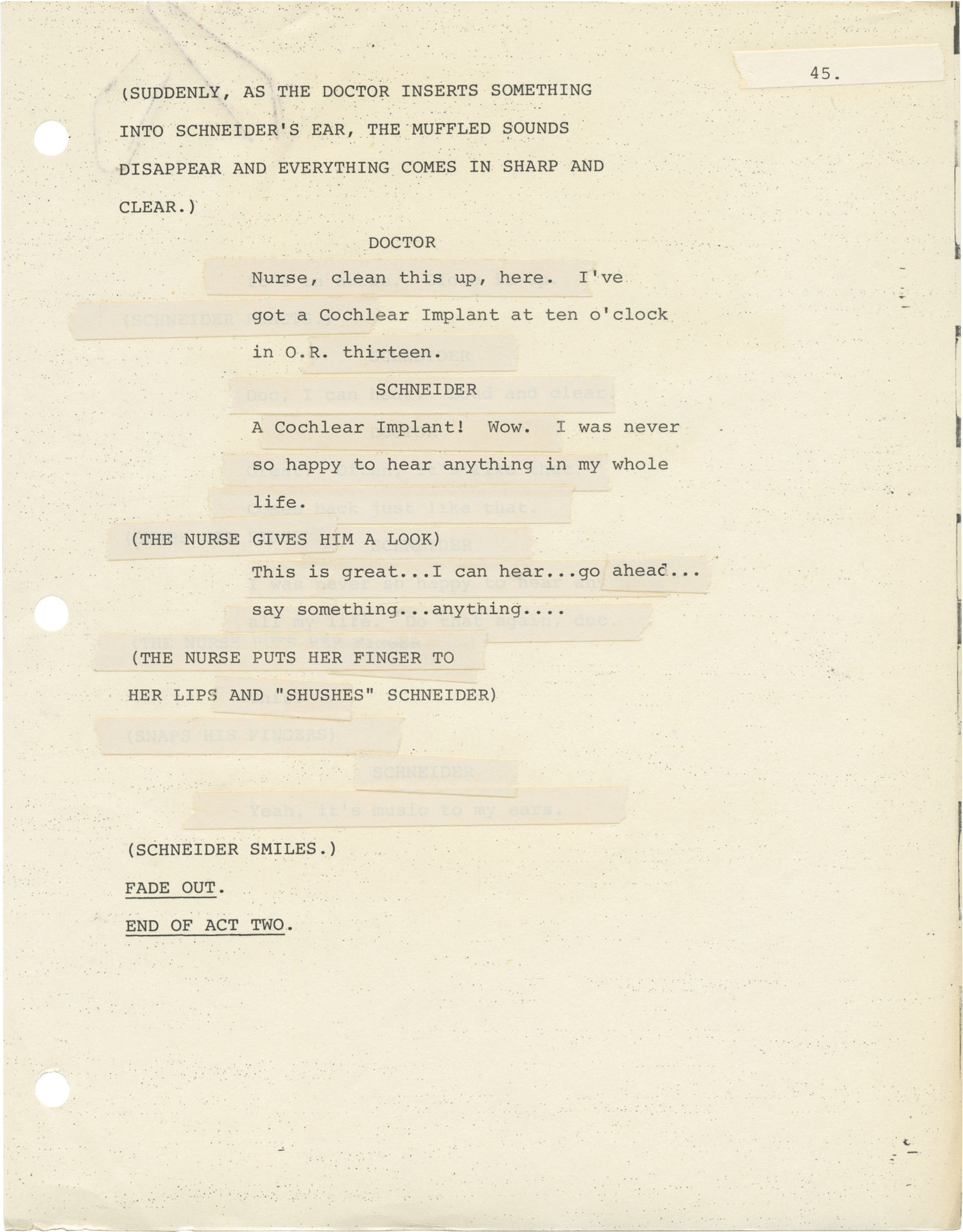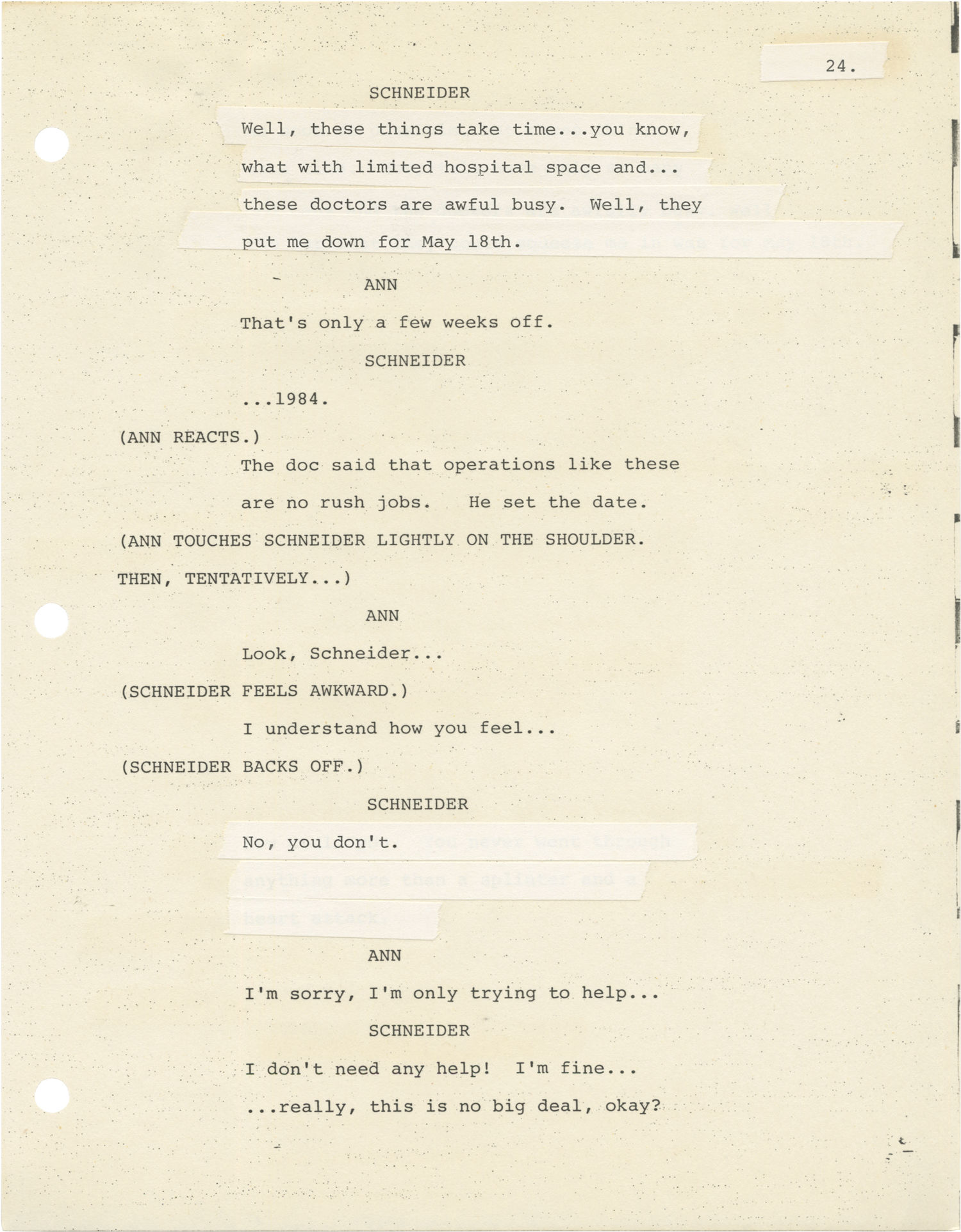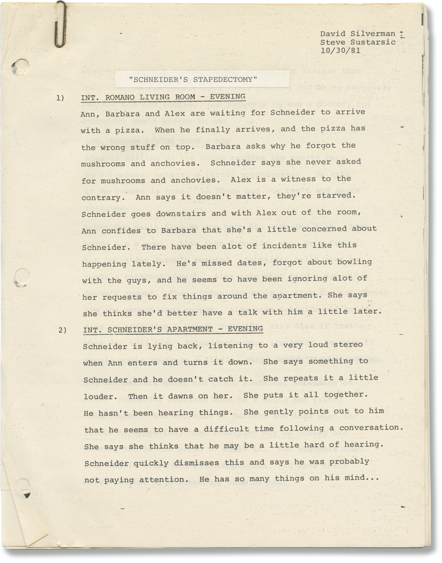 N.p.: N.p., 1981. Two scripts for Season 7 Episode 24 of the 1975-1984 television series, here under the working title "Schneider's Stapedectomy." Includes one treatment script and one First Draft, both with typeovers and tipped-in text throughout.