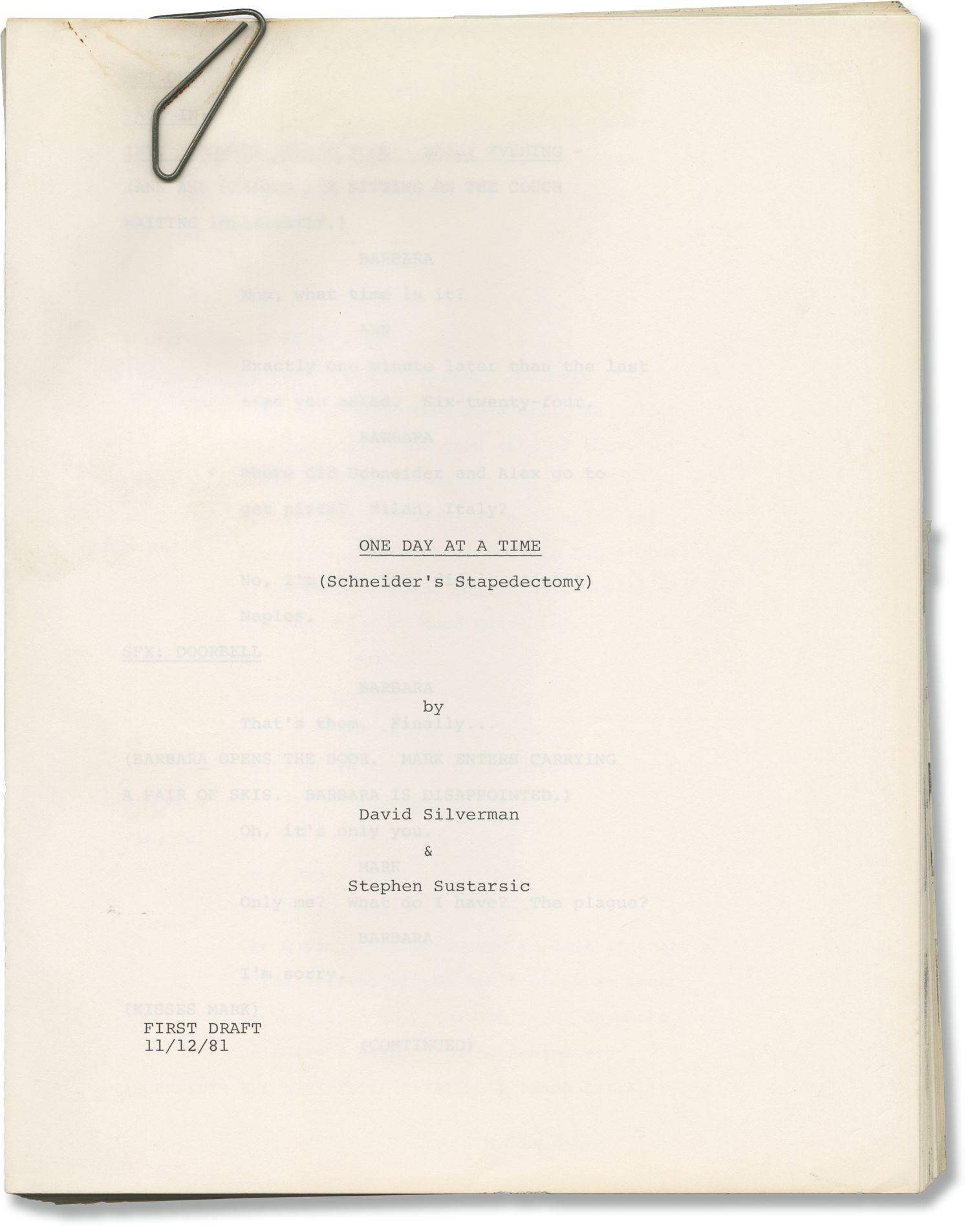 Self wrappers, dated 11/12/81 on the front wrapper, noted as FIRST DRAFT, with credits for Silverman and Sustarsic. Title page integral with the front wrapper. 51 leaves, with last page of text numbered 45. Xerographic duplication, rectos only. Pages Very Good plus, wrapper Very Good plus, partially bound with a paper clip at the top left corner.
