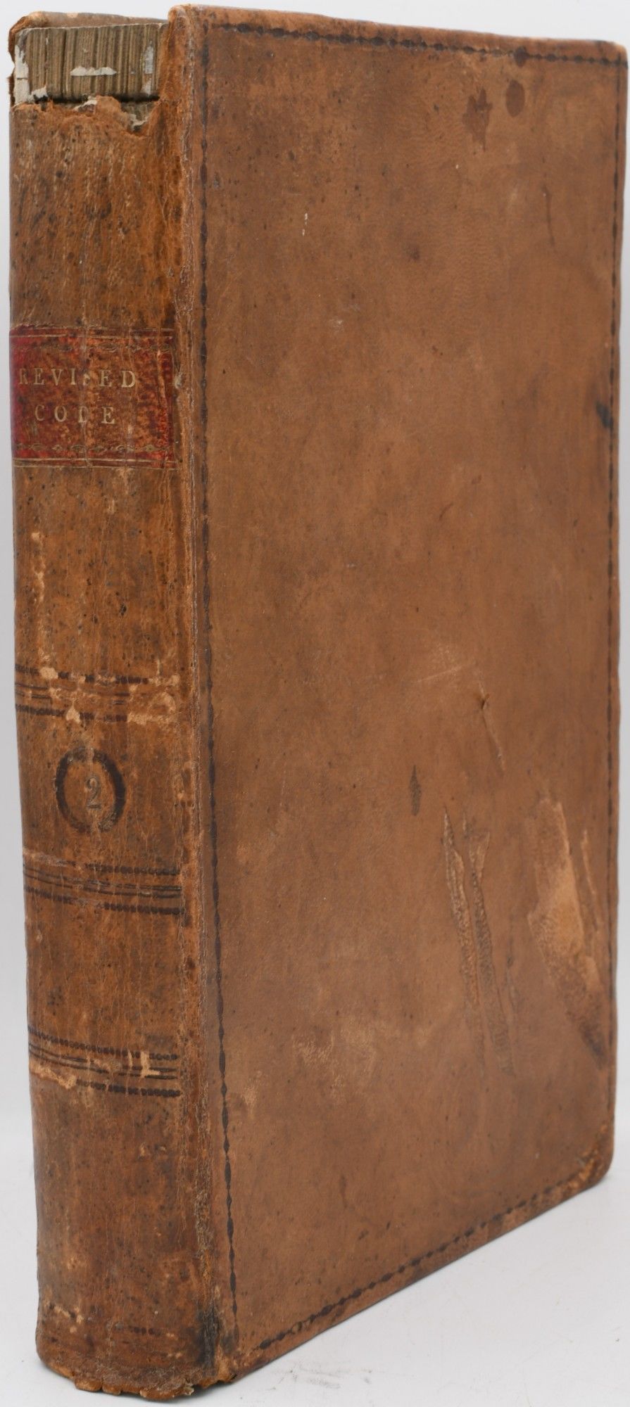 Richmond: Samuel Pleasants, Junior, 1808. First Edition. Full Leather. Very Good binding. Large 8vo.; in full sheep with a border in blind at the perimeter of the boards and with a morocco label, and with a volume number in blind to the spine; there is loss at the top of the spine; vi, [1], 2-322 pages, including the Index; lacking both the front and rear endpapers; one leaf [21/22] as a piece missing from the leading edge affecting an annotation.~~NOTE: This is Volume II only, of a 2 Volume set; the Index to the Whole is at the rear. Very Good binding.