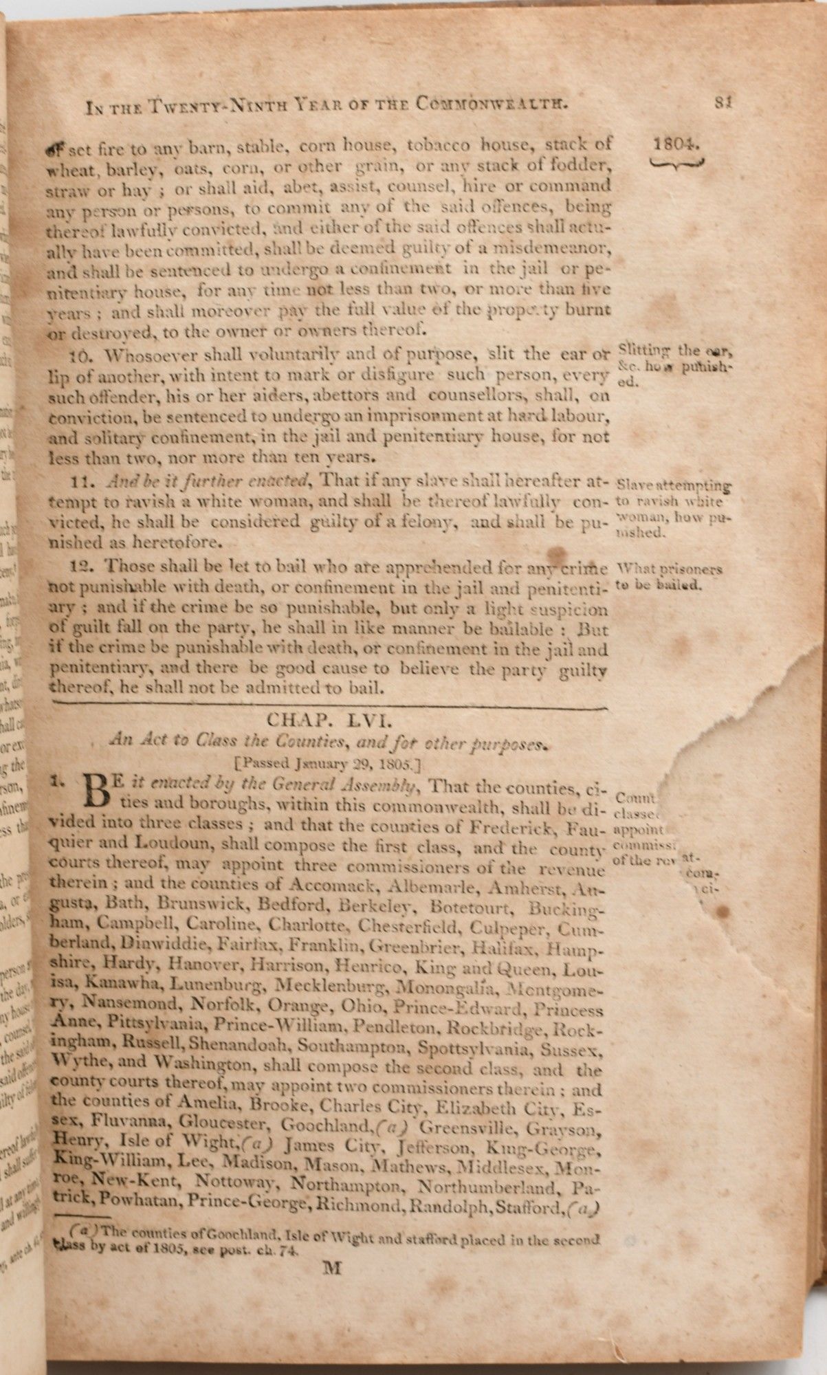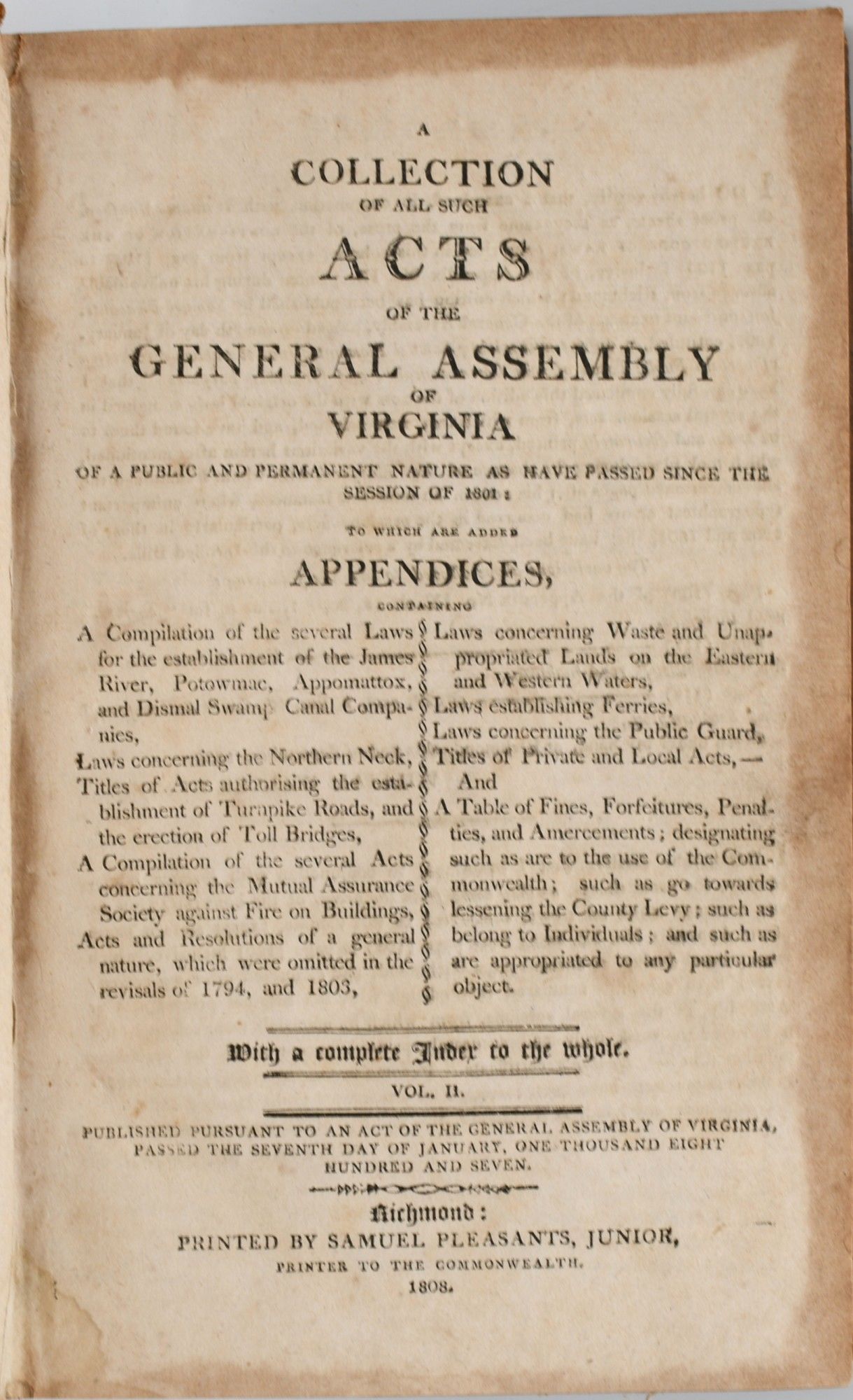 [LAW] A COLLECTION OF ALL SUCH ACTS OF THE GENERAL ASSEMBLY OF VIRGINIA OF A PUBLIC AND PERMANENT NATURE AS HAVE PASSED SINCE THE SESSION OF 1801: TO WHICH ARE ADDED APPENDICES ... WITH A COMPLETE INDEX TO THE WHOLE ... [VOLUME II ONLY OF 2 VOLUMES]