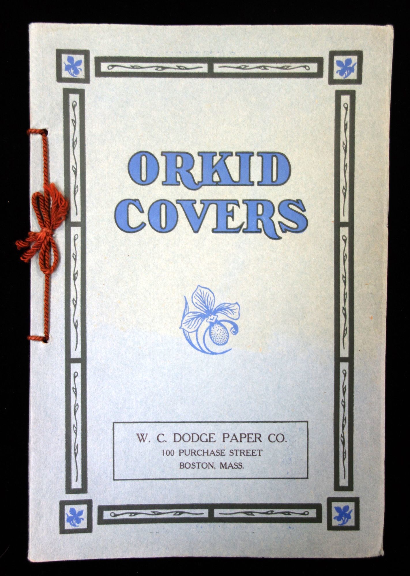 Boston, Mass: W. C. Dodge Paper Co, 1910. Blue stamped cover, tied together with brown yarn. Sample book for covers, contains samples of seven distinctive colors, describes paper weight and finish. 9" x 6" Cover and samples in good condition, crease in back cover.