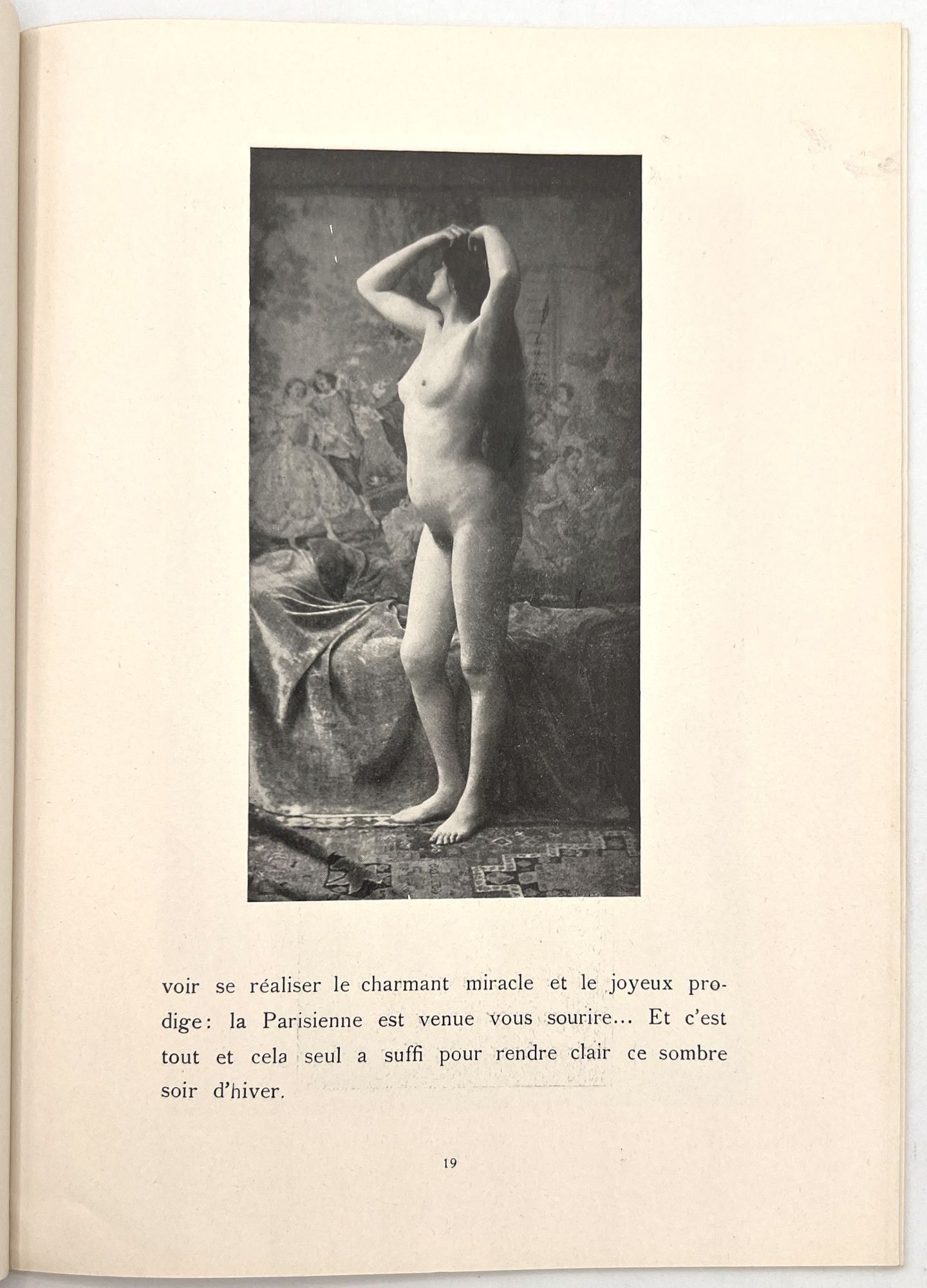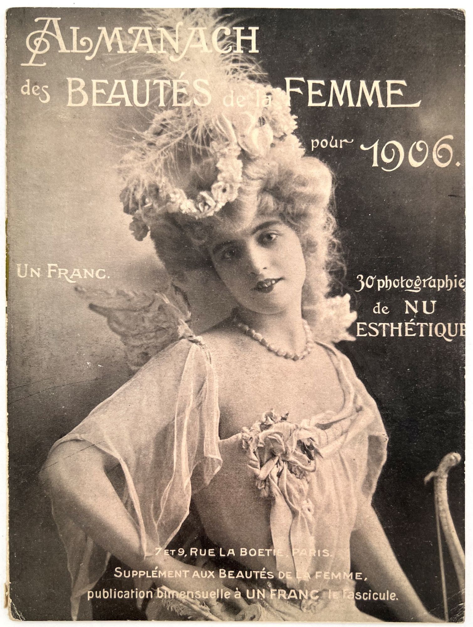 Paris, 1905. A 44 pp. booklet with paper wraps. Includes images from photographs of nude young ladies. French text. Images in black and white or pink tone. Four pages of almanac each with nude. Remainder of booklet includes text and images of one or two women together often in loving poses. Artfully posed and presented. Measures 6 1/2" x 8 1/2". Light cover wear; otherwise fine.
