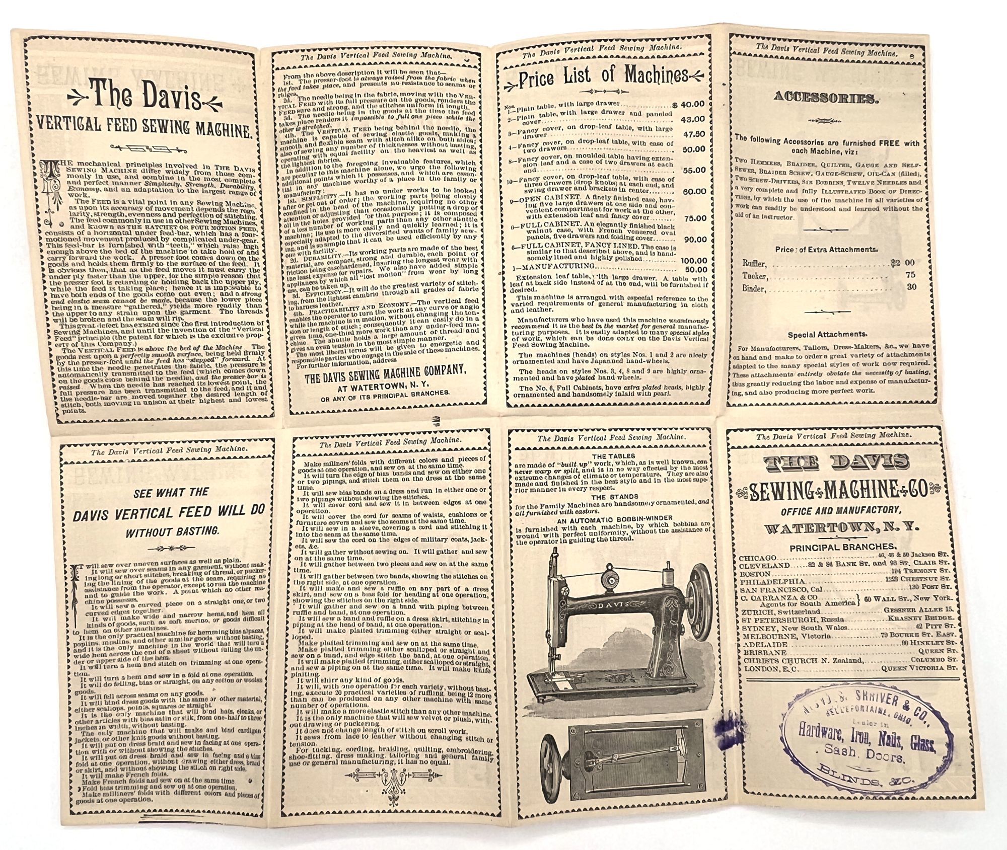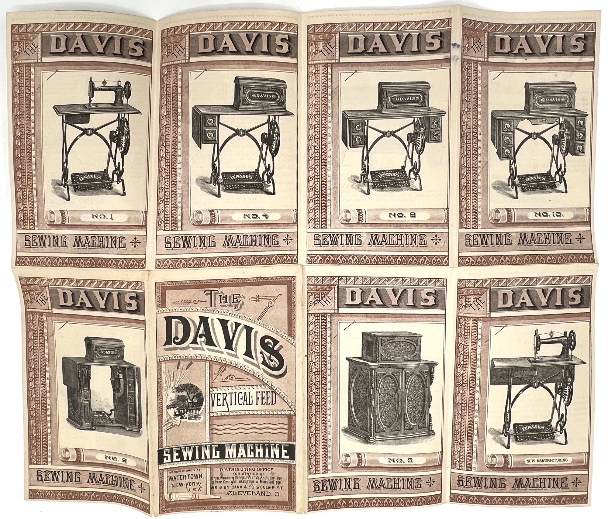 Watertown, New York: The Davis Sewing Machine Co, 1880. Very good. Light toning, a couple minor short tears.. A nicely preserved folding pamphlet advertising Davis brand sewing machines, a line of vertical feed machines marketed to women as labor saving devices for making domestic tasks easy and efficient. Includes a lengthy pitch for the products, with a price list for the different models and accessories (hemmers, braiders, quilters, rufflers, etc.). Lists dozens of benefits of this line of machines (e.g. "make plaited trimming and sew on at the same time", "It will sew the cord on the edges of military coats, jackets, &c."). Seven of the models are illustrated with model numbers. Measures approx. 5.5" by 3.25" folded, 11" by 13" unfolded. Printed in brown and black. Ink stamp of sales agent. The Davis Sewing Machine Company was founded in 1868 and became known for the efficiency of their "vertical feed" machines. By 1892, they had also began producing bicycles and eventually stopped producing sewing machines to meet the 1890s bicycle craze.