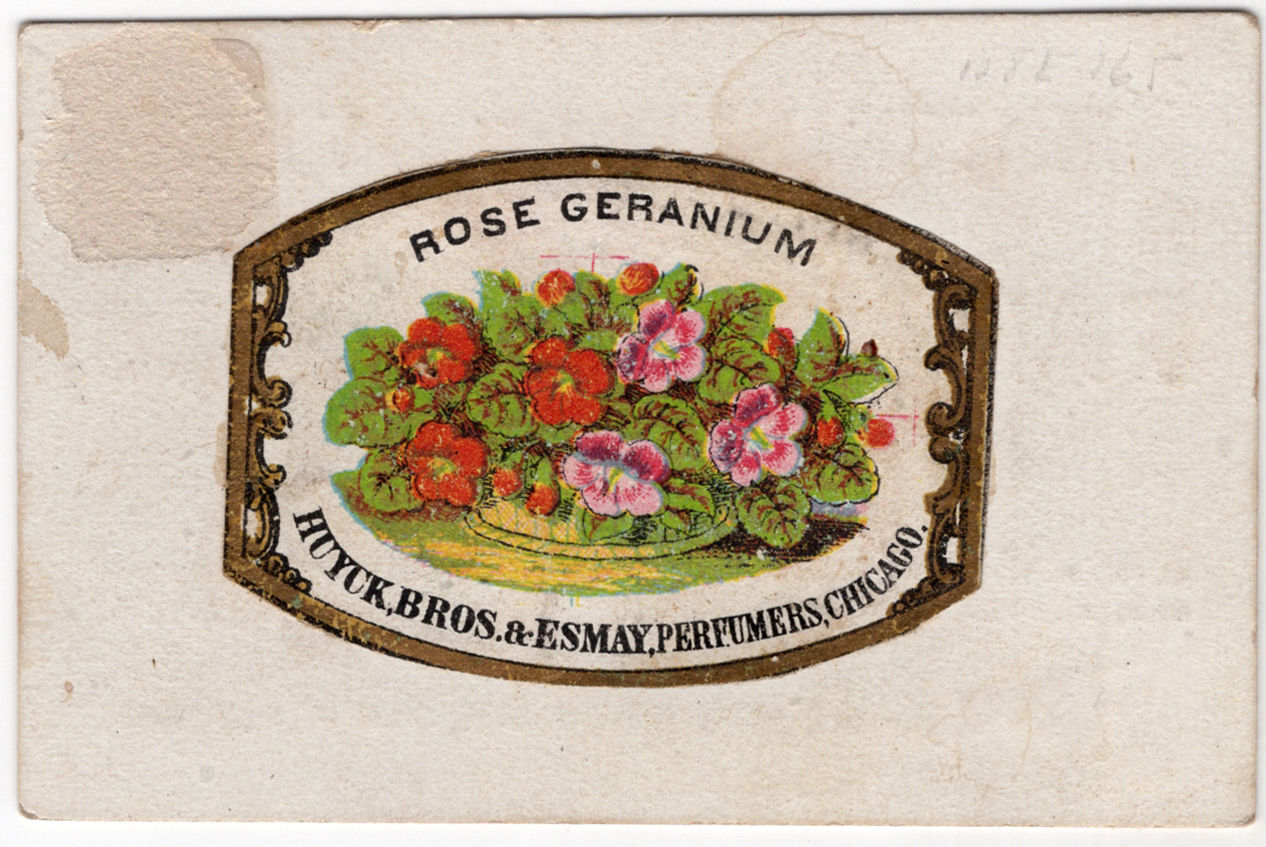 Boston, Massachusetts: Maxwell & Covell, grocers, 1880. Very food. Slight surface wear to reverse.. Charming advertising card for Maxwell & Covell, grocers based on Pleasant Street in Boston, with an attractive chromolithographed applique on the reverse side with image of rose geraniums. Advertises a product presumably sold by the grocer, "Huyck Bros. Perfumers, Chicago". Edged in gold, and measures approx. 1.25" by 2". Full card measures approx. 2" by 3