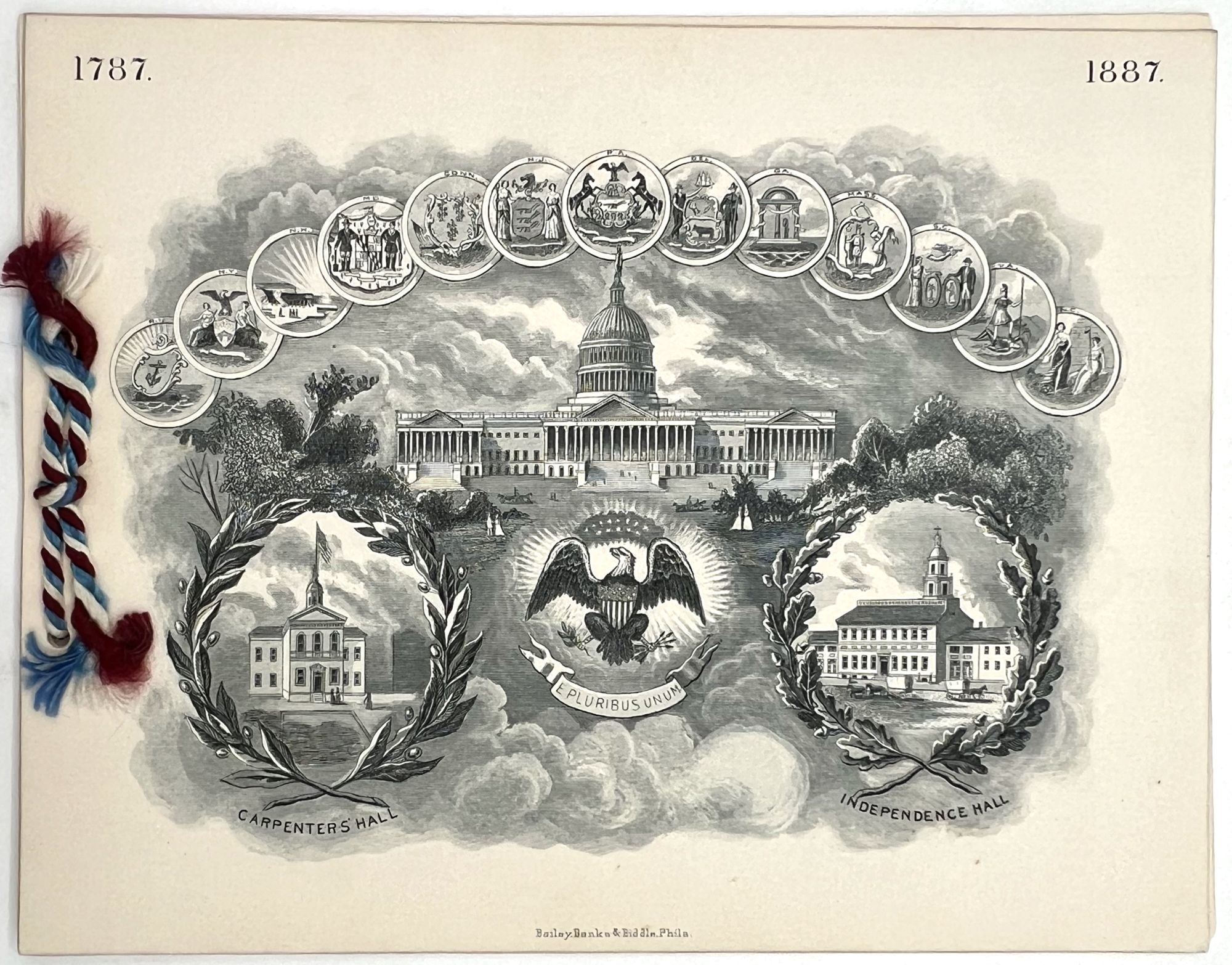 Philadelphia, Pennsylvania: Bailey, Banks & Biddle, 1887. Very good. Toning.. A two-page 5" by 6.5" invitation printed on heavy card stock, held together with a red, white and blue silk rope tie. The engraving on the cover includes imagery of the Capital Building, Carpenters' Hall, Independence Hall, an American Eagle and state emblems from the original 13 states. The invitation within is for September 16th, 1887, to be held at the American Academy of Music in Philadelphia.