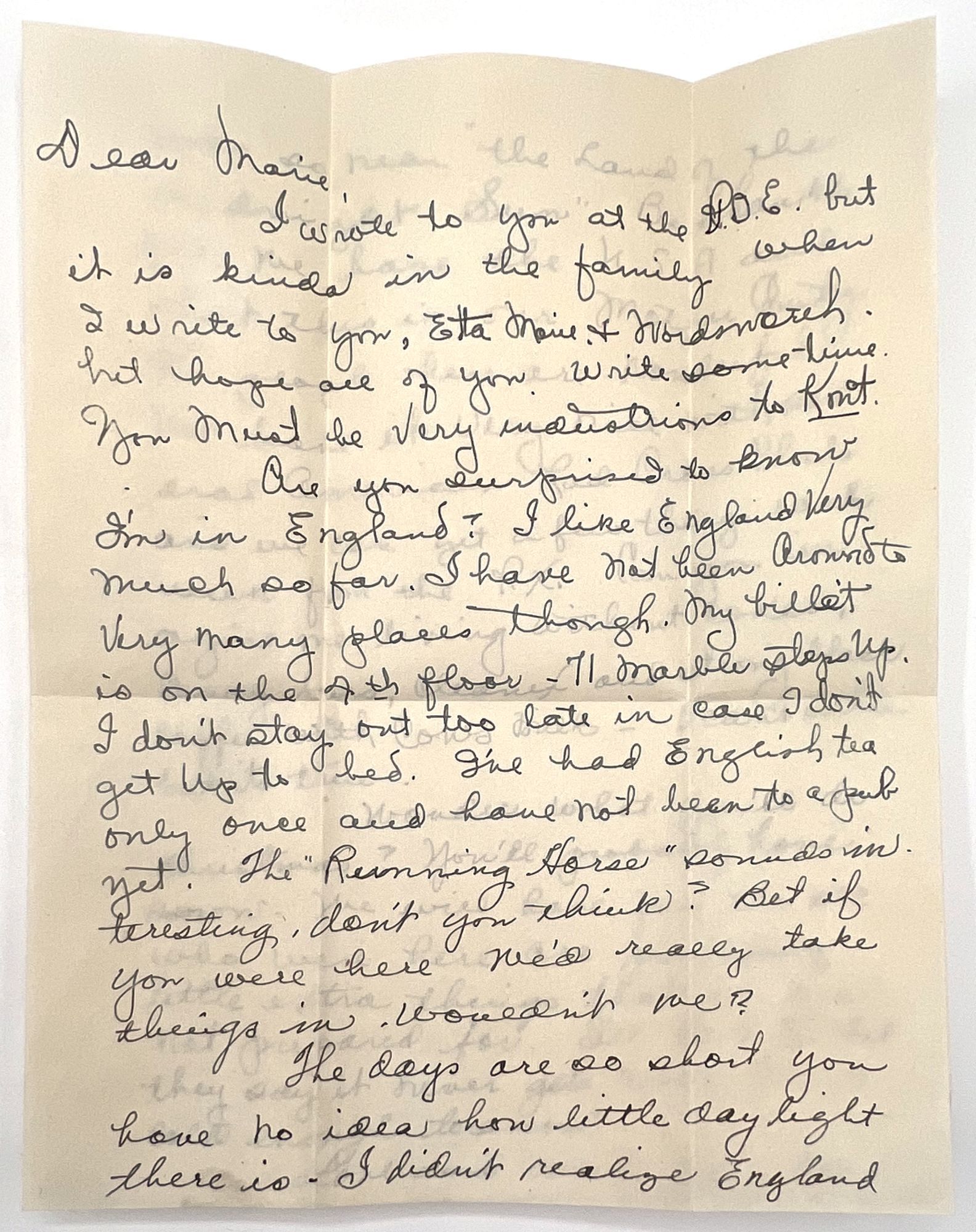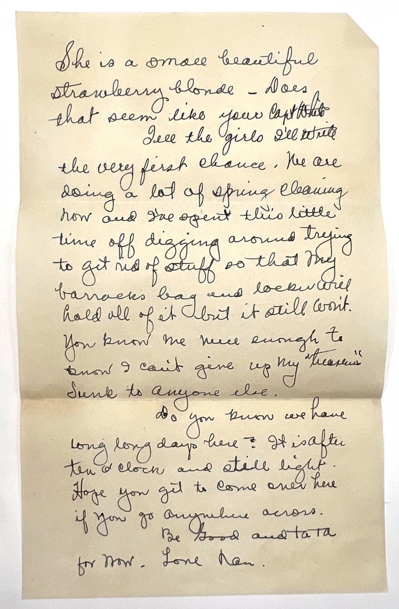 London, England, 1944. Very good. Light toning, a couple tears/wear to envelopes.. A set of three handwritten letters addressed to Women's Army Corps (WAC) Corporal Marie Jorza from her WAC friend Sargent Nannie B. Layfield. One is undated, and the remaining two letters are dated 29 April and 1 June 1944. The undated letter appears to be first of the series, and reports Layfield's first impressions on serving abroad: "Are you surprised to know I'm in England? I like England Very much ... I've had English tea only once and have not been to a pub yet. The 'Running Horse' sounds interesting, don't you think? Bet if you were here we'd really take things in, wouldn't we?" The writer goes on to say that the local Red Cross has provided them with a few things ("Can you imagine me living without Cokes?") and asks what the recipient will do for Christmas before signing off. The next letter, dated 29 April 1944, responds to the "romantic news" of their friends, who presumably got engaged, and goes on to describe her current role in England: "I went to a thing yesterday and was told I could say I'm with the Office of Strategic Services. Since you are in the Army you probably know about that ... it is neither thrilling nor boring, just another job". She finishes the letter by talking about her uniform, new hat, and a present bought for her niece's upcoming birthday. The "Office of Strategic Services" she refers to in this letter was an intelligence agency formed for the war and ultimately absorbed into the State Department and CIA. The London branch referred to here in the letter was located at 70 Grosvenor Street. The third and final letter from Layfield, also penned in London, is dated 1 June 1944. It begins with an apology for mis-addressing the previous letter, and goes on to read, "I can't imagine why you thought I was not cooking. I'd day I AM With Gas on the Front Burner! The boys and girls of OSS eat together and we cook with boys—3 of them (2 girls) ... Do you remember Margaret Warren she is here with two other girls from Anti-aircraft ... I have not had a chance to ask Captain White is she remembers you but she was in Daytona when I was... She is a small beautiful strawberry blonde—Does that seem like your Captain White?" She concludes the letter with talk of spring cleaning her barracks and a chipper "Be Good and ta ta for now". Accompanied by two air mail envelopes postmarked 1943 and 1944, stamped by the Army Examiner. Largest Letter measures approx. 10.5" by 8", envelopes measure approx. 3.5" by 6.5". Corporal Marie H. Jorza (b.1916) enlisted in the WAC in 1942, and received her discharge in December 1945. Before enlisting, she was a beautician in her hometown of Chico, California. After the war, she would go on to co-own a salon and marry in 1947. Nannie B. Layfield (b.1897) served in the OSS under Captain Barbara White.