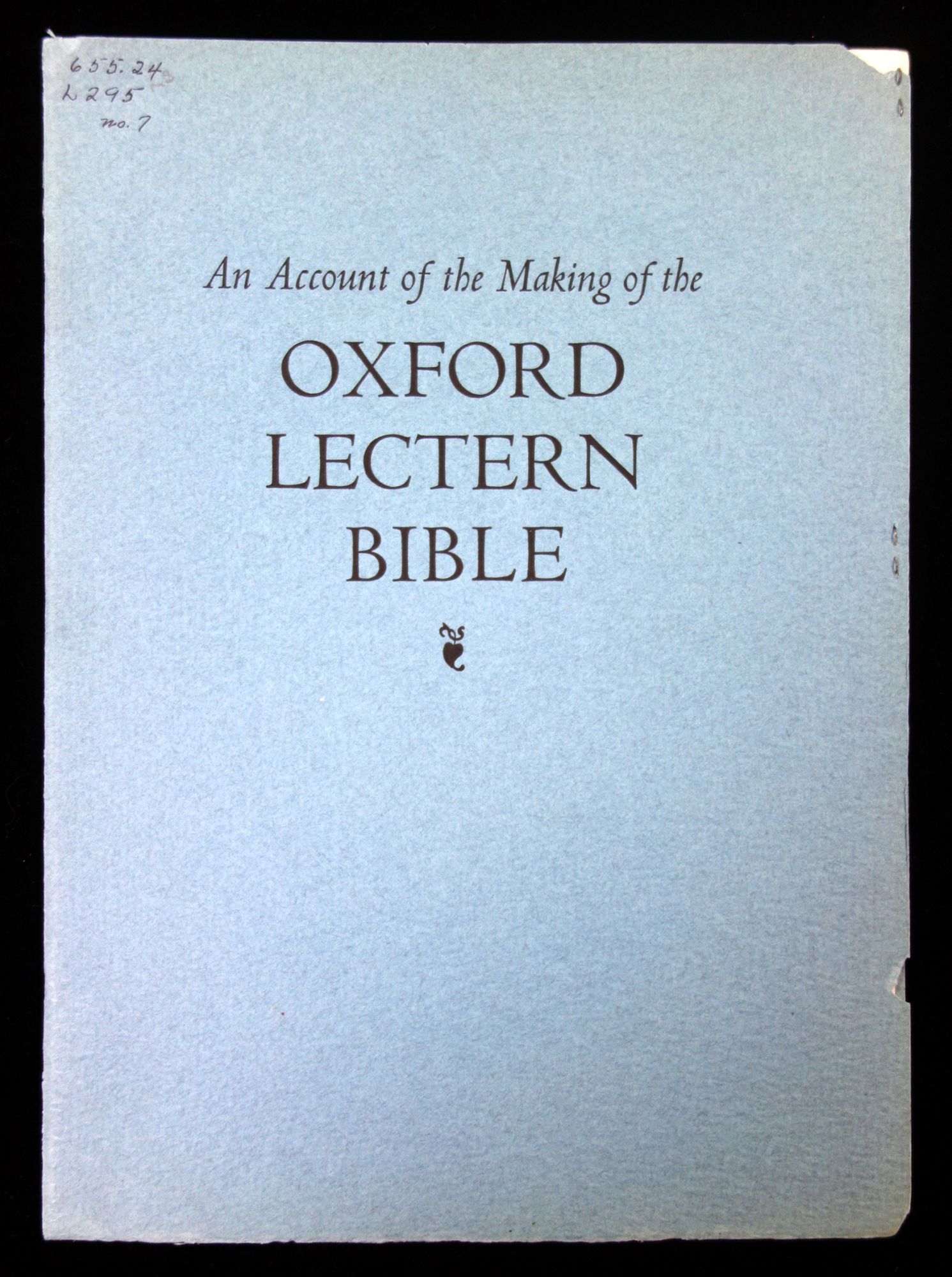 Philadelphia, PA: Lanston Monotype Machine Company, 1936. 15 pp. Blue paper cover, four page mini hinge in staple to inside front cover. An account of designing the Oxford Lectern Bible, choices the designer made. Includes samples from the book. 11 1/4" x 8" cover slightly worn, Drexel Institute Library Philadelphia embossed stamp on first page.
