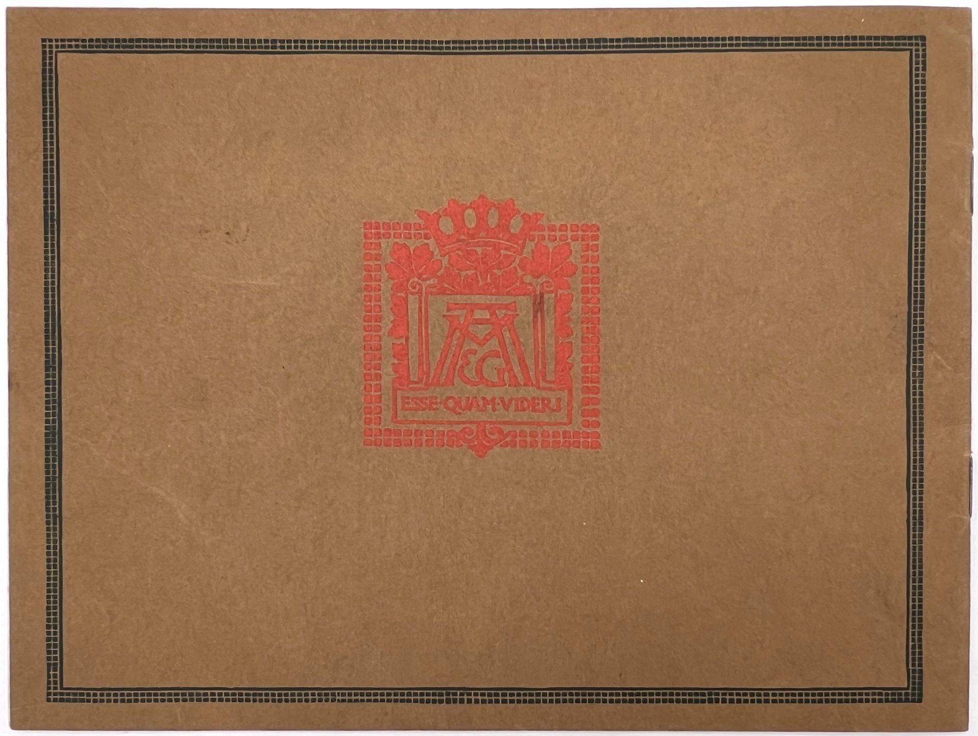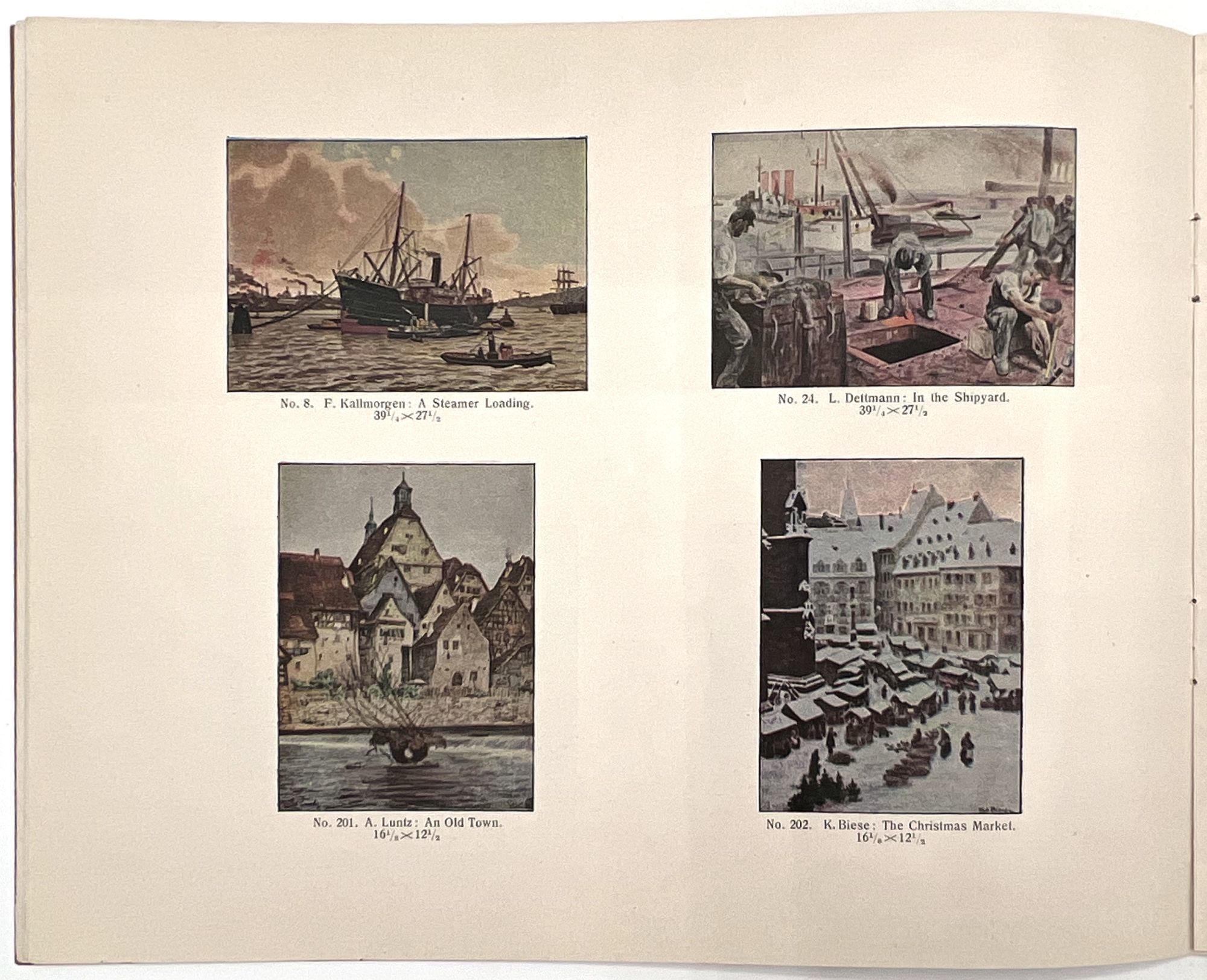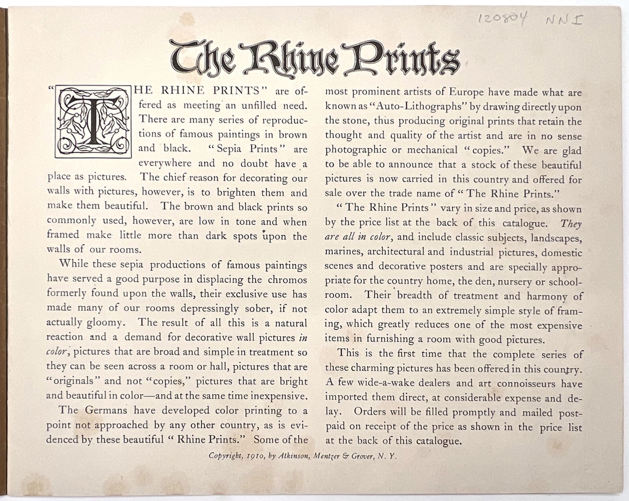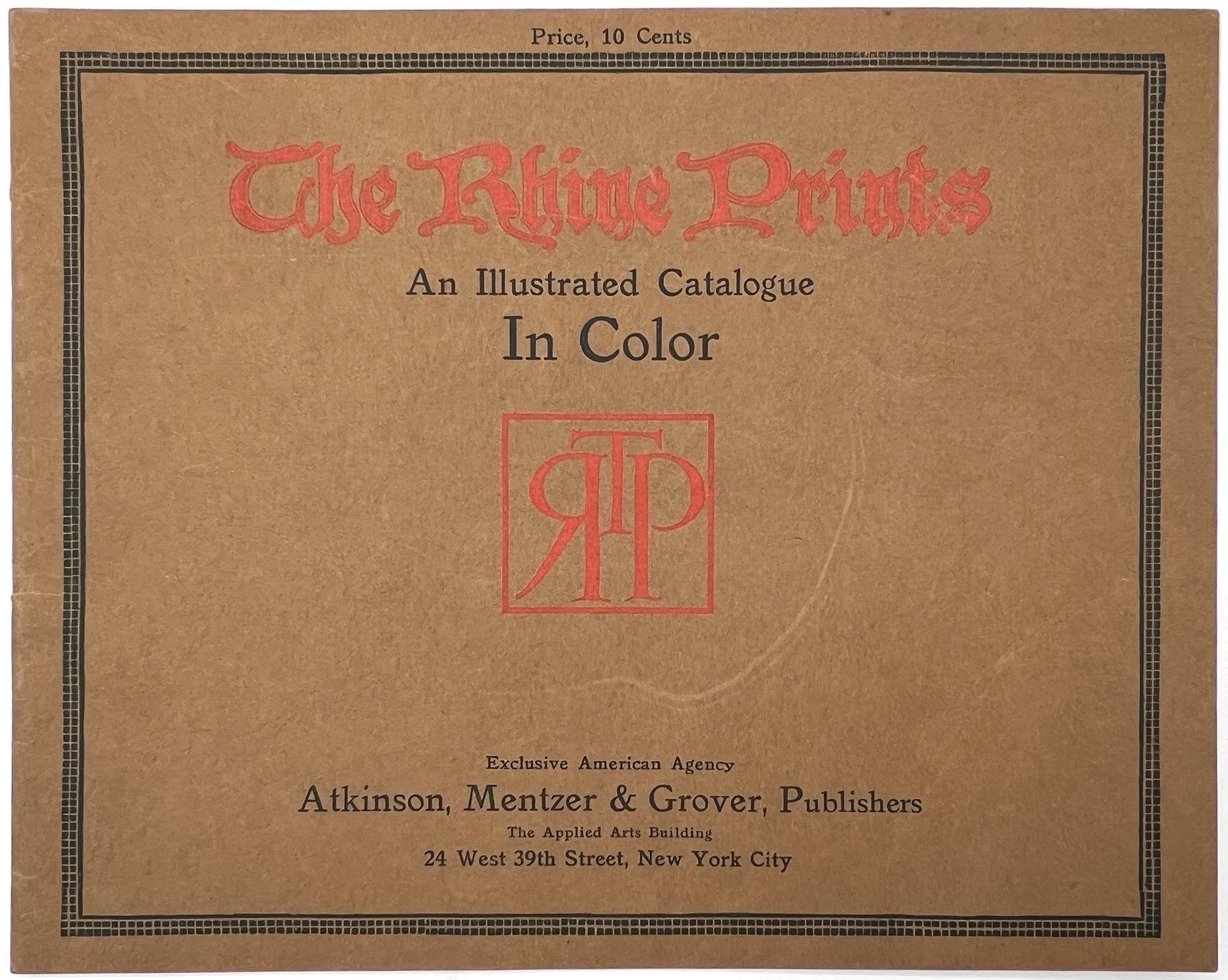 New York, New York: Atkinson Mentzer & Grover, Publishers, 1910. Very good. Light spotting.. A scarce illustrated catalogue of color art prints published for homes and schools, marketed as a modern color alternative to outdated Victorian prints. The New York-based publisher markets the prints as superior due to modern German printing techniques. They argue that "While these sepia productions of famous paintings have served a good purpose in displacing the chromos formerly found upon the walls, their exclusive use has made many of our rooms depressingly sober, if not actually gloomy. The result of all this is a natural reaction and a demand for decorative wall pictures in color ... The Germans have developed color printing to a point not approached by any other country, as if evidenced by these beautiful Rhine Prints" (p.[1]). Includes testimonials from happy customers, including a school superintendent and Walter Crane. Also includes a price list in the rear with title, artist, size in inches, price, and number. There are eight leaves of color reproductions of the prints for sale. Single vol. (7" by 8.75"), pp. [20], illus., in original brown wrps printed in red-orange and navy blue. Provides an important window into material history, showing what kinds of prints were sold to be hung on walls of homes and schools in 1910. Also interesting to see how these were marketed as replacing "outdated" forms of printing such as Victorian chromolithography.