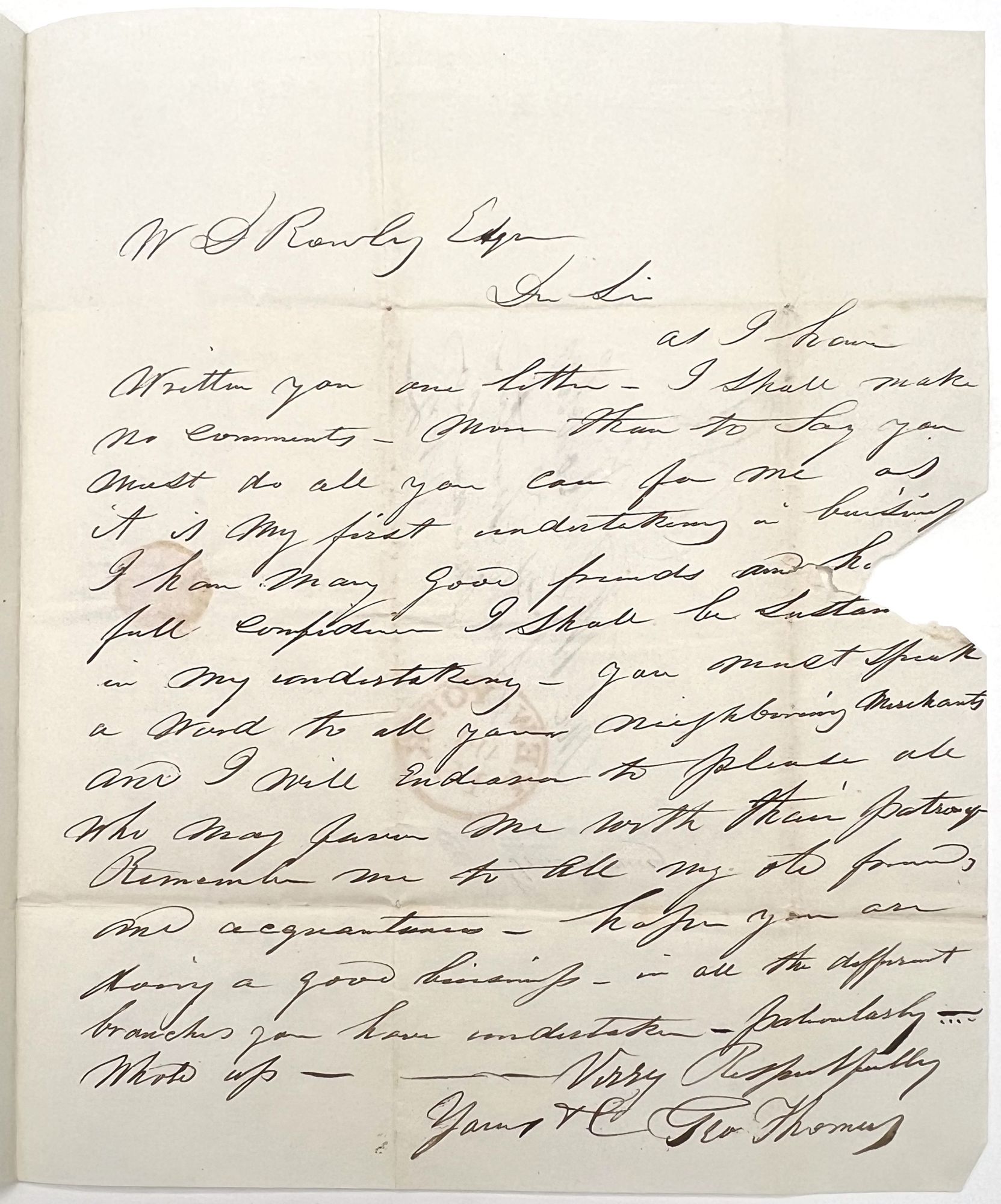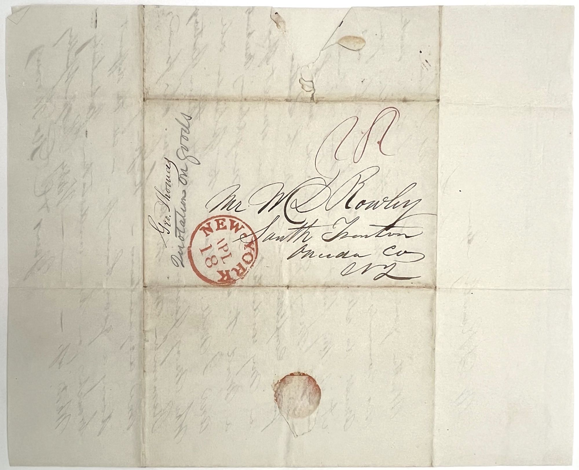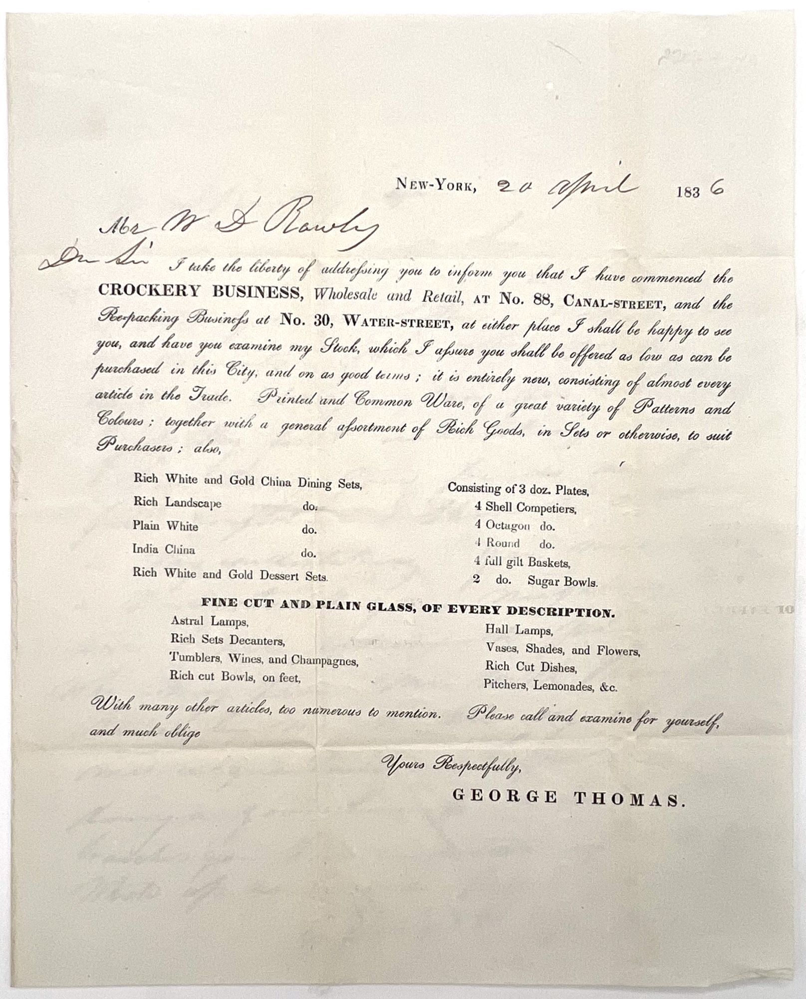 New York, New York: N.p., 1836. Good. Large short tear to right-hand margin of lower leaf. Light dust soiling, letter folds.. A stampless circular distributed before 1847, when the first general issue postage stamps were issued in America. It advertises a New York-based Crockery business run by George Thomas, and is comprised of a lithographed pitch letter followed by a full-page handwritten business pitch signed by Thomas on the following page. Lists some of the different fine china dining sets, lamps, glasses and decanters for sale on the first leaf. Addressed and postmarked, but with no stamp, to Mr. Warren D. Rowley (1800-1854) of South Trenton, Oneida County, New York. Lithographed bifolium with contemporary ink manuscript measuring approx. 9.75" by 8