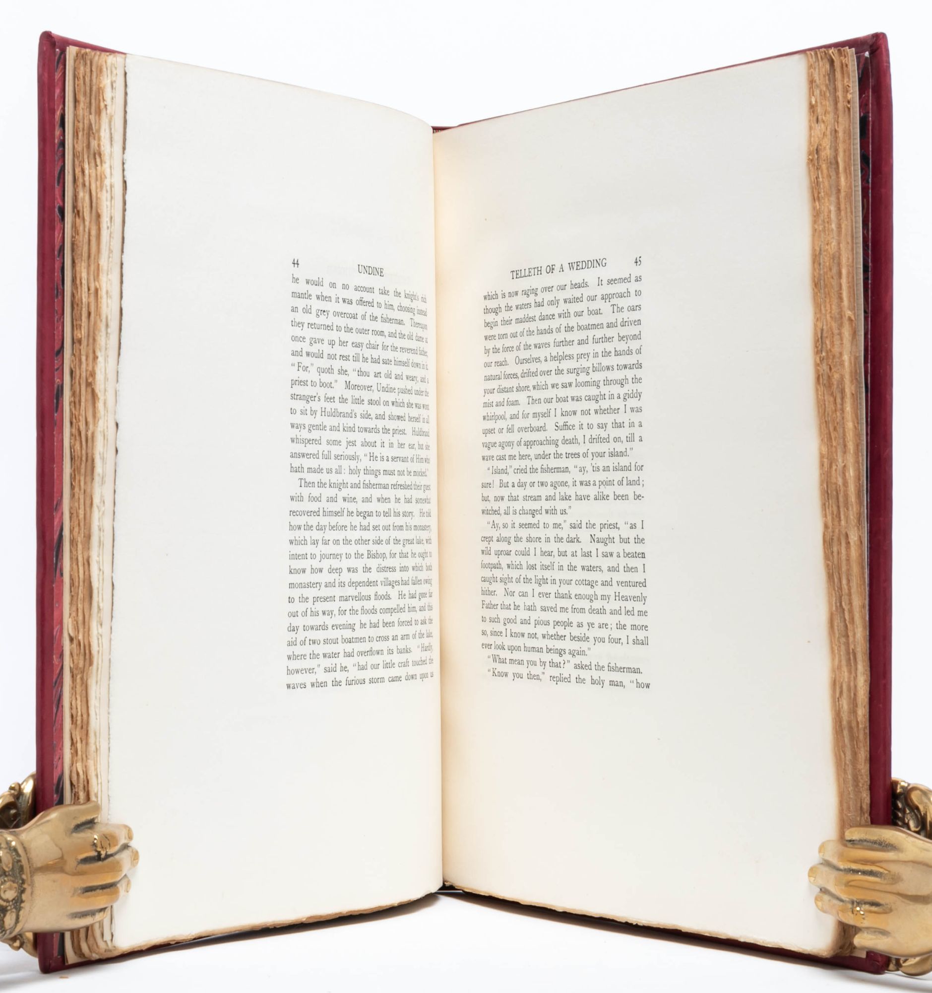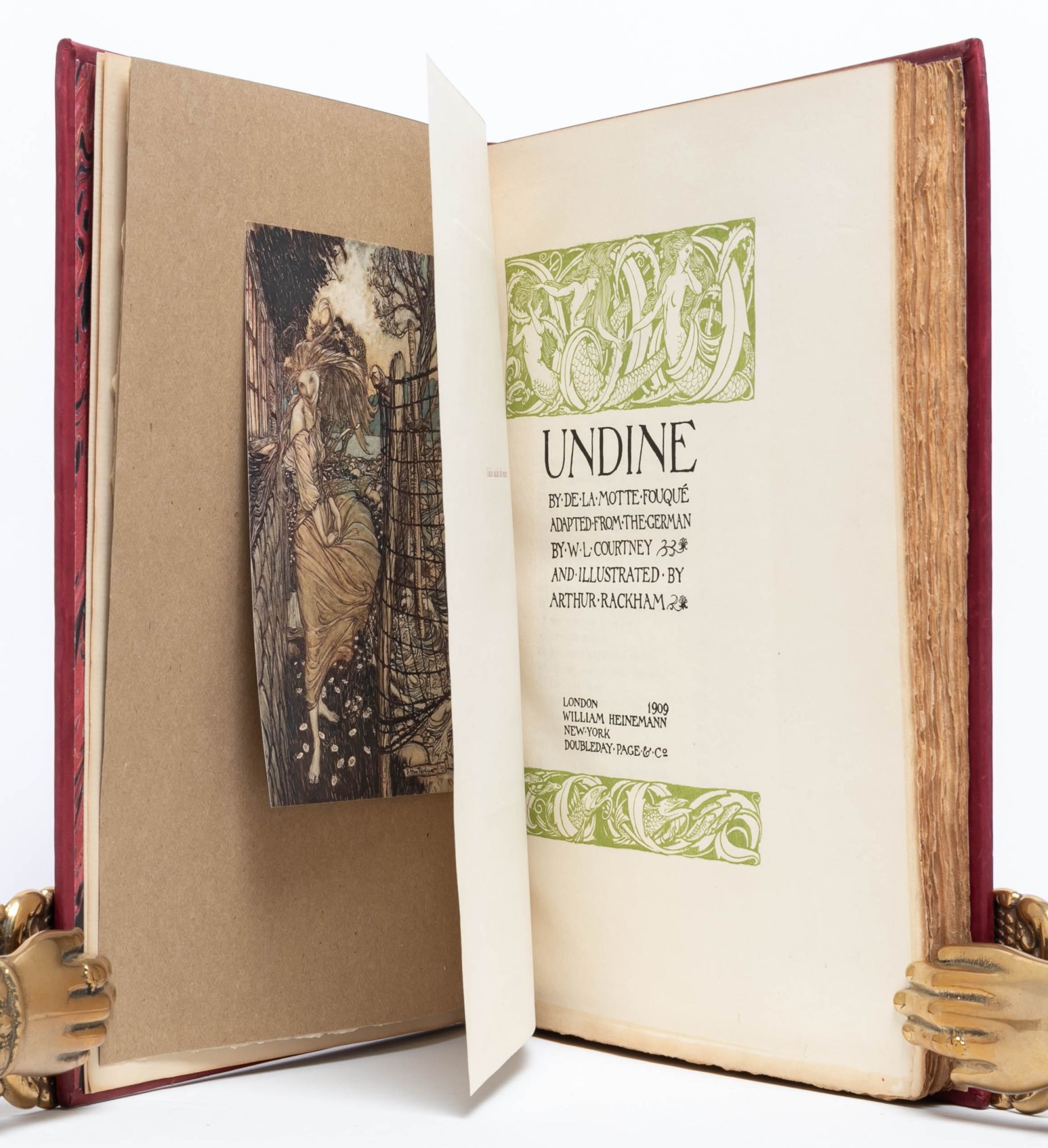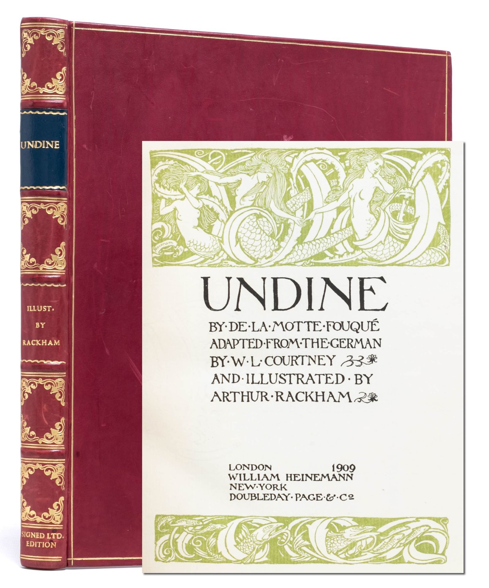 Friedrich de la Motte Fouqué's novella Undine (1811), is a German reimagining Paracelsus's sixteenth-century alchemical folklore, in which a water nymph hopes to gain a spirit by marrying a human knight, but their romance has tragic consequences. "With the aqueous world of Undine Rackham found an opportunity to revive and develop his earlier art nouveau linear decorative drawing. Especially in the need to incorporate waves and water currents in his pictures. He was thus able to connect a felicitous quality of decoration into his plates, was well as a new feeling for flat pattern which harks back to fin de siècle without being too openly mannered" (Gettings). "Although the waves and eddies of Undine bear the mark of Art Nouveau, the work was still another step forward for Rackham, the unity of conception in the line drawings and the colour plates, the assertion of contrast in the moods of the heroine, rendering it a masterpiece of sympathetic understanding" (Hudson).