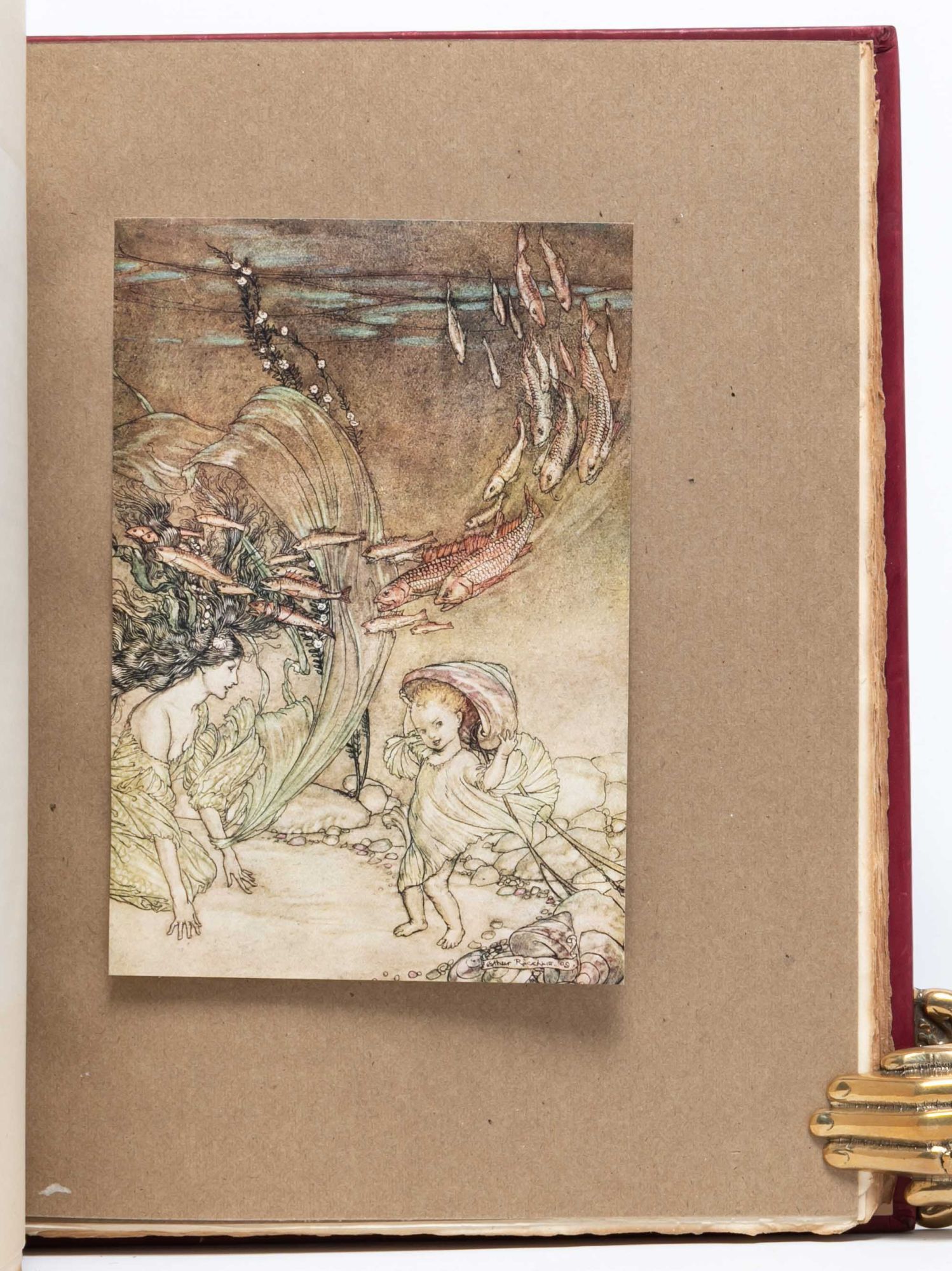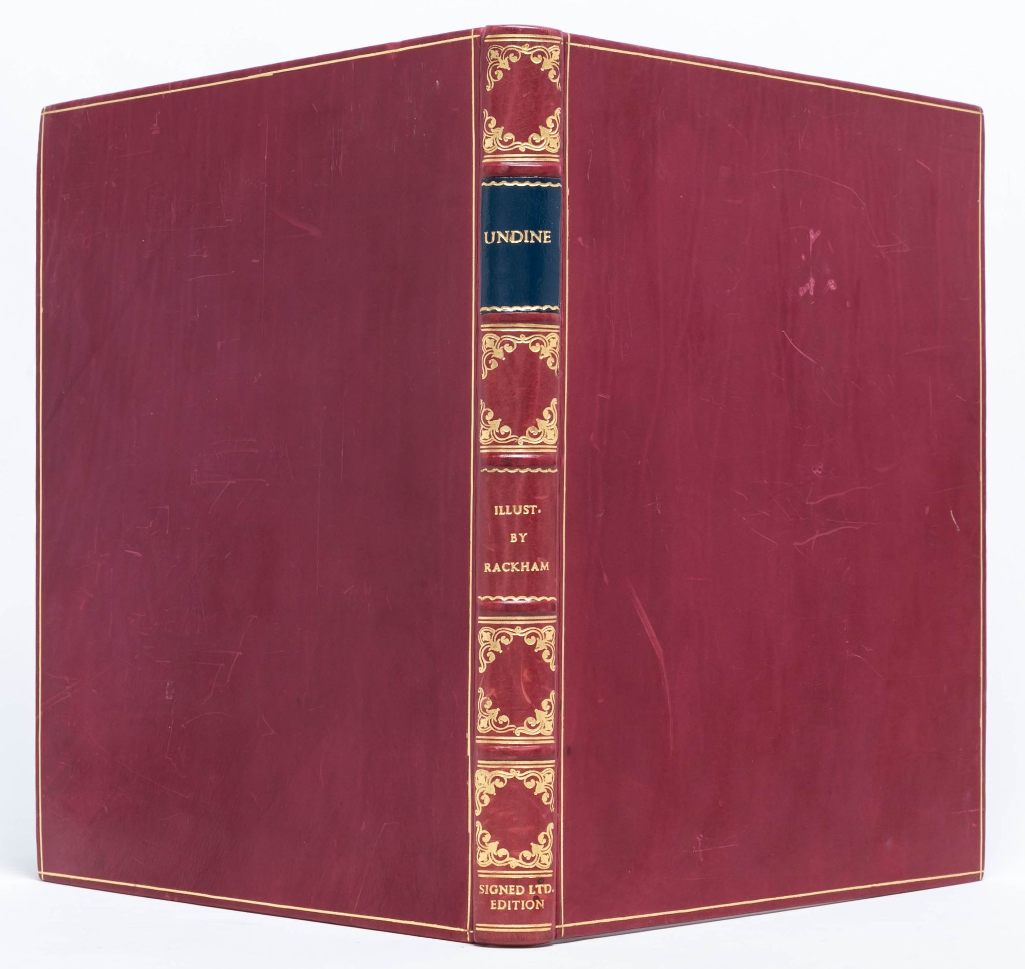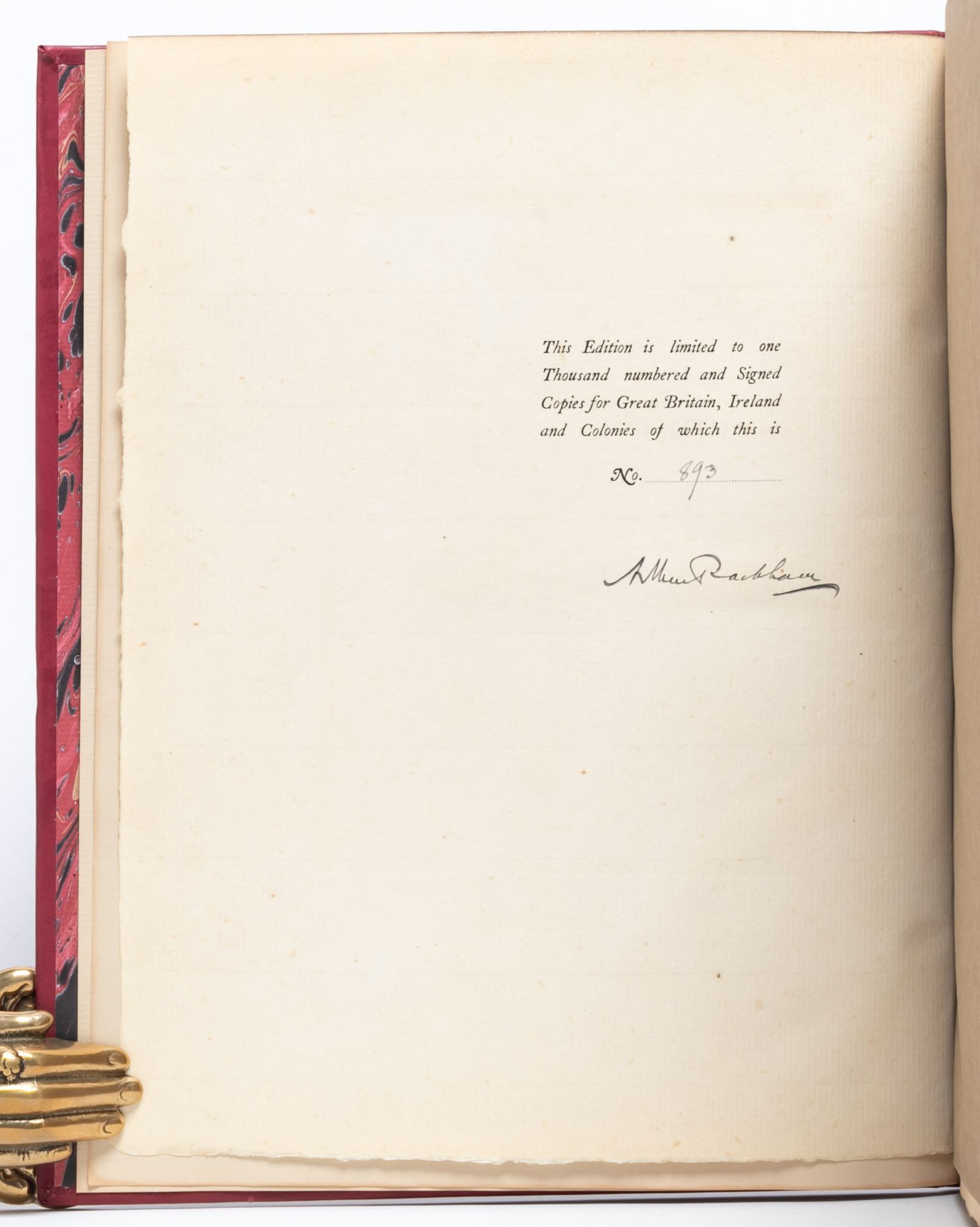 London & New York: William Heinemann/Doubleday, 1909. Deluxe edition. Near Fine. Number 893 of 1000 copies, signed and numbered by Rackham. With 15 color plates on heavy brown paper, and black and white illustrations throughout, retaining half-title. Rebound in red calf with decorated spine compartments and gilt title on blue leather, red marbled endpapers. Top-edge of text block gilt with rest of edges uncut. Some scratches to front and back boards, offsetting to half-title and last text page (136), and all pages facing the brown paper plates, otherwise interior bright and clean.