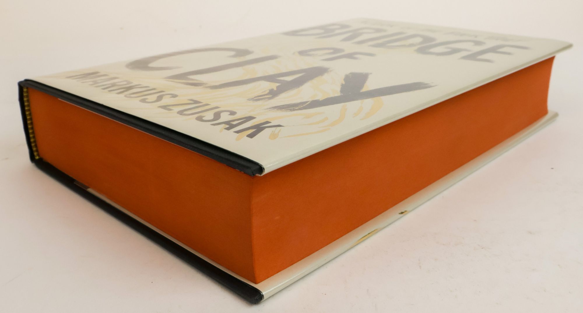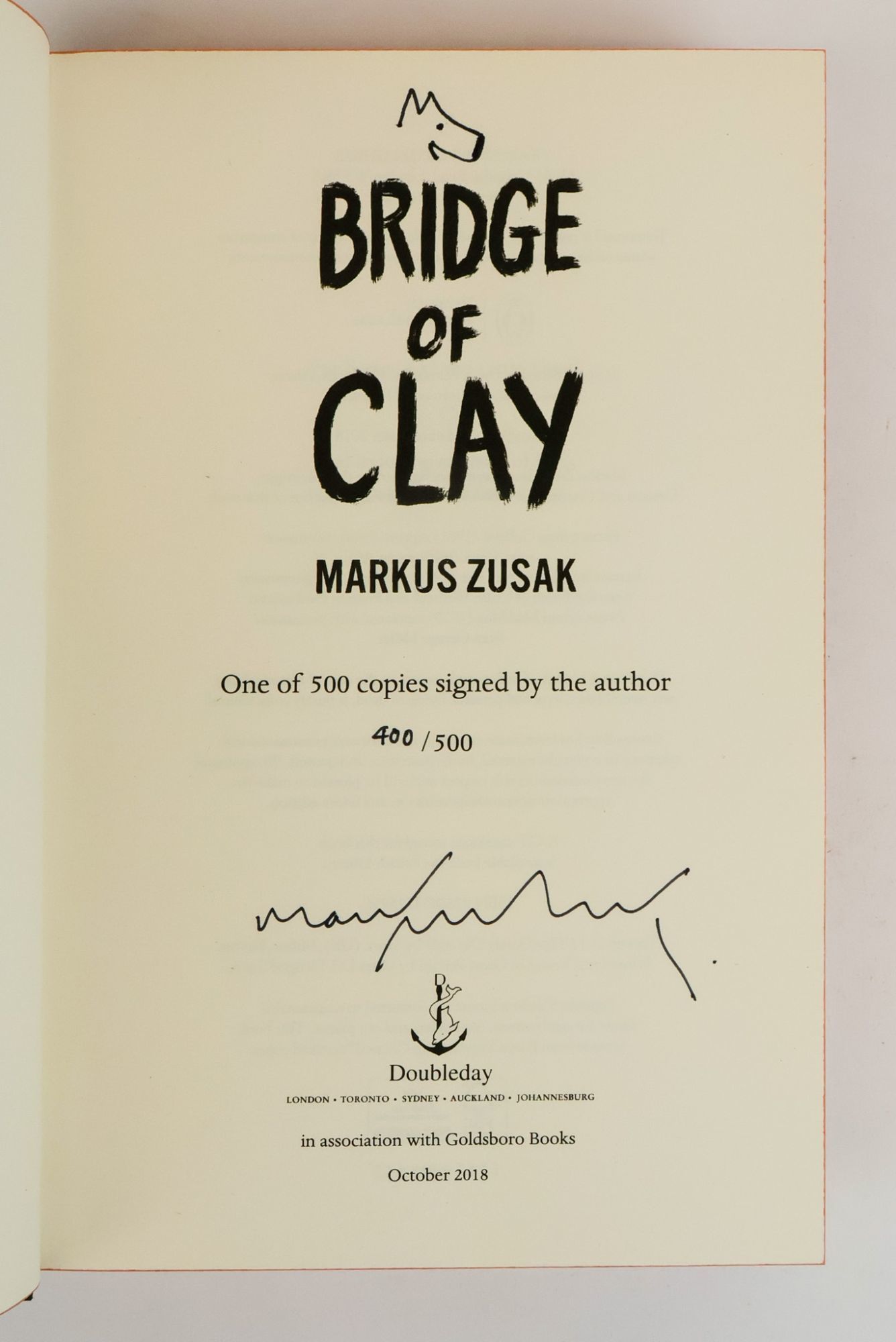 London, UK: Doubleday, 2018. First UK Edition, First Printing, Limited Edition #400/500. Hardcover. Octavo, 583 pages. In Near Fine condition with a Near Fine condition dust jacket. Light grey spine with black lettering. Dust jacket is wrapped in a mylar covering. Textblock is colored brick red. Contains a loose 'Bridge of Clay' bookmark and a sheet of stickers adhesively attached on the rear end-page. Signed flat by Markus Zusak on publisher's limitation page, limited edition #400/500. Shelved above YA. 1384139. Shelved Dupont Bookstore.