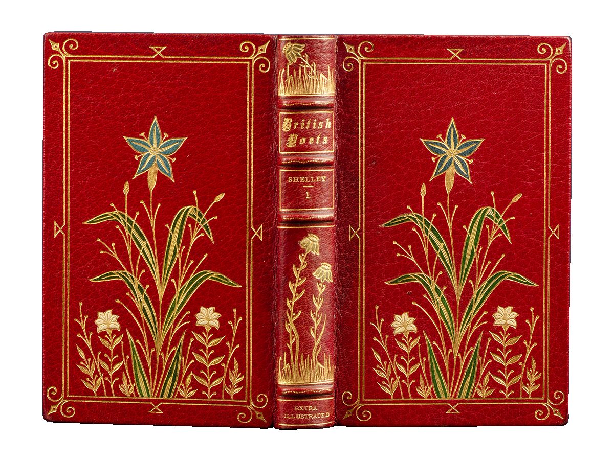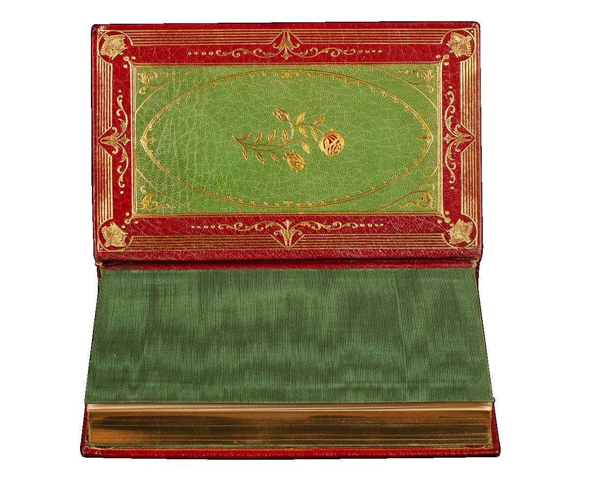 New York and London: Chiswick Press and Charles Whittingham and Co, 1900. Later edition. Near Fine. A nearly Fine copy. Five small octavo volumes (6 1/2 x 4 inches; 165 x 102 mm.). [iii]-lxvi, [1]-203, [1, blank]; [vi], [1]-294, [1, printers device], [1, blank]; [iii]-xii, [1]-380; [iii]-x; [1]-345, [1, printers device]; [iii]-xiv, [1]-366, [1, printers device], [1, blank] pp. Title-pages printed in black and red. With a memoir at the beginning of volume one. The last volume contains an index of first lines and a general index. Extra-illustrated by the insertion of twenty-six engraved plates, including eight hand-colored. Handsomely bound almost certainly by The Harcourt Bindery ca. 1900, in full red morocco, covers with double gilt border with fancy corner-pieces, enclosing a spray of flowers elaborately stamped in gilt and with green morocco leaf inlays and buff morocco inlaid flowers. Spines with four raised bands decoratively tooled and lettered in gilt in compartments and with three olive green morocco flower inlays. Highly decorative gilt turn-ins surrounding an oval panel of green morocco decorated in gilt with a large central gilt flower with inlaid red morocco flower head, green moire silk end-leaves, all edges gilt. Minimal rubbing and repairs to the outer joints, otherwise fine. Although unsigned the binding is almost certainly by The Harcourt Bindery.