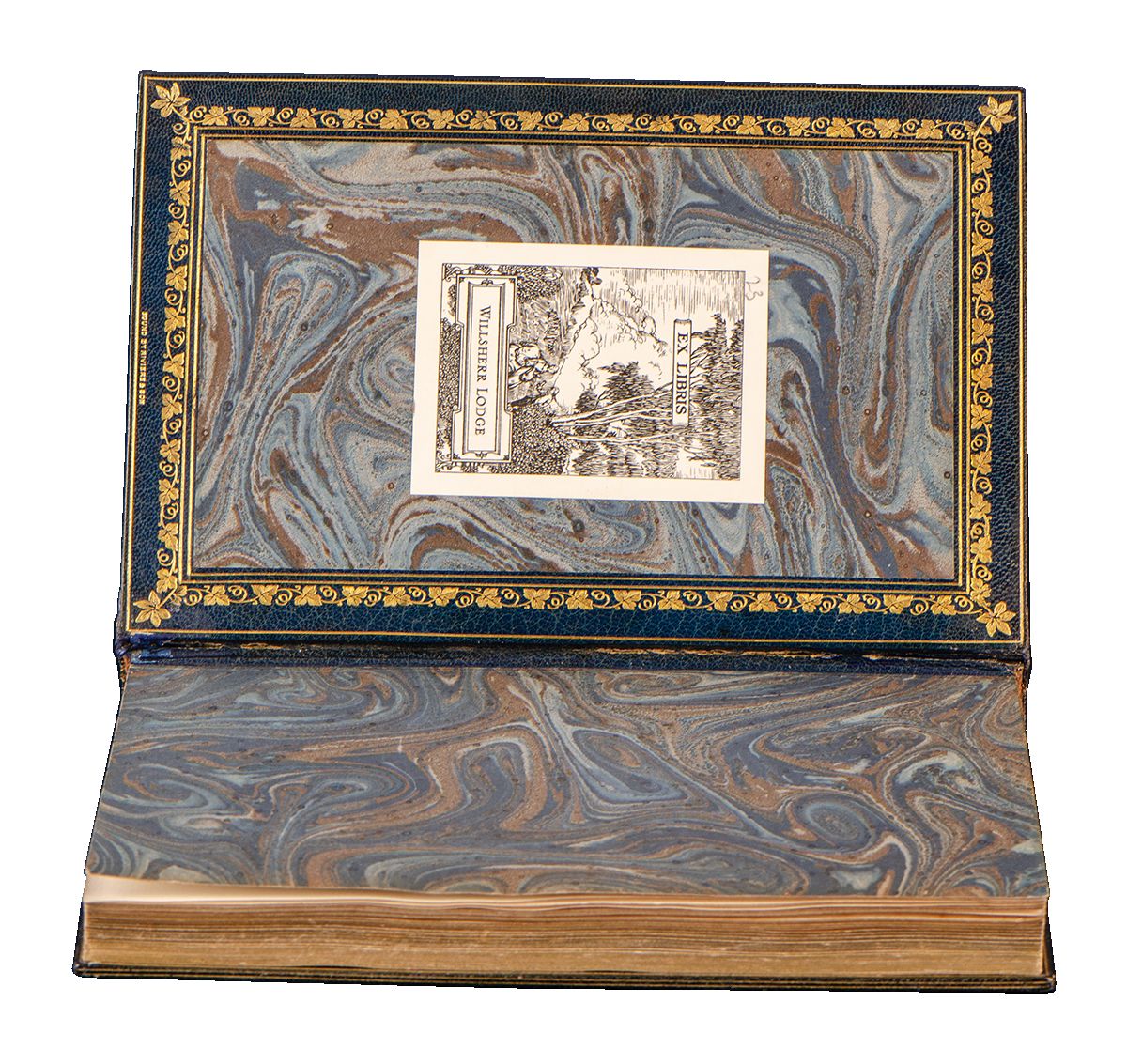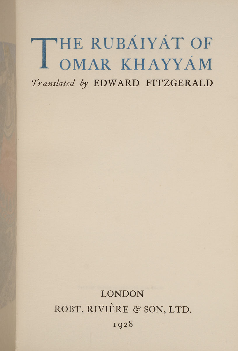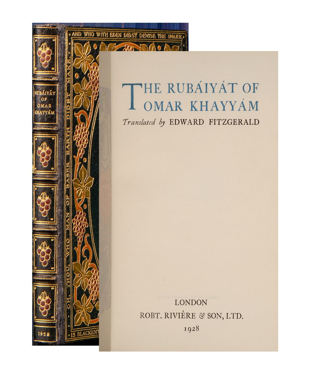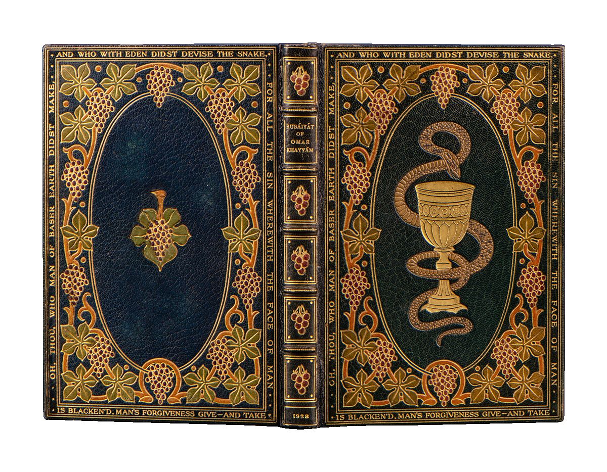 London: Robt. Riviere & Son, 1928. Special edition. Octavo (8 x 5 3/8 inches; 204 x 137 mm.). [ii, blank], [iii-viii], 75, [1, imprint] pp. With twelve illustrations by Gilbert James hand-colored and heightened with gold, and printed with blue initials for each stanza. Caslon Old Face type on Studio hand-made paper, some light marginal foxing to plates, otherwise fine. Bound ca. 1928 by Rivière & Son (stamp-signed on front turn-in) in full blue crushed levant morocco. Front cover with a central oval panel with an onlaid brown-spotted serpent twining around a large gilt chalice. This central panel is surrounded by a floral border of inlaid green flowers on orange stems with bunches of grapes in purple. Inside a double-ruled gilt border on each cover is stanza number fifty-eight "Oh, Thou, who Man of baser Earth didst make, And who with Eden didst devise the Snake: For all the Sin wherewith the Face of Man Is blacken'd, Man's Forgiveness give - and take." Rear cover with a similar oval panel also surrounded by a floral border of inlaid green flowers on orange stems with bunches of grapes in purple, and with a single onlaid green flower and a central inlaid bunch of purple grapes. Spine with five raised bands decoratively bordered in gilt with inlaid purple morocco bunches of grapes in five of the panels and gilt lettered in the other, double gilt ruled board edges, elaborate gilt turn-ins, featuring a vine motif, marbled paper doublures and endleaves, all edges gilt. Upper joint expertly and almost invisibly repaired otherwise a near fine example of a late twenties Rivière 'Inlaid' binding. Engraved bookplate of Willsherr Lodge, the home of Samuel Clay Williams (1884-1949) lawyer and tobacco magnate, on front pastedown.