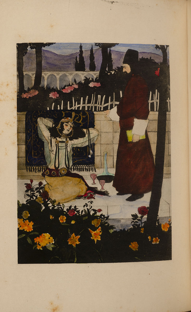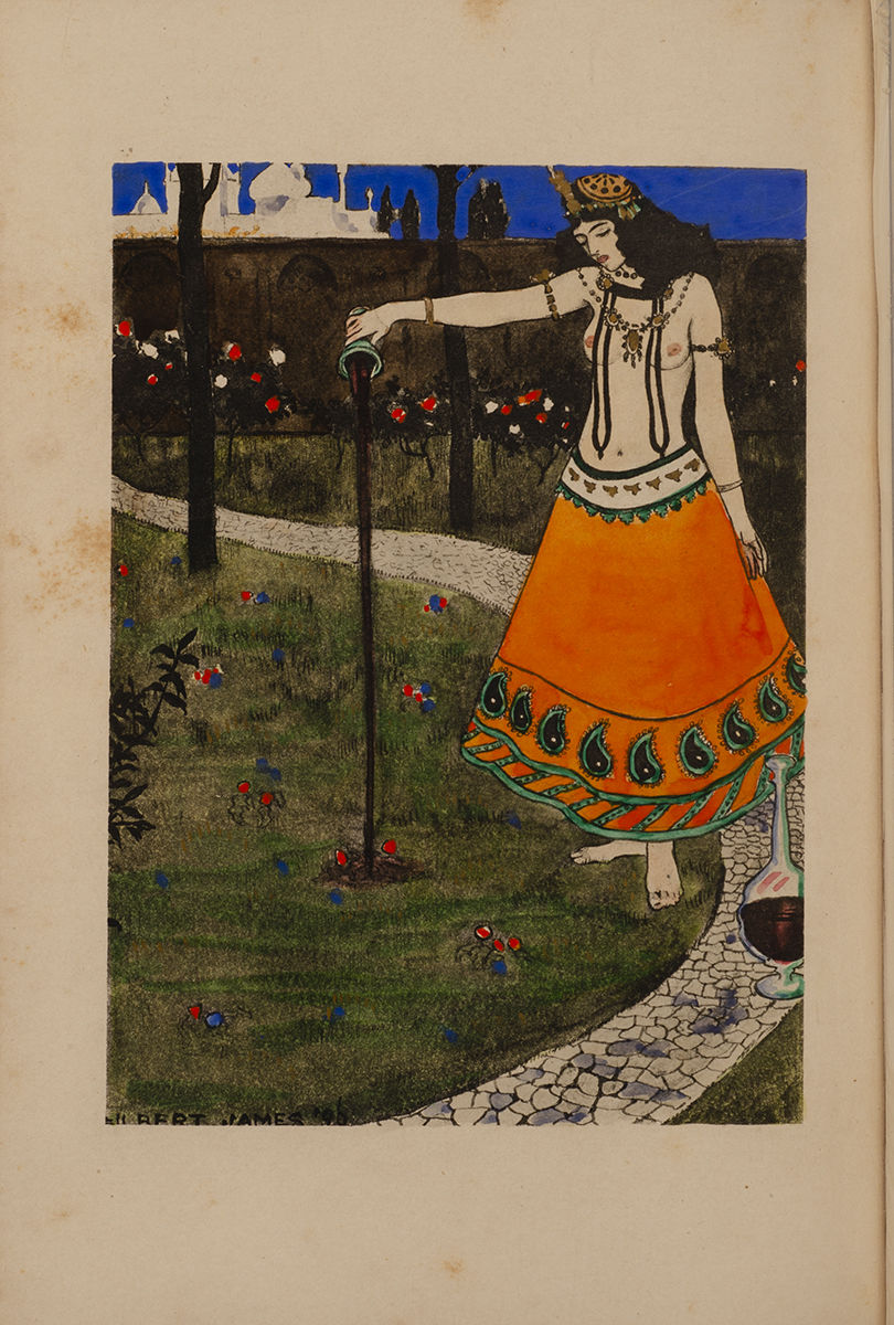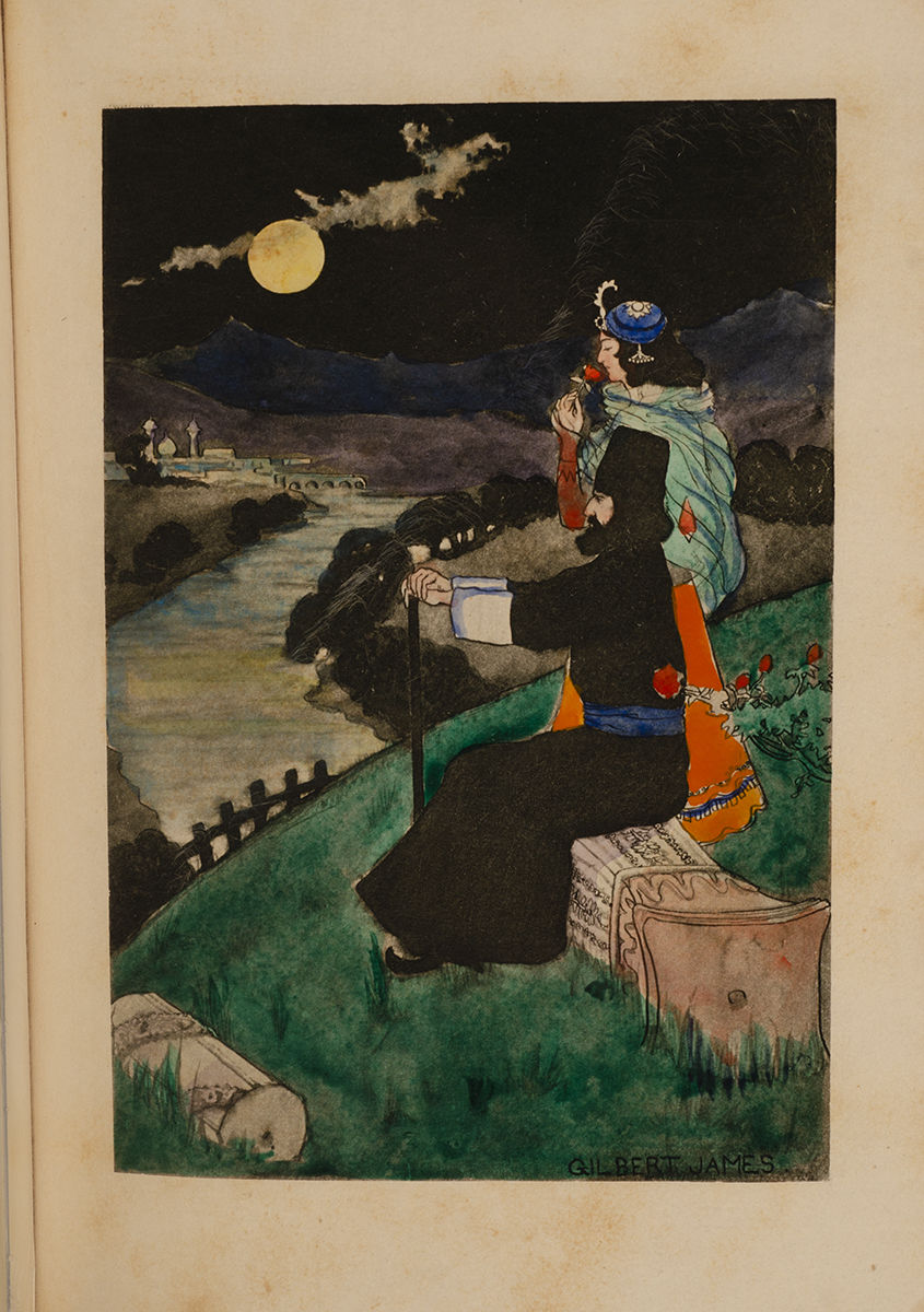 Fitzgerald attributed the original work to the famed astronomer and mathematician Omar Khayyum, and this collection of quatrains rapidly became a favored text of the Pre-Raphaelites. "Like the Odyssey or the Vita Nuova [it] was once the most widely known and quoted work of Victorian poetry in the world," and its place in Western culture at the time was secured by Fitzgerald's "epigrammatic, sophisticated, often mordant verses [that] display Fitzgerald's adroitness in handling this stanza form" (Warner). Yet with rise of Modernism, the Rubaiyat fell out of style for a time, its lush and romantic orientalism considered out of step with the concerns of those who were living through a devastating World War. But the beautiful surviving copies in exceptional vellum, silk, and leather, alongside recently released critical editions, have helped draw attention back to the Rubaiyat's beauty and its role in inspiring so many monumental pieces of Victorian art and literature. Here illustrations by Gilbert James (1865-1941) illustrate the dramatic and sensorial prose.