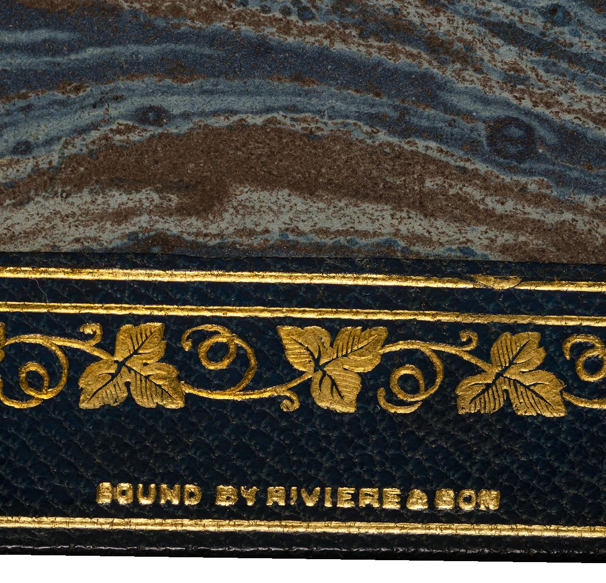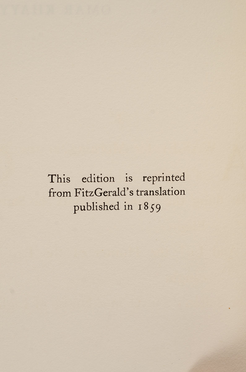 “The Riviere Bindery was one of the most notable and prolific shops in London's West End from about 1840 through 1939” (Princeton). Bath-based Bayntun Bindery acquired the firm in 1939, transforming into the “Bayntun-Riviere bindery,” which is still in existence and family owned. A similar binding (but without the quotations on the borders of both covers) was sold in the Chevalier sale at Christie's New York, Friday November 9th, 1990, lot 63; it had been previously sold to Paul Chevalier by David Brass and then later to another private collector. Loosely inserted in the Chevalier copy was a pencilled note, identified by a second description as being in the hand of George Napier, an Edinburgh collector who commissioned a number of bindings. Napier explains his purchase of the book from Rivière in 1932 and that he commissioned the special border now decorating the book. He adds that "George" at Rivière's explained that the chalice and serpent motif was designed by Alberto Sangorski, brother of George Sangorski the binder, and concludes with the mention of the "Great Omar", which sank with the Titanic.