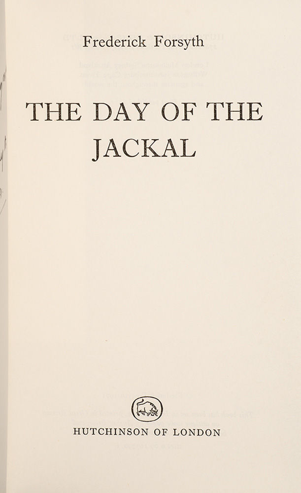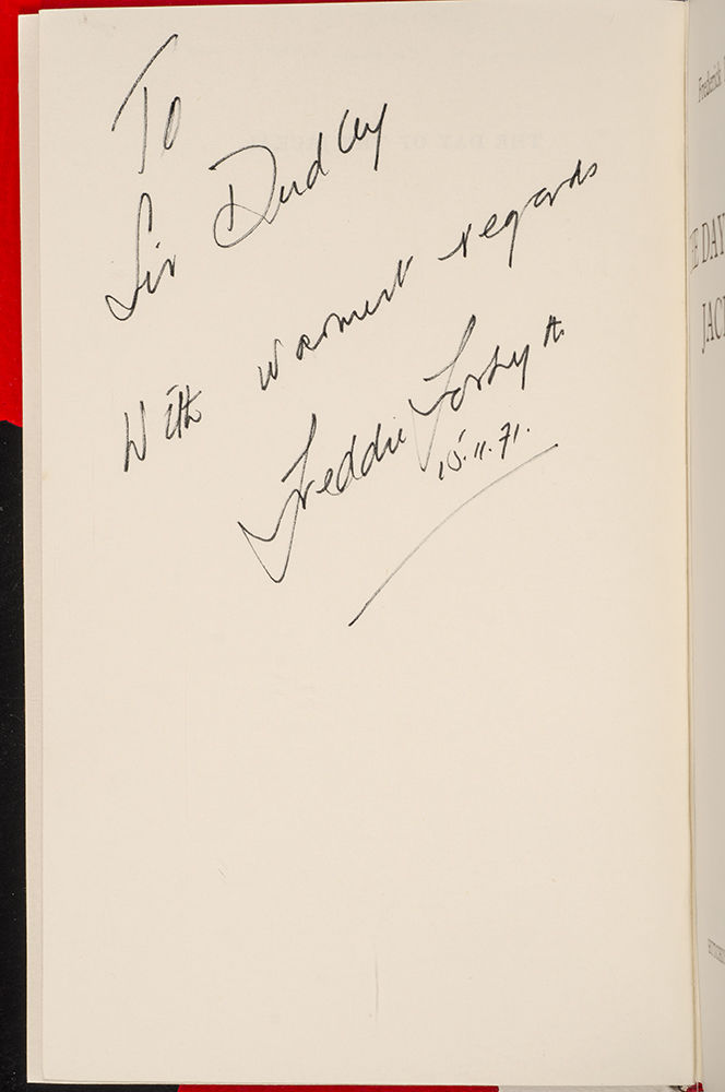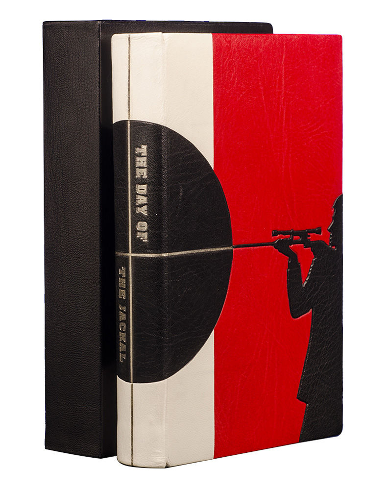 London: Hutchinson, 1971. First edition. Fine. A Fine presentation copy, inscribed by the author on the verso of the half-title "To/Sir Dudley/with warmest regards/Freddie Forsyth/15.11.71." Octavo (8 3/8 x 5 3/16 inches; 213 x 132 mm.). [vi], 358 pp. Pictorially bound likely by Sangorski & Sutcliffe (unsigned), ca. 1980 in full red, blue, black and white oasis morocco, front cover with black morocco onlays and silver rule depicting a marksman and crosshairs, smooth spine lettered in silver, all edges silver, red, blue and white head- and tail bands, patterned red and black end-papers, original dust-jacket preserved at end. Although the binding is unsigned it was specially commissioned by a collector who always used S & S. Housed in the original full black morocco slipcase.