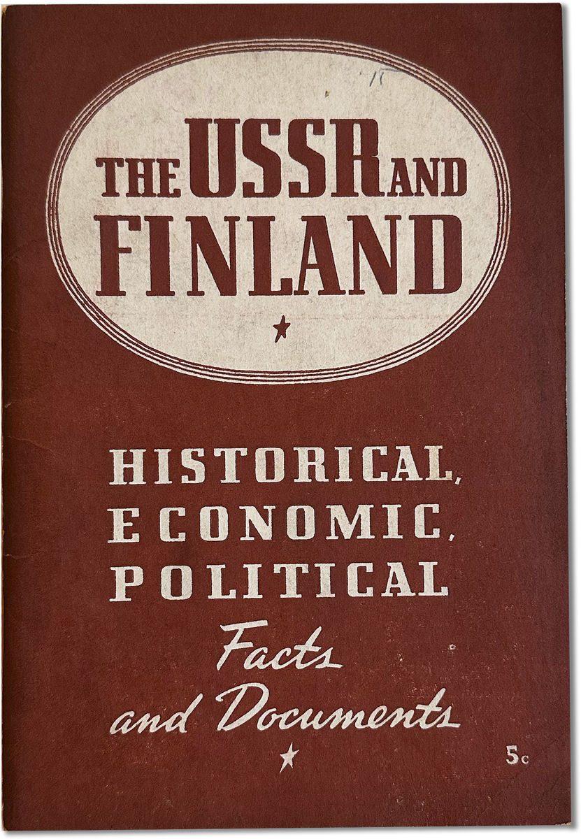 New York: Soviet Russia Today, 1939. First Edition. 12mo. Staple-bound pamphlet. Printed card wrappers; 64pp. Bit of external dusting and soil; Very Good. Pro-Soviet propaganda following the Finnish invasion of November, 1939.