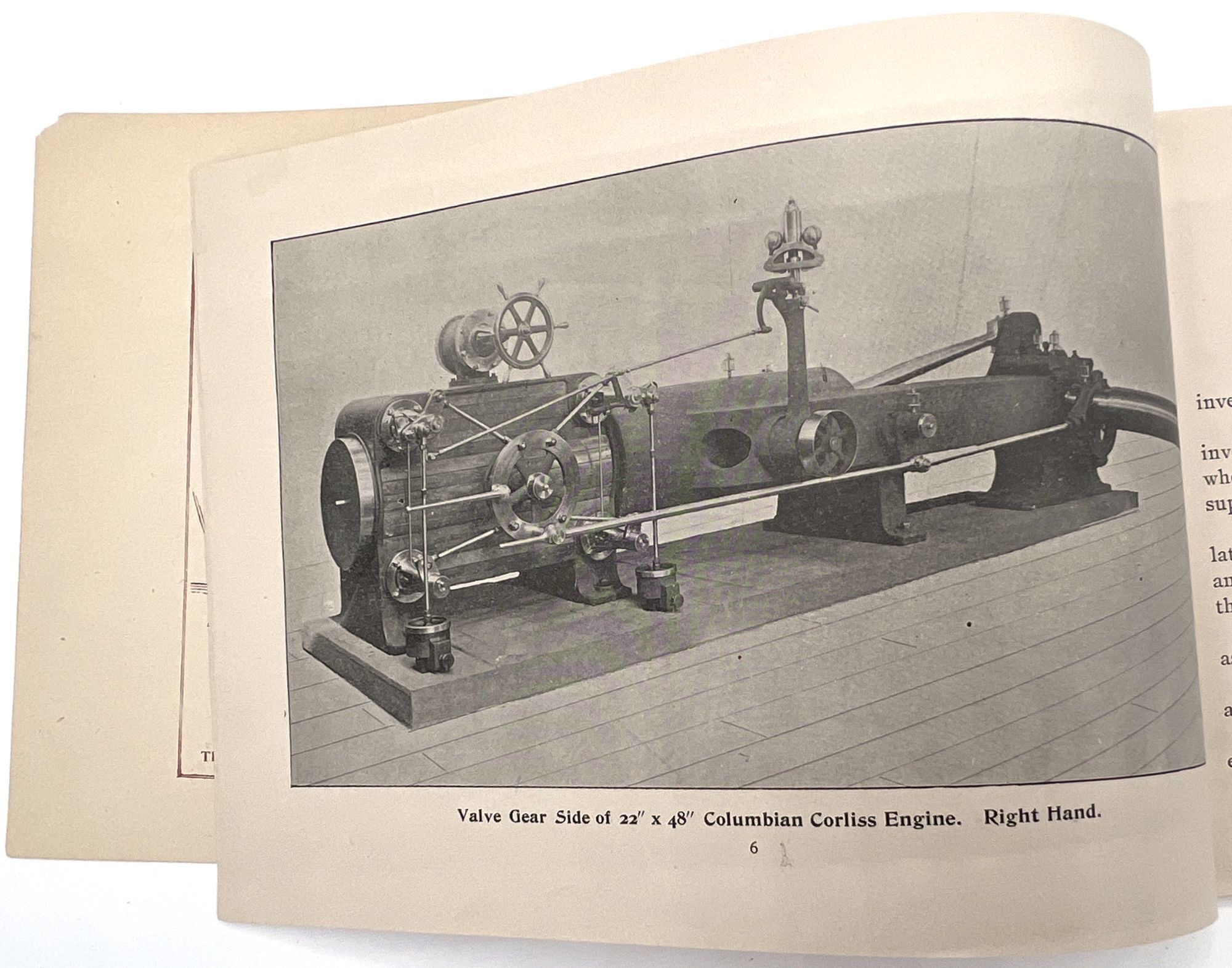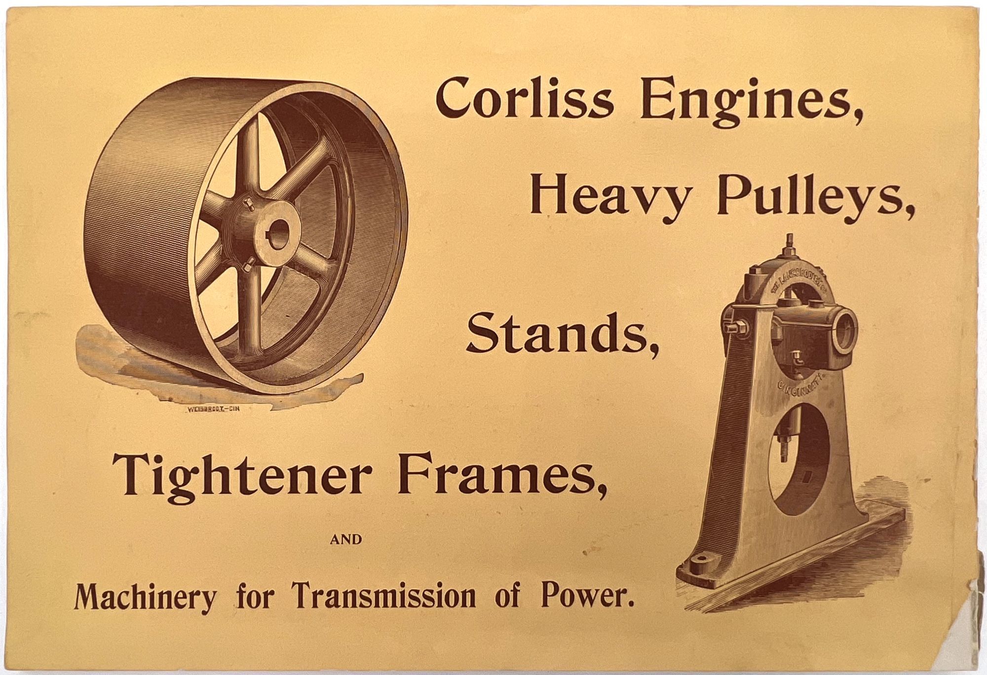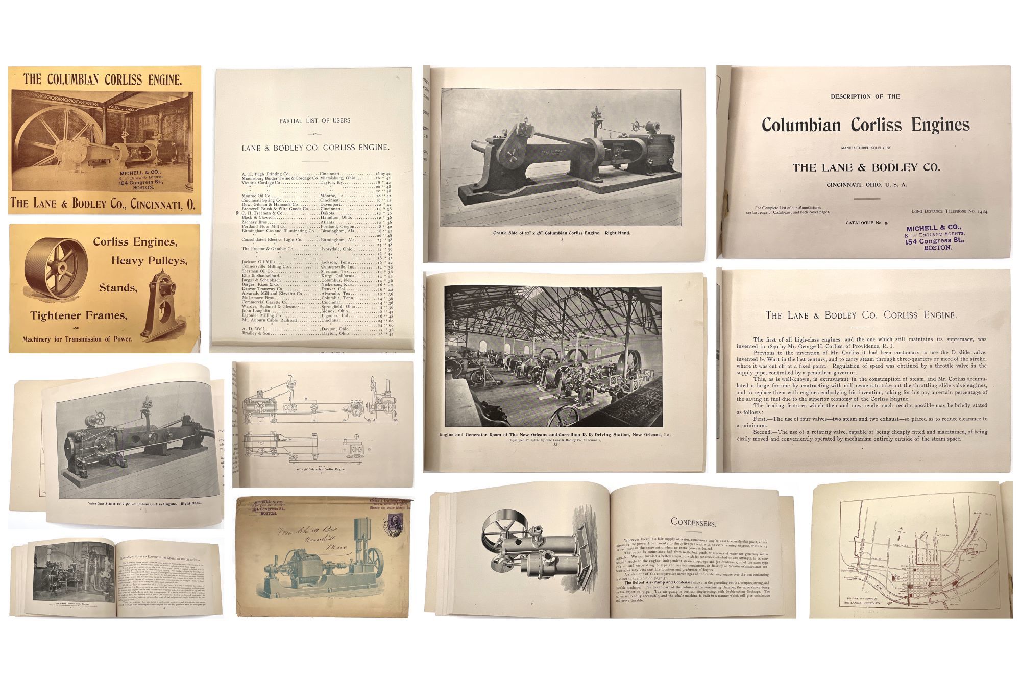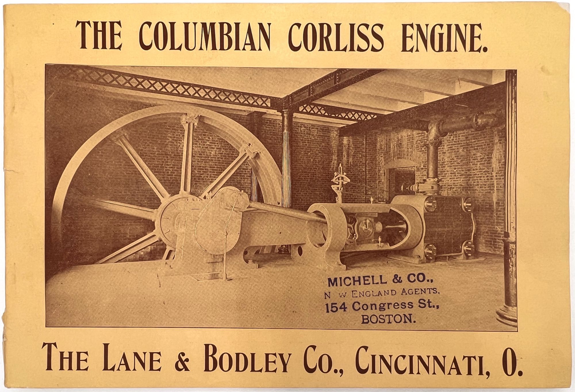 Cincinnati, Ohio: The Lane & Bodley Co, 1895. Very good. Chipping to spine, chip to upper right-hand corner of upper wrapper.. A booklet promoting a new 1895 iteration of the Corliss Engine, a more efficient improvement on existing steam engines developed to power looms, mills, and factories. It was seen as major engineering accomplishment of its time, gaining its namesake, George Henry Corliss, widespread recognition when it was unveiled at the 1876 Centennial Exposition in Philadelphia. The booklet includes photos of the engines and diagrams of their components, with technical specifications and instructions for setting up and adjusting the machinery. Includes a list of manufacturers that use the product in the rear. Single vol. (6" by 9"), pp. 74, illus., stapled in original yellow illus. wrps. with photo of Corliss engine on front. Ink stamps of agent. Offered with original mailing envelope, illustrated with a large engraving of what appears to be a large motor on the front.