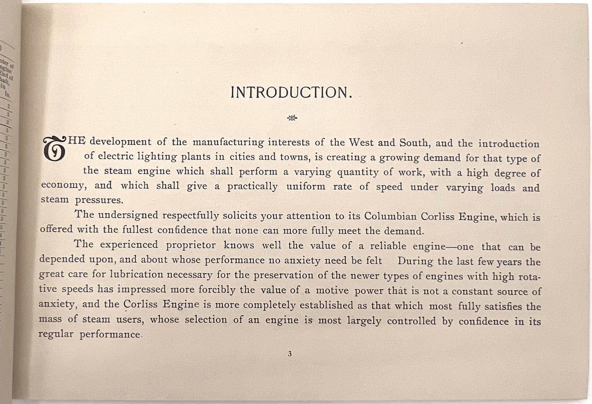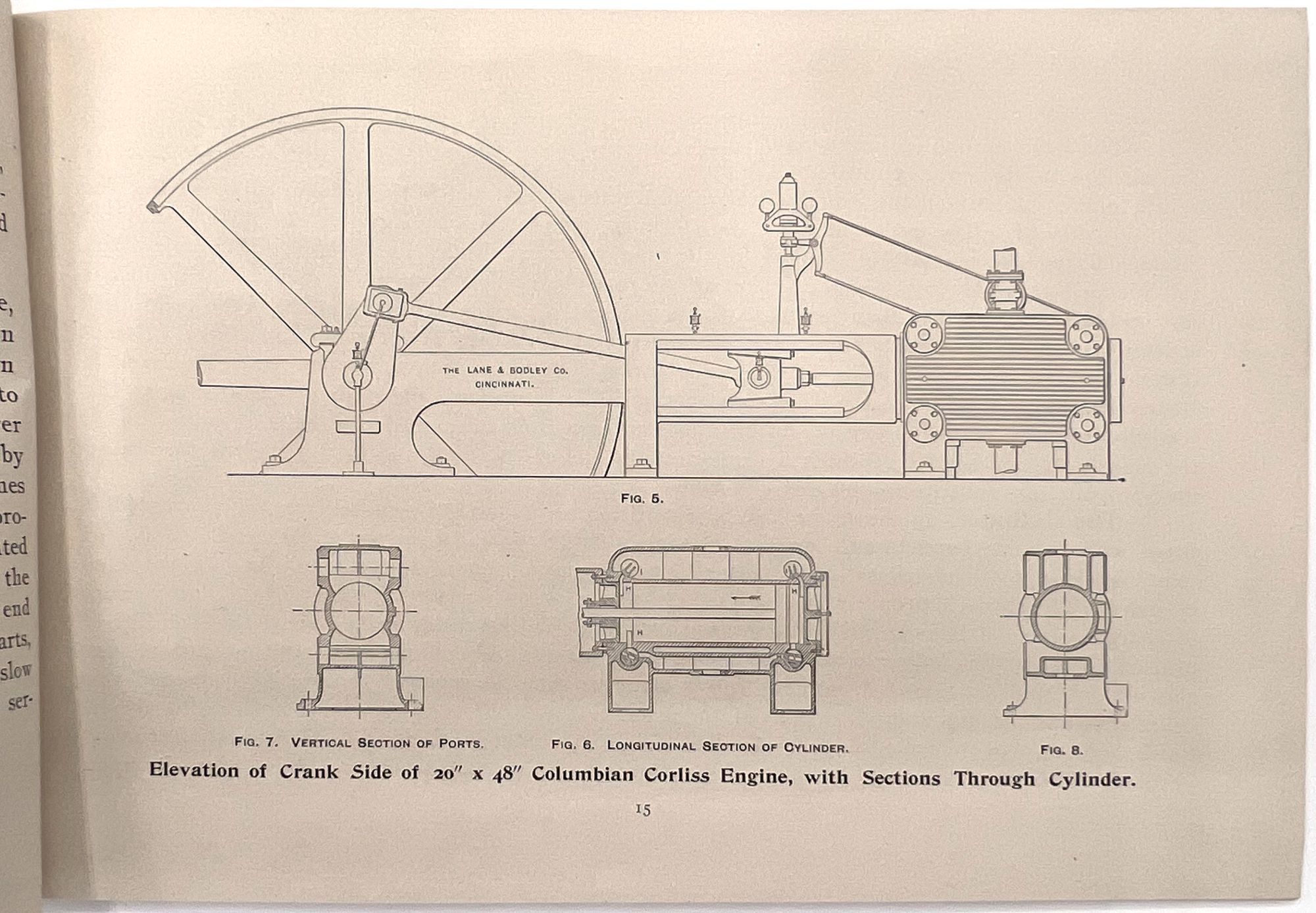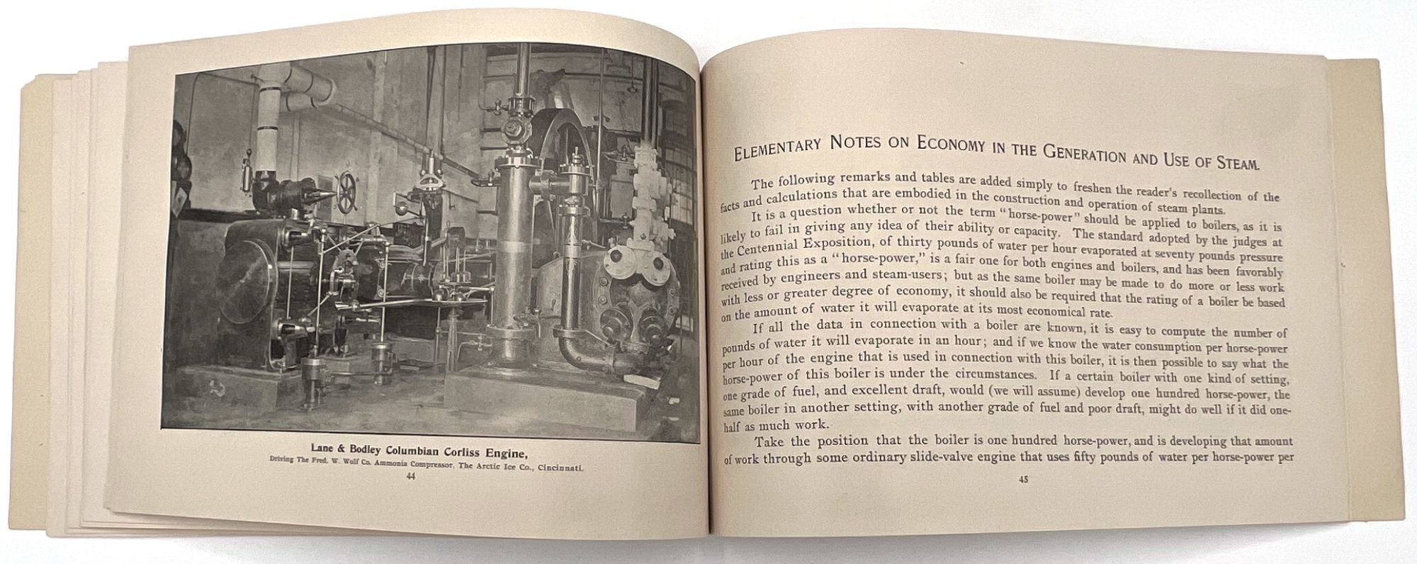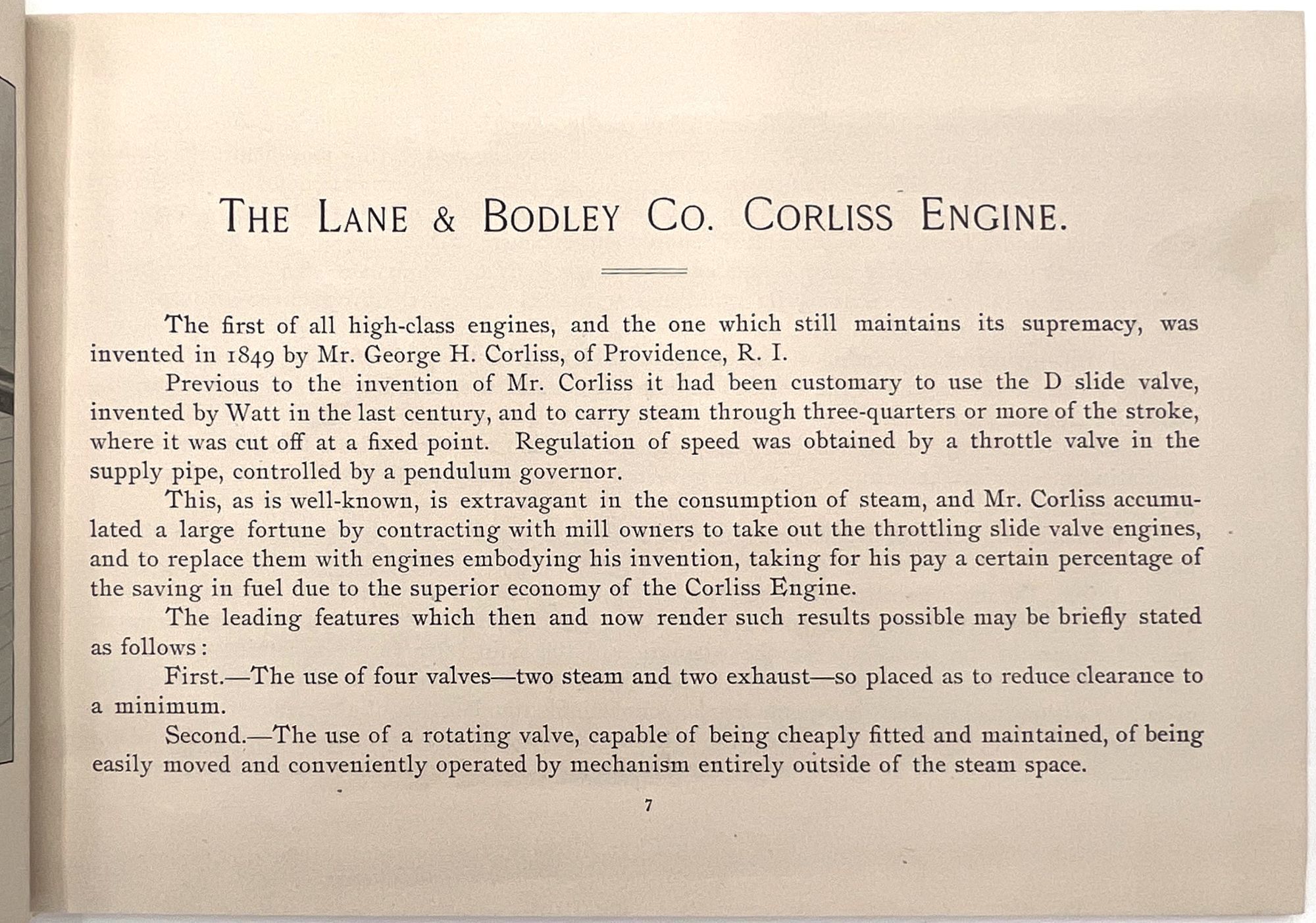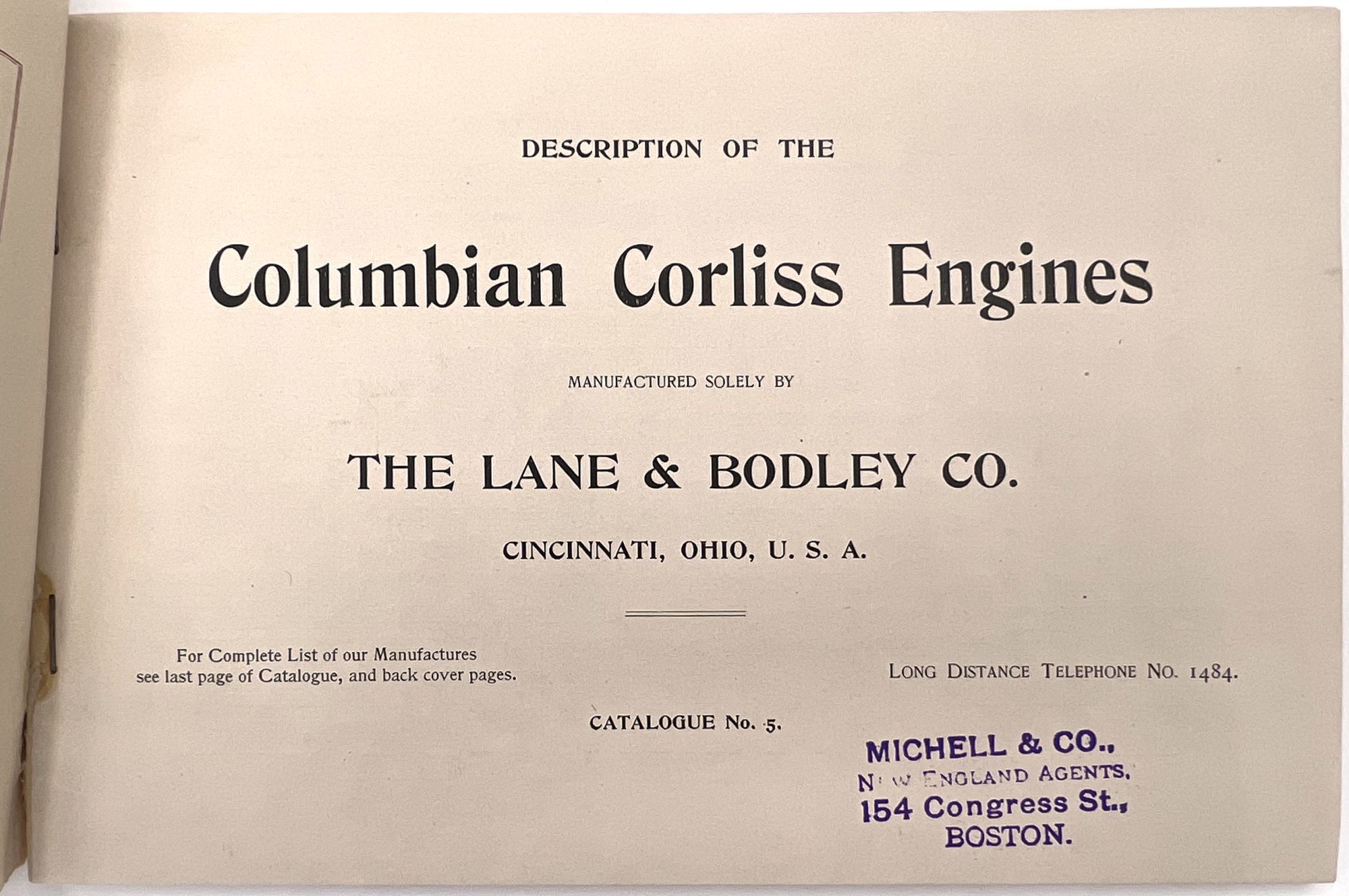Cincinnati, Ohio: The Lane & Bodley Co, 1895. Very good. Chipping to spine, chip to upper right-hand corner of upper wrapper.. A booklet promoting a new 1895 iteration of the Corliss Engine, a more efficient improvement on existing steam engines developed to power looms, mills, and factories. It was seen as major engineering accomplishment of its time, gaining its namesake, George Henry Corliss, widespread recognition when it was unveiled at the 1876 Centennial Exposition in Philadelphia. The booklet includes photos of the engines and diagrams of their components, with technical specifications and instructions for setting up and adjusting the machinery. Includes a list of manufacturers that use the product in the rear. Single vol. (6" by 9"), pp. 74, illus., stapled in original yellow illus. wrps. with photo of Corliss engine on front. Ink stamps of agent. Offered with original mailing envelope, illustrated with a large engraving of what appears to be a large motor on the front.