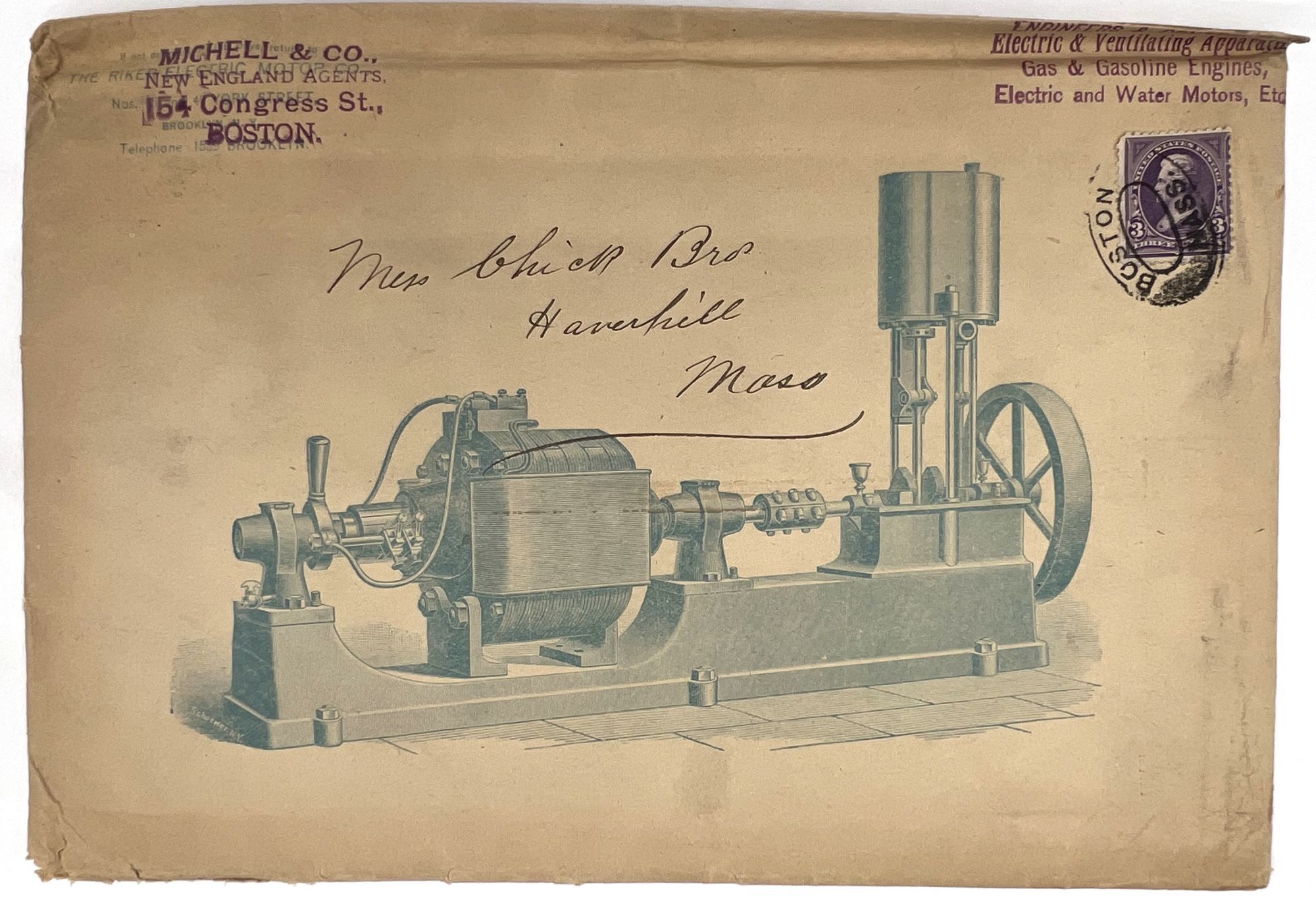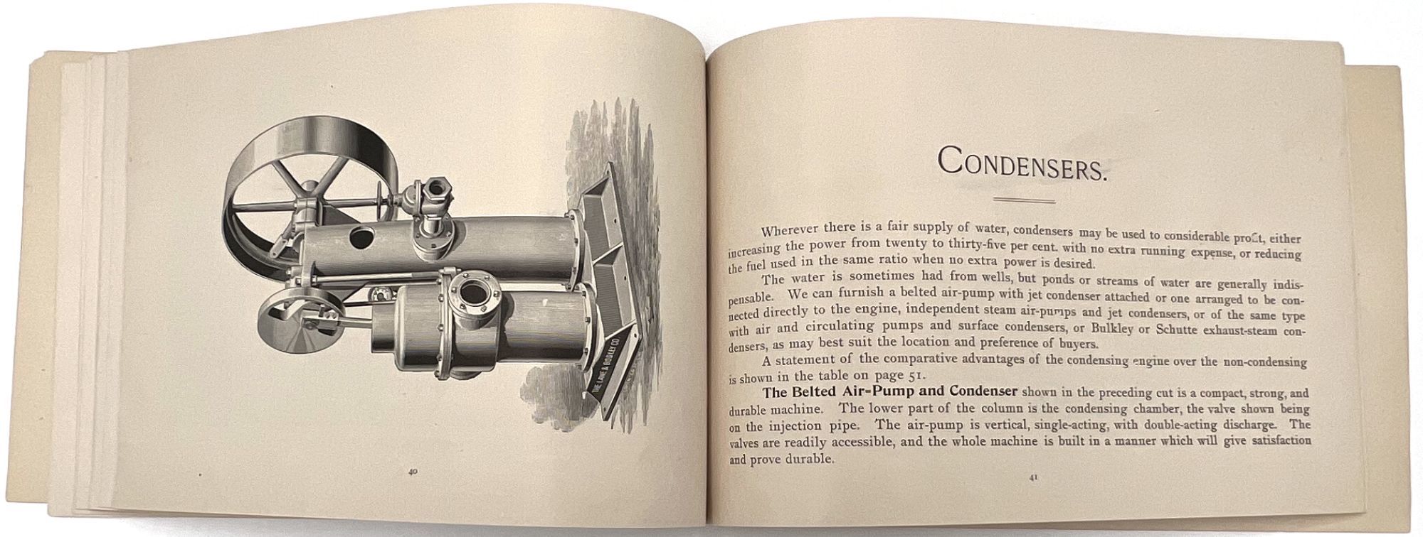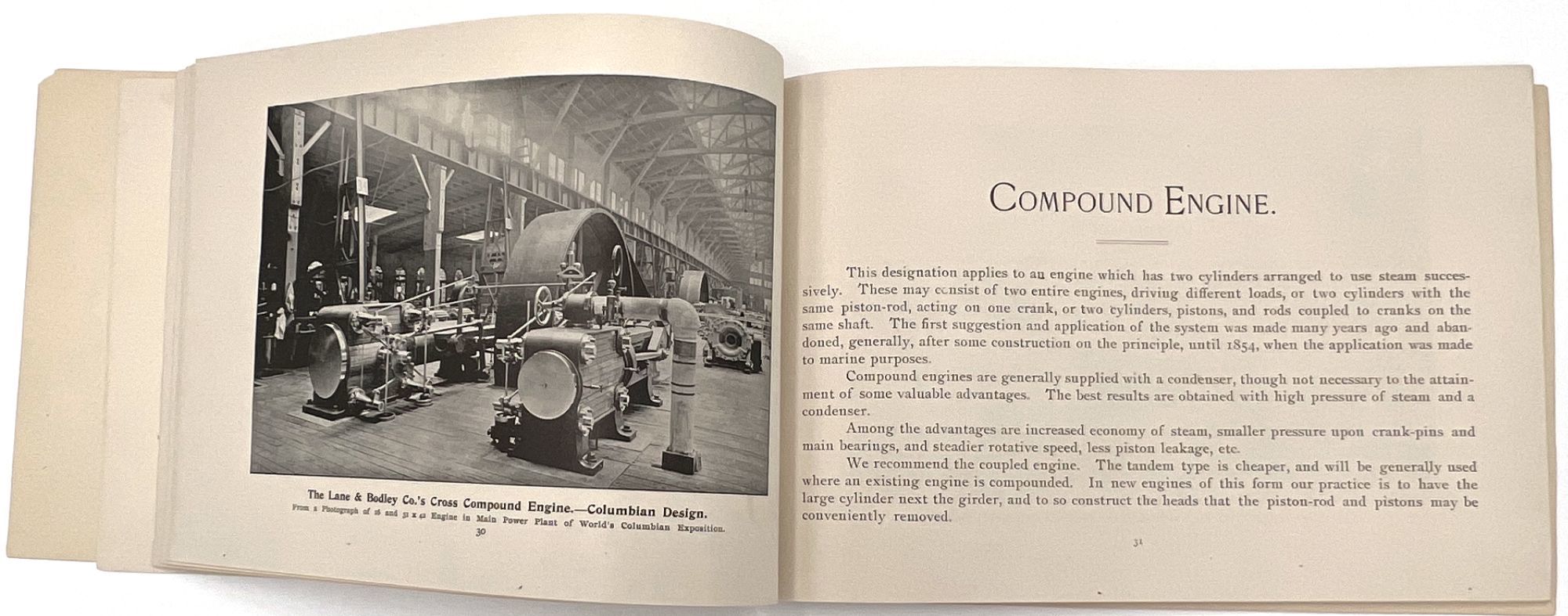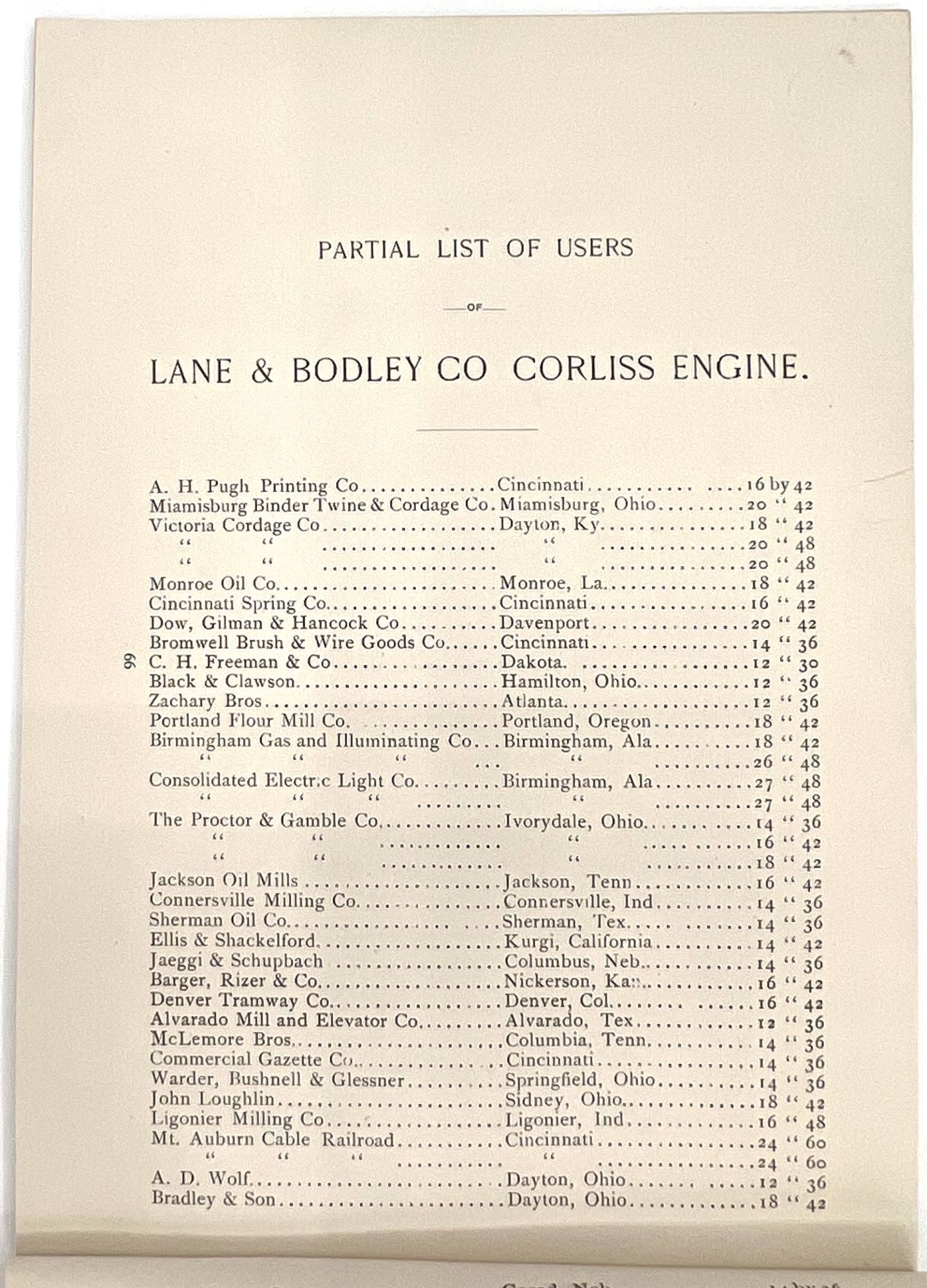 Cincinnati, Ohio: The Lane & Bodley Co, 1895. Very good. Chipping to spine, chip to upper right-hand corner of upper wrapper.. A booklet promoting a new 1895 iteration of the Corliss Engine, a more efficient improvement on existing steam engines developed to power looms, mills, and factories. It was seen as major engineering accomplishment of its time, gaining its namesake, George Henry Corliss, widespread recognition when it was unveiled at the 1876 Centennial Exposition in Philadelphia. The booklet includes photos of the engines and diagrams of their components, with technical specifications and instructions for setting up and adjusting the machinery. Includes a list of manufacturers that use the product in the rear. Single vol. (6" by 9"), pp. 74, illus., stapled in original yellow illus. wrps. with photo of Corliss engine on front. Ink stamps of agent. Offered with original mailing envelope, illustrated with a large engraving of what appears to be a large motor on the front.