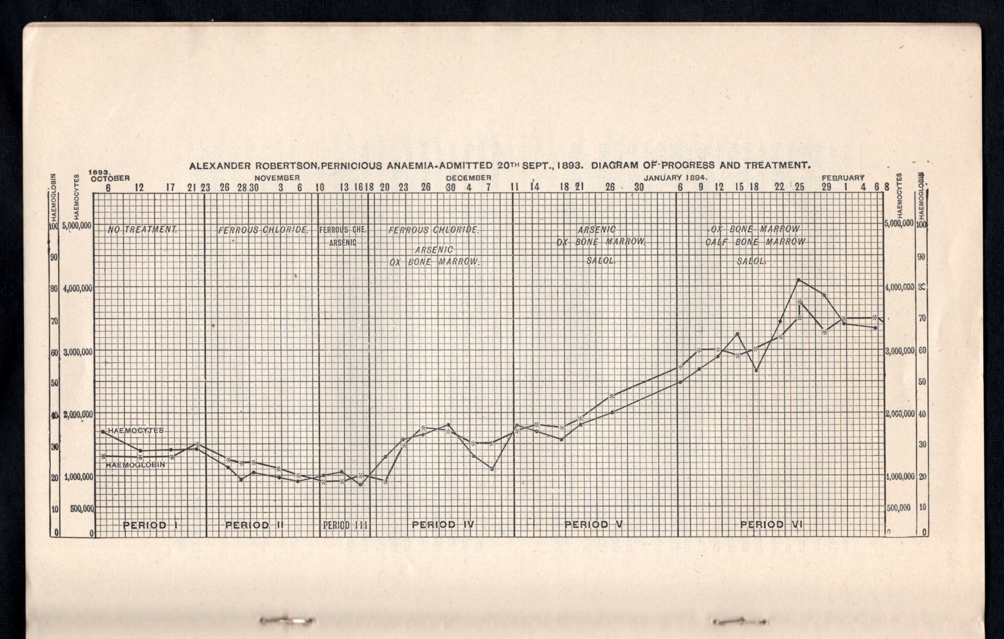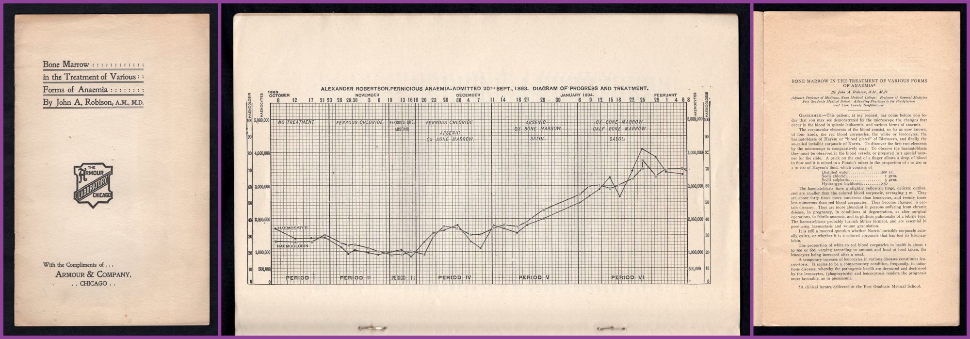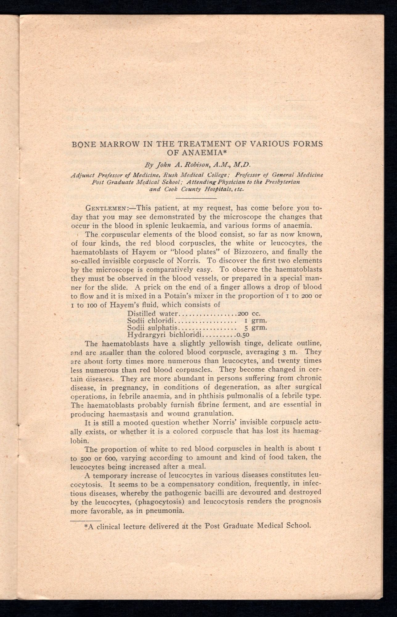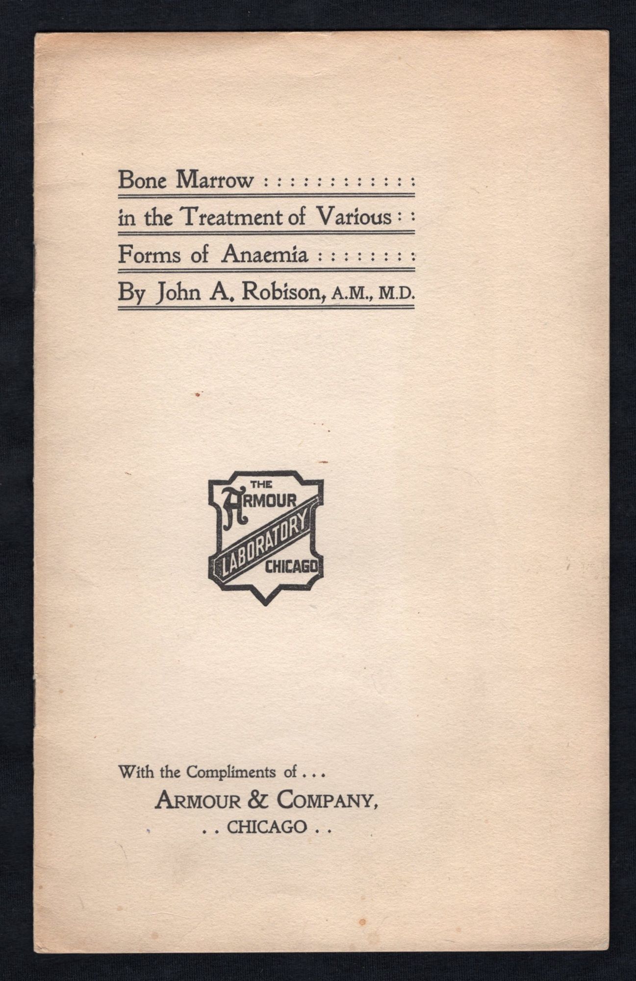 Chicago, IL: Armour & Company, 1896. General wear and toning due to age. This booklet is the printed copy of a clinical lecture given by Dr. John Albert Robinson (1855-1942) on an unknown date to the Chicago Post Graduate Medical School. The lecture was about his his use of bone marrow in not only the treatment of anaemia, but also splenic leukaemia. The lecture appears to have have been delivered with one of his patients in attendance, and on stage with him. Includes chart of case studies. Also in addition to the text of the lecture are three charts and/or graphs. At the end is a printed advertisement for Armour Laboratory, owned by Armour & Company, for several of its medications. 11 pgs. Printed wrappers. Staple binding. OCLC 3 (February 2021). Measures 9 1/4" x 5 3/4" The Chicago Post Graduate Medical School was founded by Dr. Franklin H. Martin (1857-1935) in 1889. There is little information to be found on the school, except for web sites which detail Martin's biography and his founding of the American College of Surgeons. It is unclear if the Chicago Post Graduate Medical School remained a separate entity or eventually came to be a part of the American College of Surgeons.