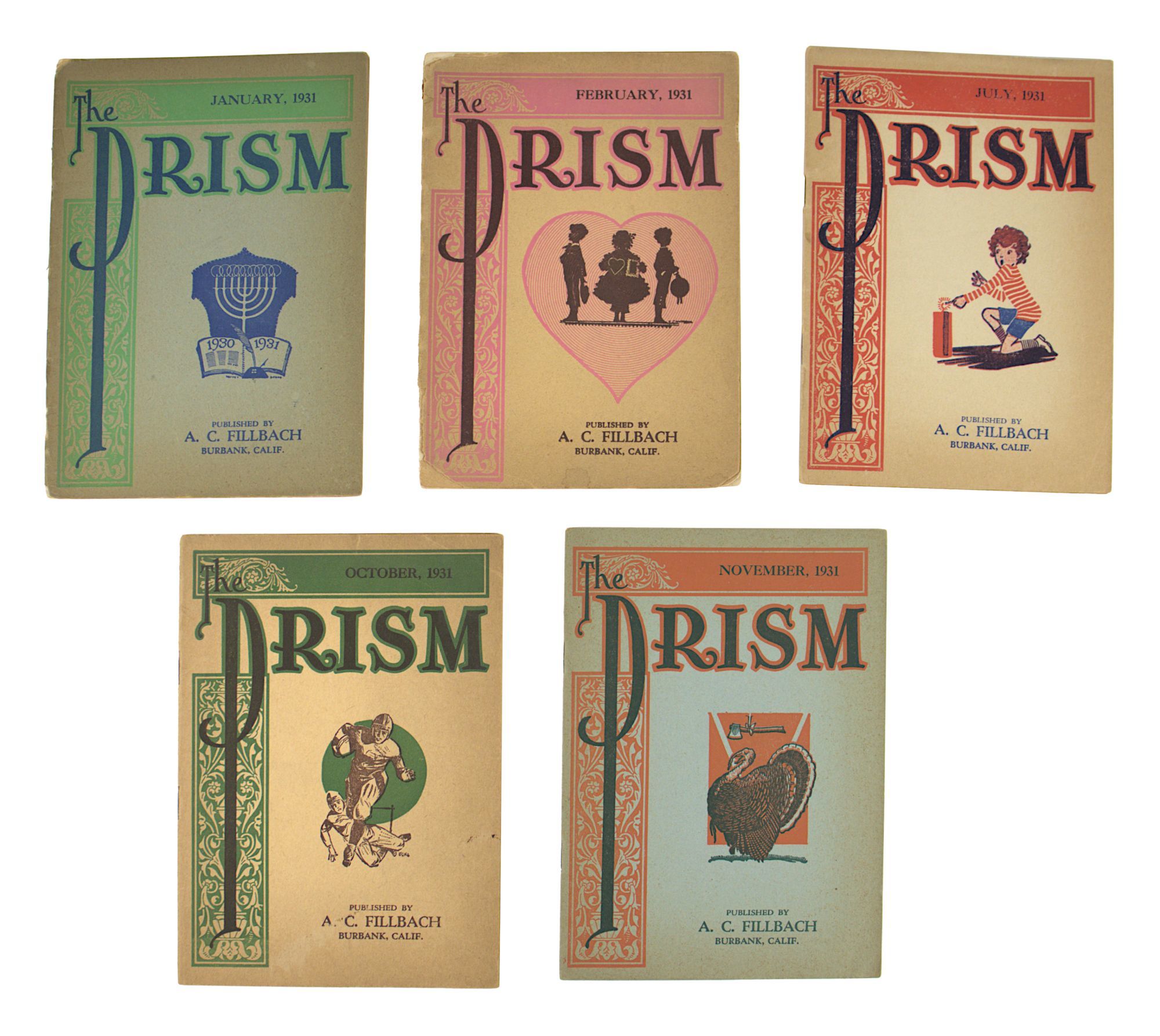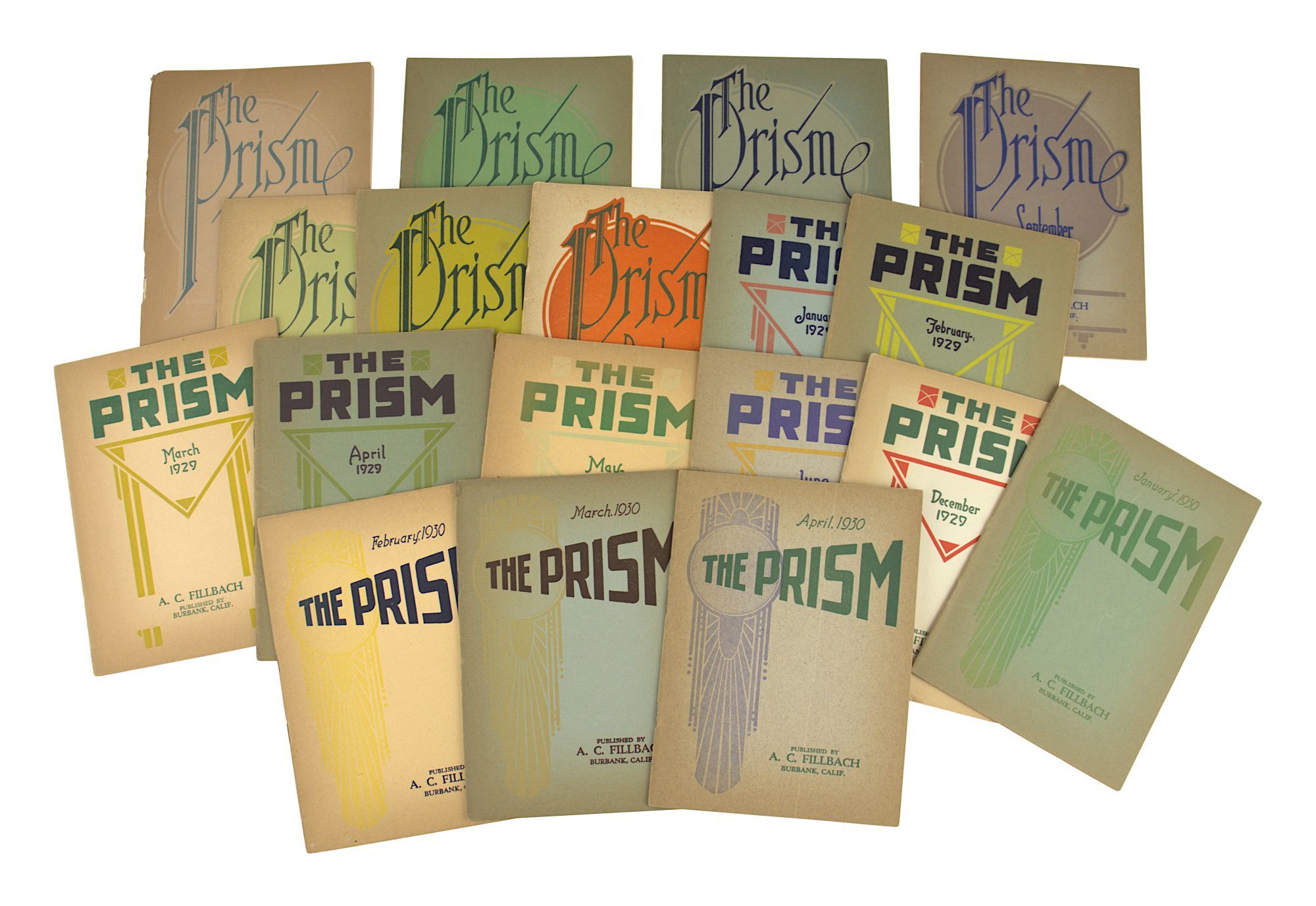 Promotional magazine produced for use by funeral homes, here “published by” A.C. Fillbach, whose Burbank funeral home opened in 1919, though we have also found scattered examples of The Prism dated between 1923 up to 1951 appearing as published by other mortuary firms: T.B. Olroyd & Sons (Arkansas City), Fort Worth Undertaking Co., Charles B. Cook (Austin), Hallet & Hallet, Inc (Long Island / Flushing), and Clarence C. Cooper (Oakland). While the overall contents remained uniform, the magazine appears to have been customizable by the larger publisher to fit the firm subscribing — cover designs of the other examples we found vary in style, featuring their company’s name on front cover and their small advert inside, with the mortician’s vignette portrait swapped out on the first page. Our Fillbach run begins in June 1928 with Vol. I, Number I, though earlier issues for other mortuaries show later numbering, suggesting the volume numbering would begin fresh when your mortuary subscribed.