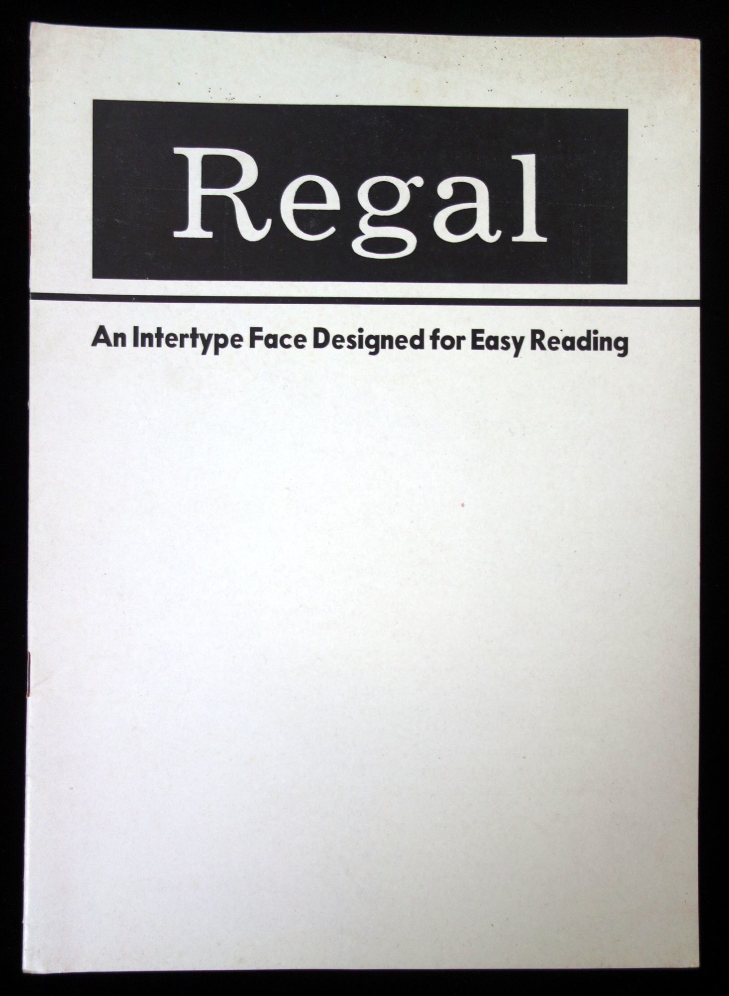 New York: Intertype Corporation, 1950. white paper back cover. Sample booklet of Regal intertype face, brief description of the type then examples of font and samples of advertisements using type. 10 1/2" x 7 1/2
