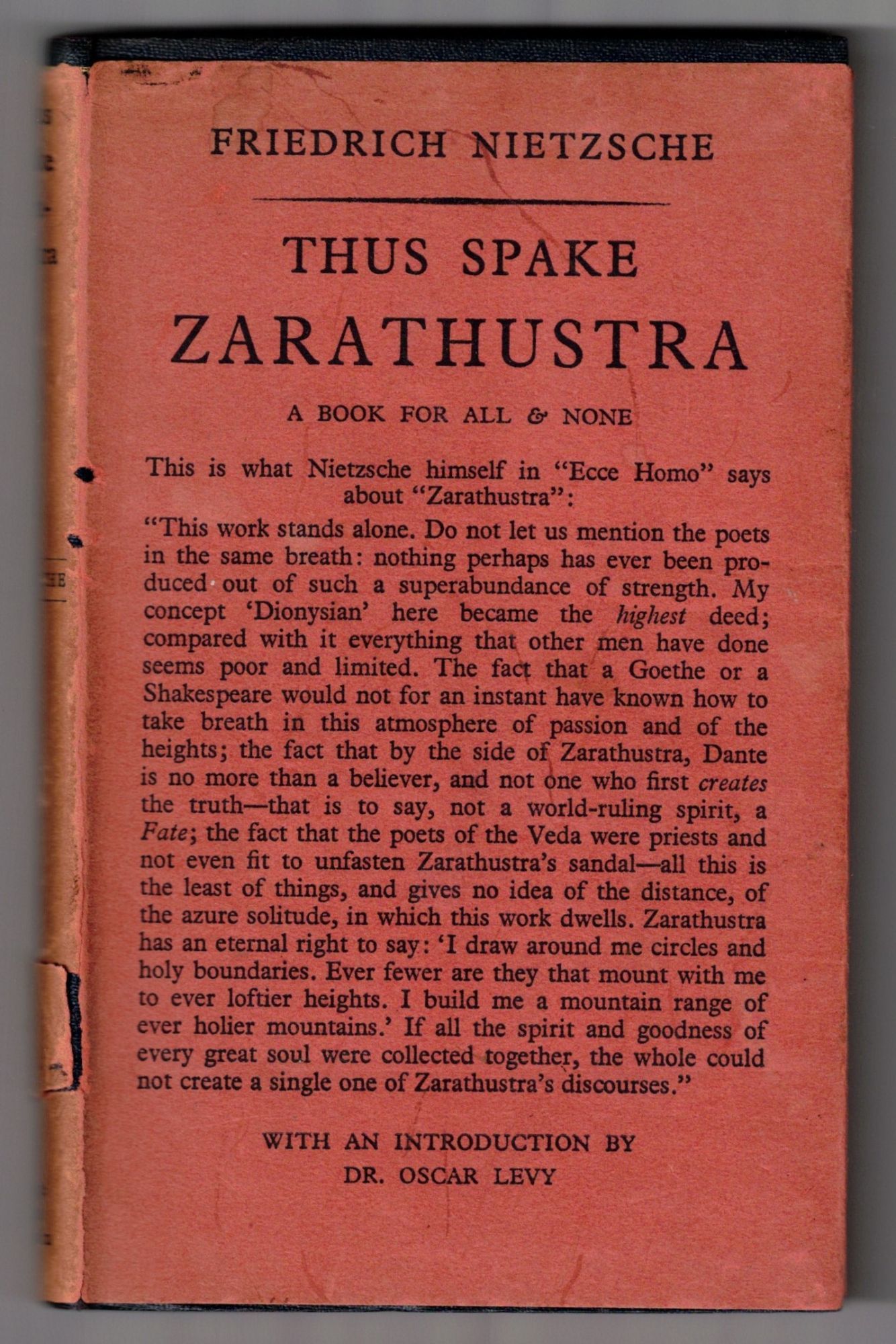 London: George Allen & Unwin Ltd, 1932. Sixth edition, revised translation, pocket edition. Very Good +. 364pp. Sextodecimo [17 cm] Blue cloth over flexible thin card boards. Publisher's blue topstain. In a price-clipped dust jacket, with a 1 1/2" closed chip and two tiny open tears to the surface of the spine, a thin loss at the head of the spine, darkening to the spine, and a small amount of staining/soiling to the panels. Despite these flaws, this scarce jacket is actually quite attractive. A revised translation, considerably improved. With an Introduction by Dr. Oscar Levy.