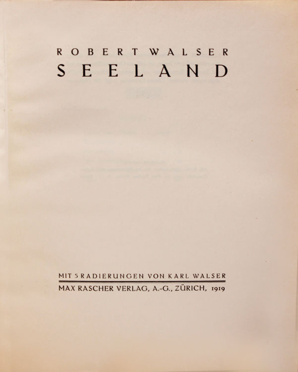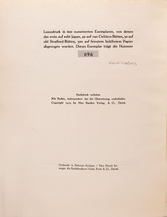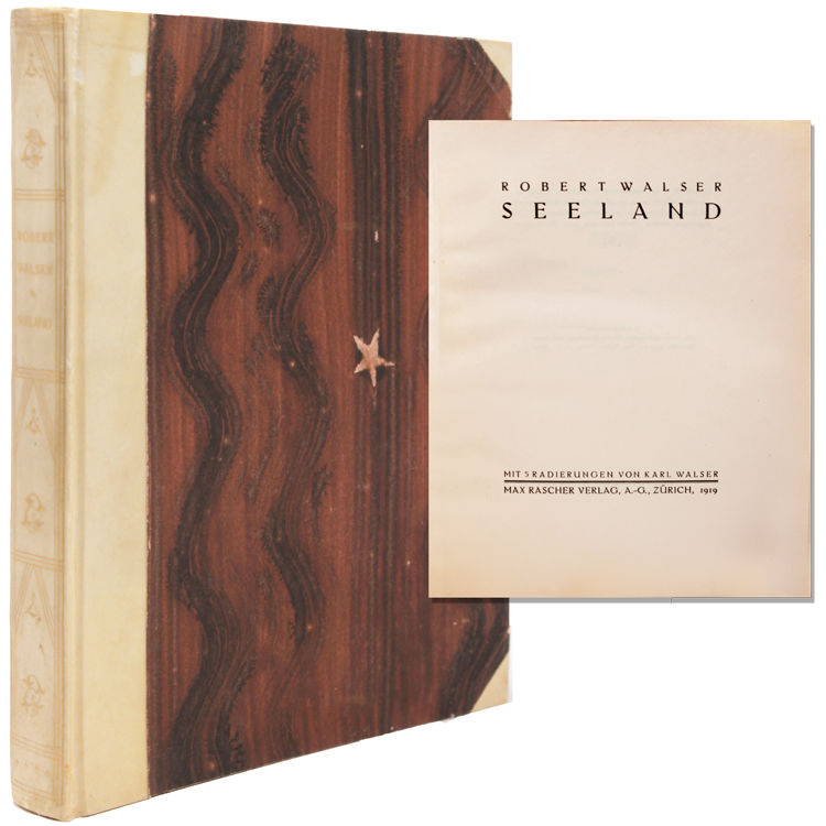 Zürich: Max Rascher, 1920. First edition. No. 96 of 500 copies on feinstem holzfreiem Papier (finest wood-free paper), signed by the artist. Total edition of 600. With five plates, original etchings by Karl Walser. 247 pp. 1 vols. 4to. Original quarter parchment gilt and wood grained paper over boards, t.e.g. Very good (some very light scholarly annotations and translations in margins in pencil throughout). First edition. No. 96 of 500 copies on feinstem holzfreiem Papier (finest wood-free paper), signed by the artist. Total edition of 600. With five plates, original etchings by Karl Walser. 247 pp. 1 vols. 4to. Five stories by Robert Walser (1878-1956), illustrated by his brother, and the second book of Walser’s published by Rascher. Paul Cassirer was a principal of the publishing firm, the emphasis of which was publication of the artist Karl Walser. Becuase of Karl’s ill-health book was delayed until Autumn, 1920. Only the first hundred copies of this issue are reported to have been signed by the artist. Wilpert/Gühring 15; Schäfer 14; Badorrek-Hoguth A 32.1
