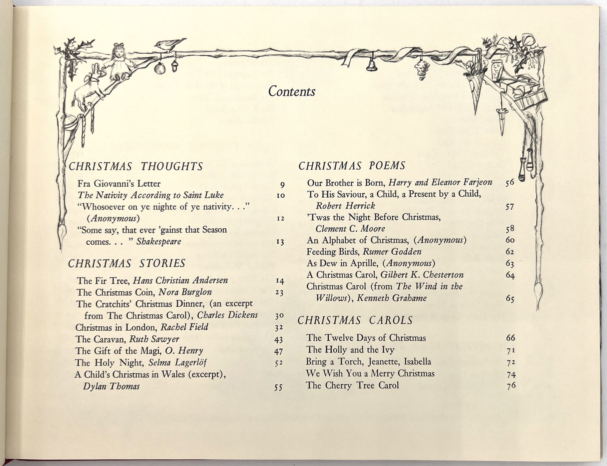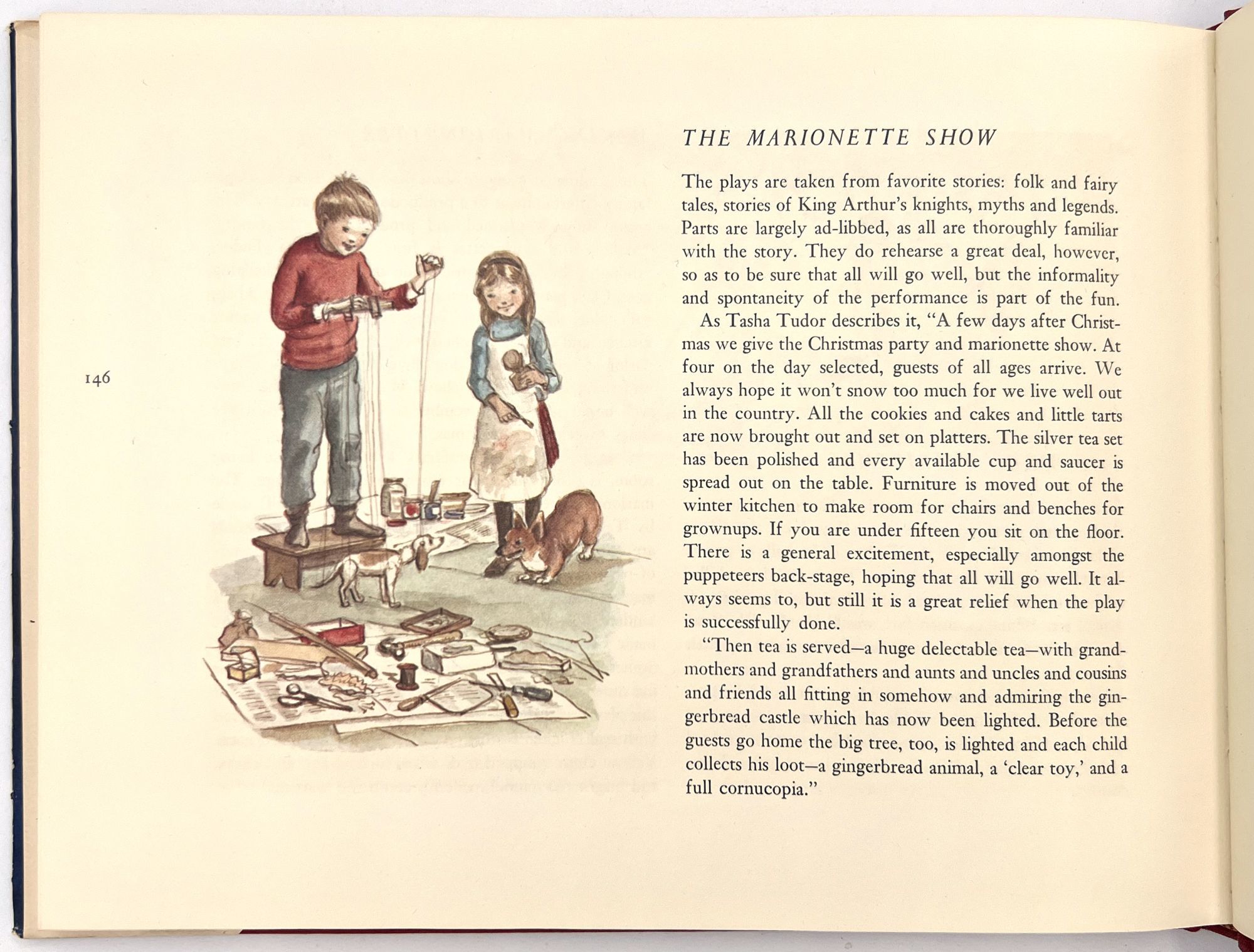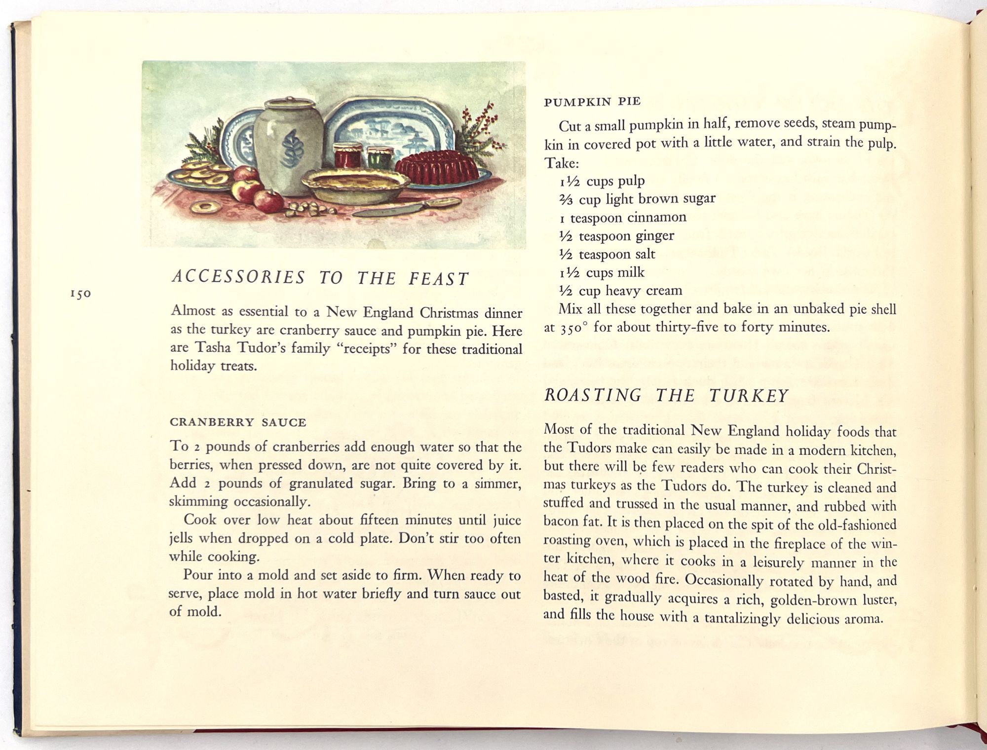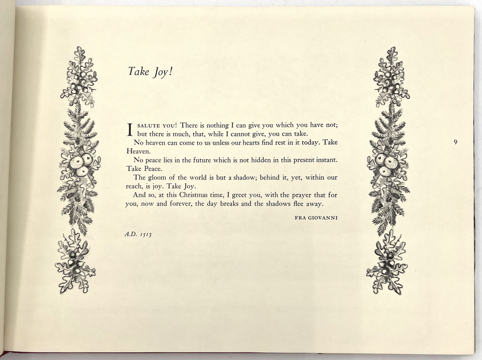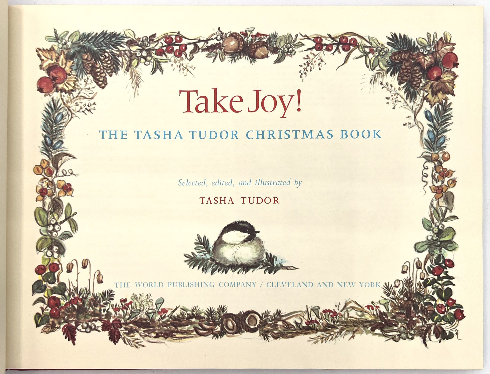 Cleveland and New York: The World Publishing Company, 1966. Very good. Some wear and minor chipping to dust jacket extremities. Internally fine.. First edition of Tasha Tudor's Christmas book "Take Joy!" in an early printing, featuring the blue dust jacket with $4.95 price on upper dust jacket flap, with opposite lower corner clipped. Includes six sections: Christmas Thoughts; Christmas Stories; Christmas Poems; Christmas Carols; Christmas Lore and Legends; and Tasha Tudor's Christmas. Includes musical notation for the carols, and, most charmingly, recipes for pumpkin pie and cranberry sauce. Index in rear. Single vol. (8.5" by 11.5"), pp. 157, [3], illus., in original publisher's red cloth stamped in gold and black with decorated endpapers. Contemporary inscription "From Mother" in black ball point pen to front free endpaper recto.