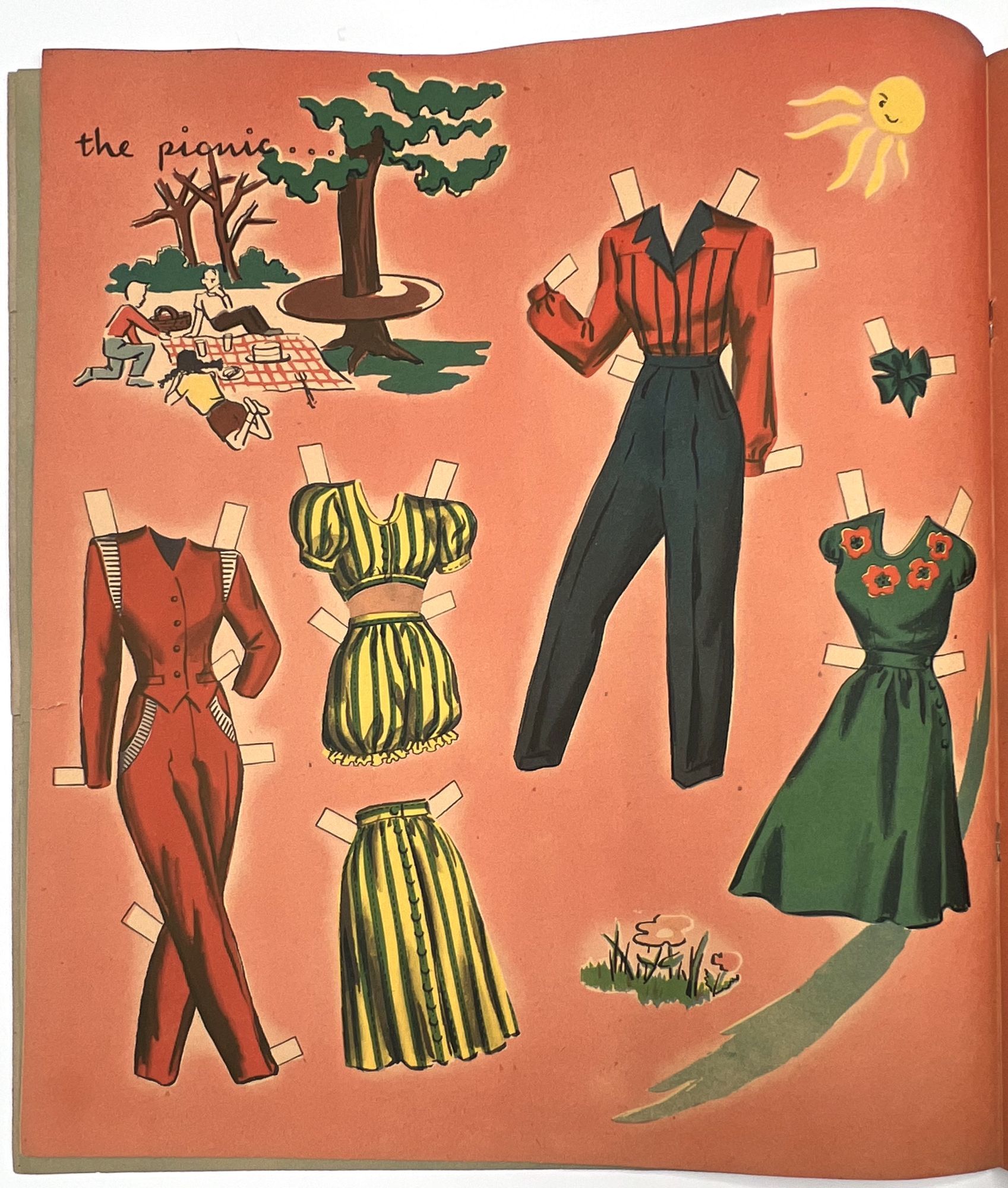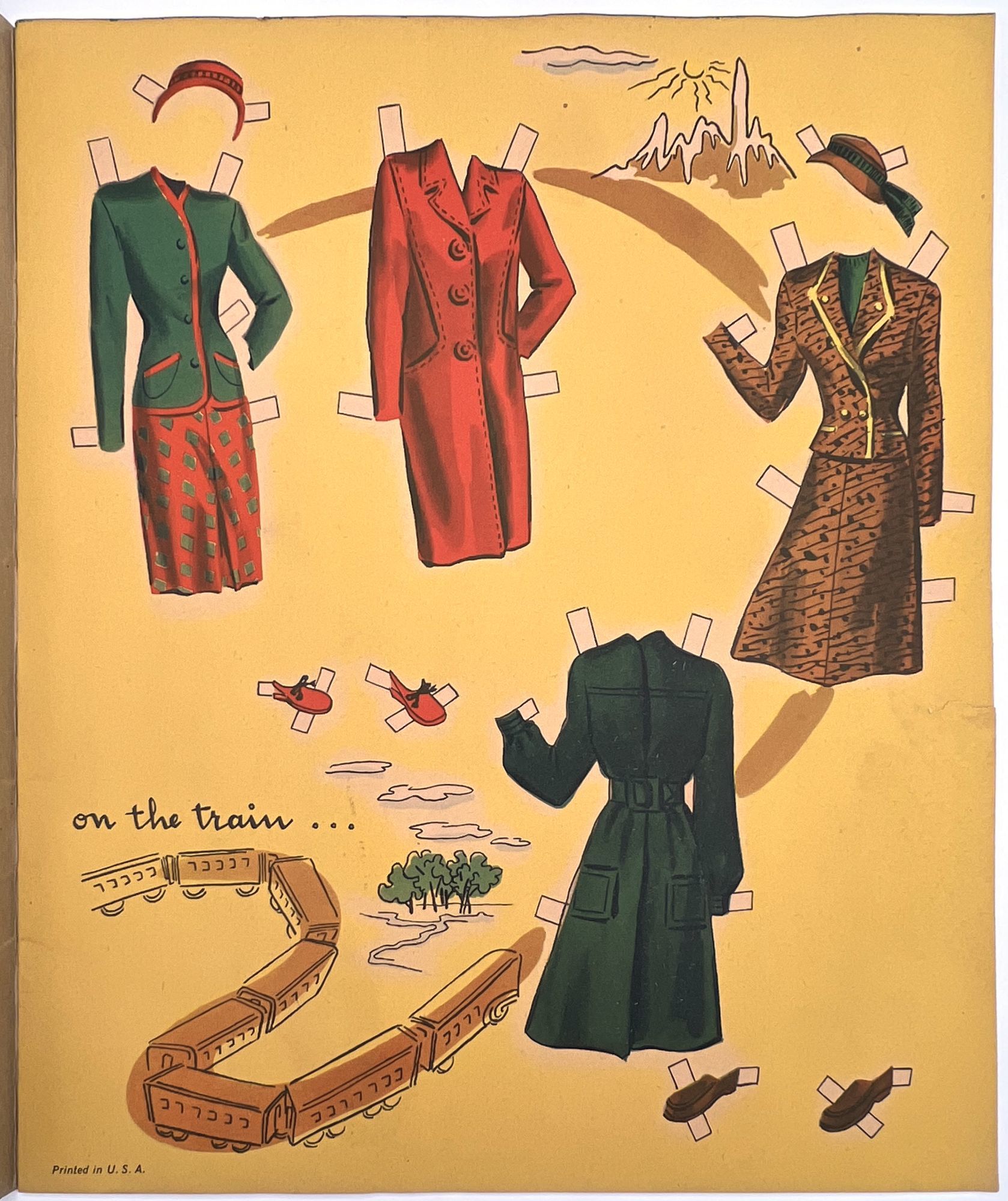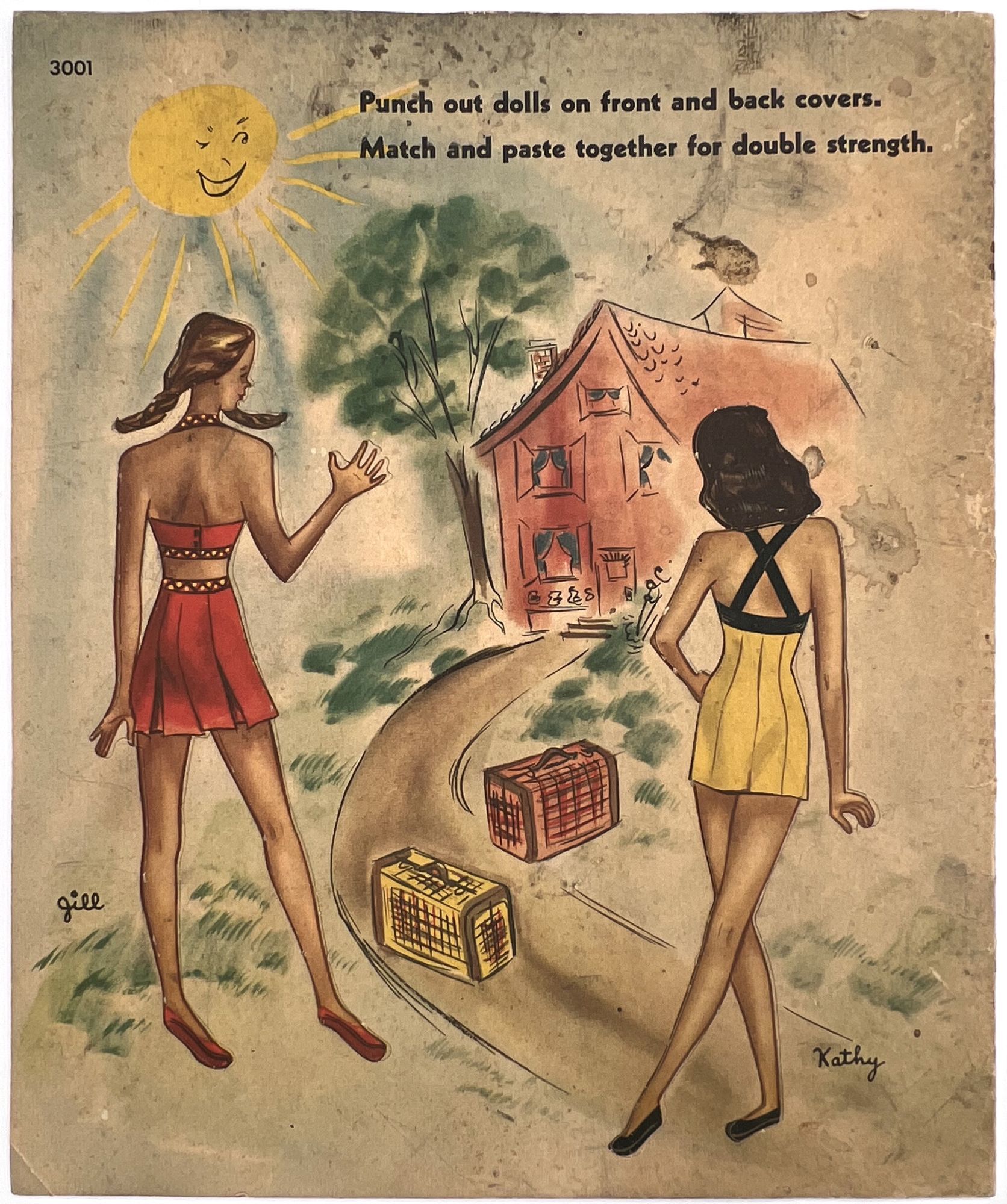 Chicago, Illinois: Children's Press, Inc, 1946. Very good. Some dust soiling, large closed short tear to right-hand edge. Water stains.. A charming 1940s uncut paper doll book with two approx. 8" paper dolls, each made from a front and back punched out from the upper and lower covers. Contains eight (8) leaves of uncut paper doll outfits for the two friends to wear while traveling on the train, while riding and swimming, on pic-nic, fishing, at dinner and on a hay ride. The final leaf has formal wear for them to wear while going to a dance with handsome young gentlemen. Each page with illustrations depicting the activity. Single vol. (13" by 10.75"). Although advertised as "Double Strong" the paper and wraps are somewhat fragile.