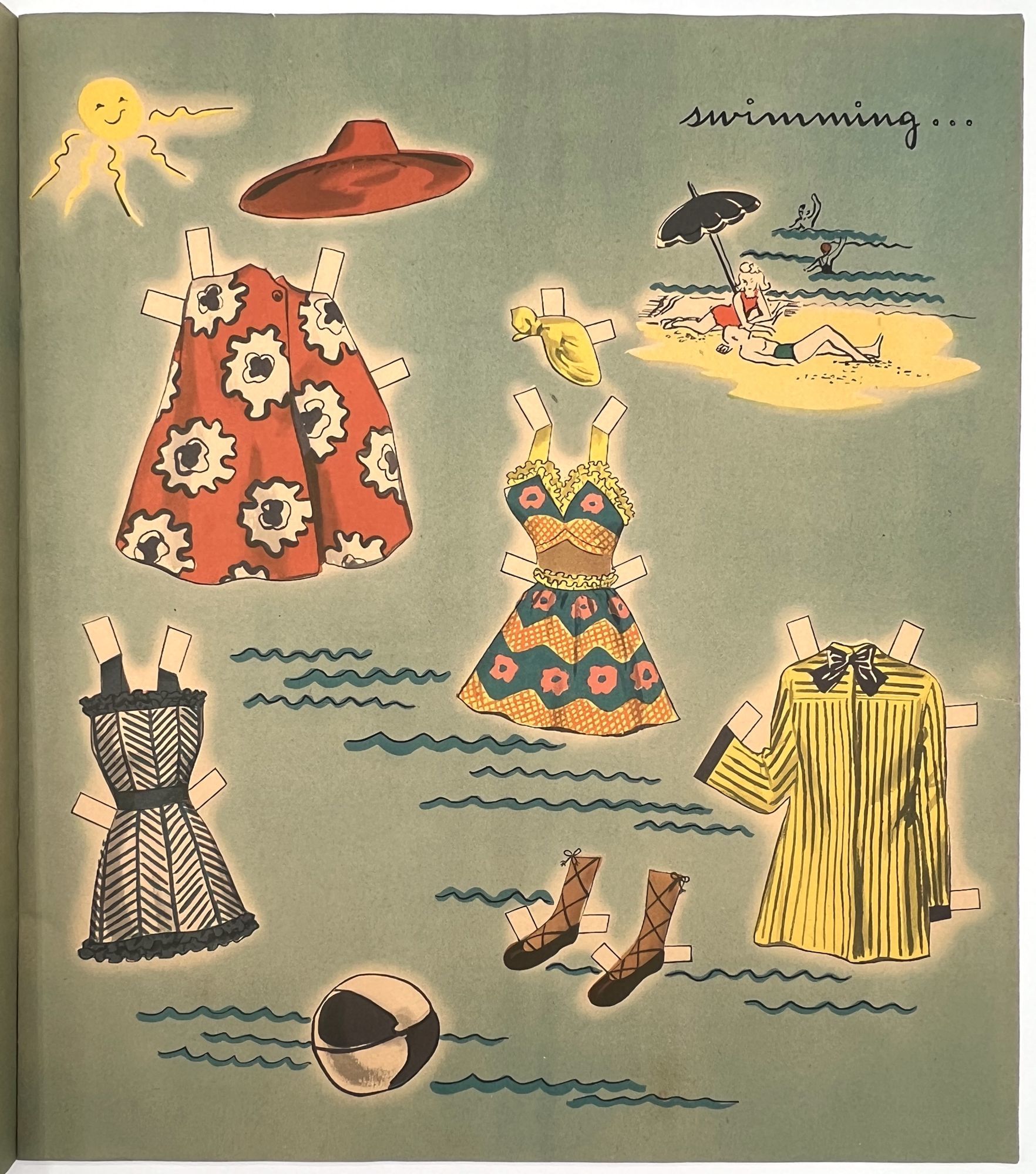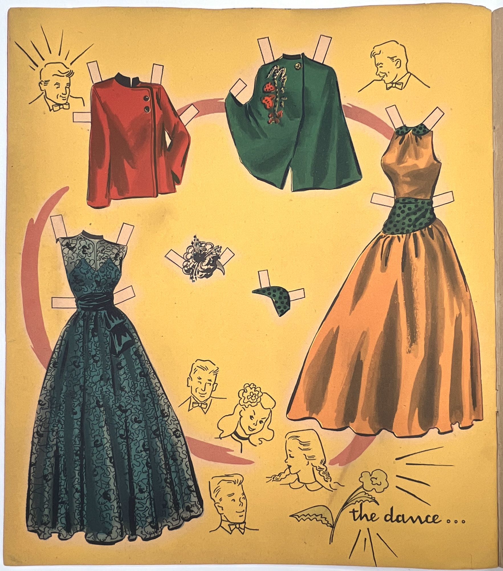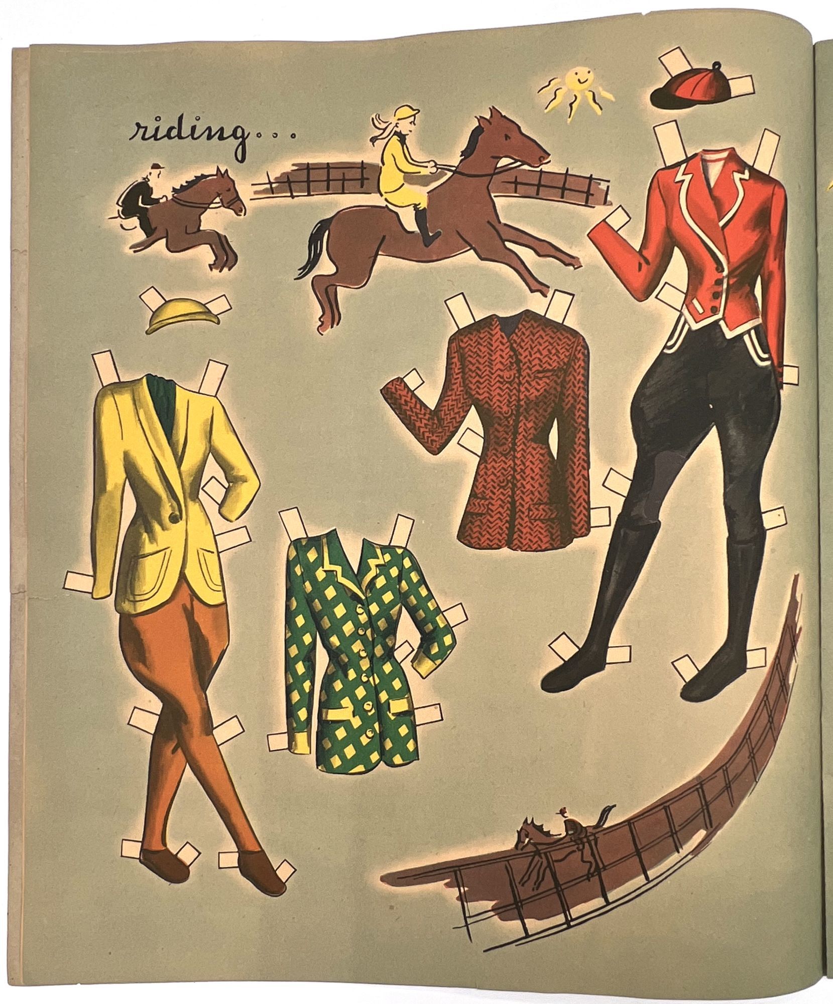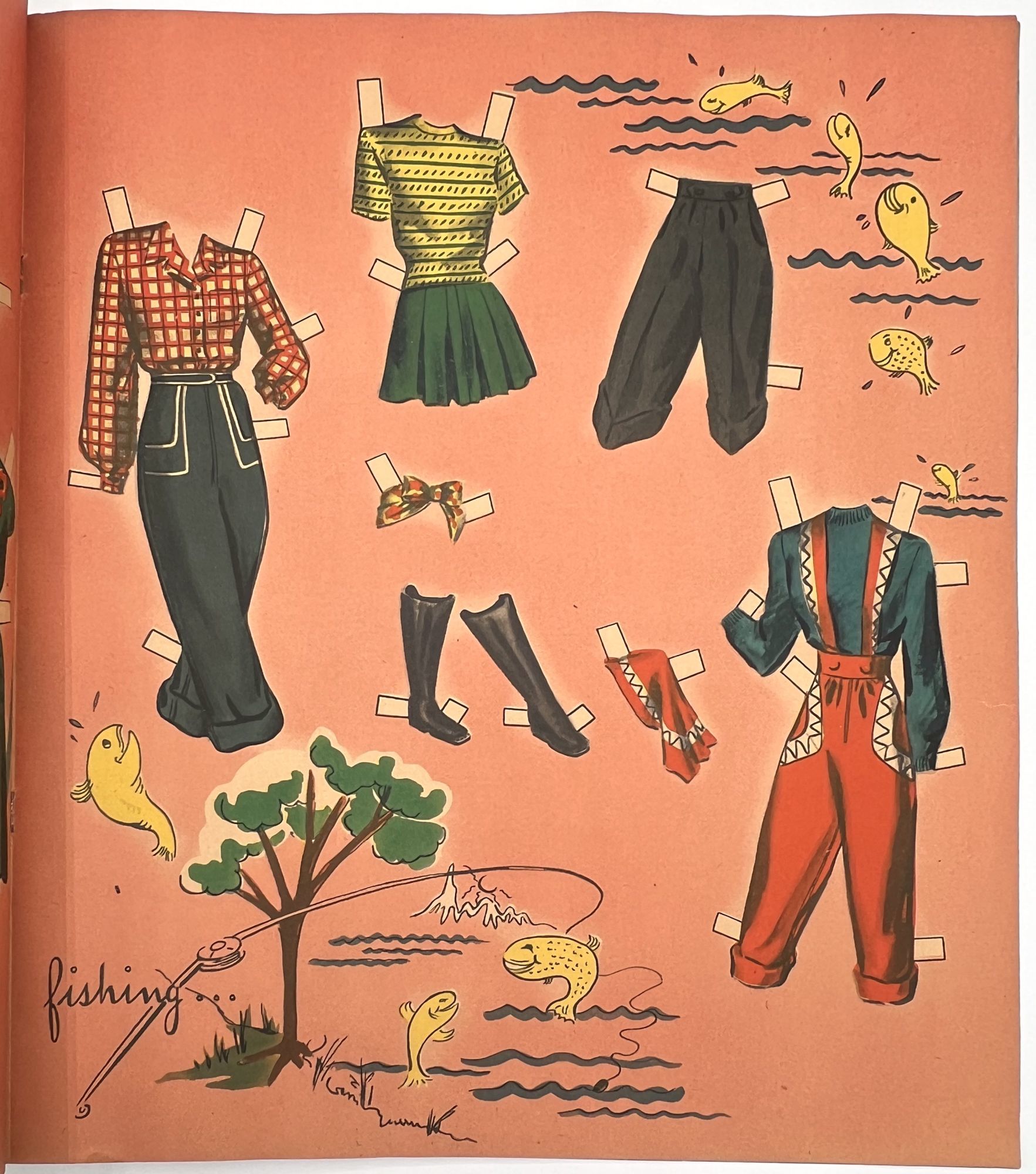 Chicago, Illinois: Children's Press, Inc, 1946. Very good. Some dust soiling, large closed short tear to right-hand edge. Water stains.. A charming 1940s uncut paper doll book with two approx. 8" paper dolls, each made from a front and back punched out from the upper and lower covers. Contains eight (8) leaves of uncut paper doll outfits for the two friends to wear while traveling on the train, while riding and swimming, on pic-nic, fishing, at dinner and on a hay ride. The final leaf has formal wear for them to wear while going to a dance with handsome young gentlemen. Each page with illustrations depicting the activity. Single vol. (13" by 10.75"). Although advertised as "Double Strong" the paper and wraps are somewhat fragile.